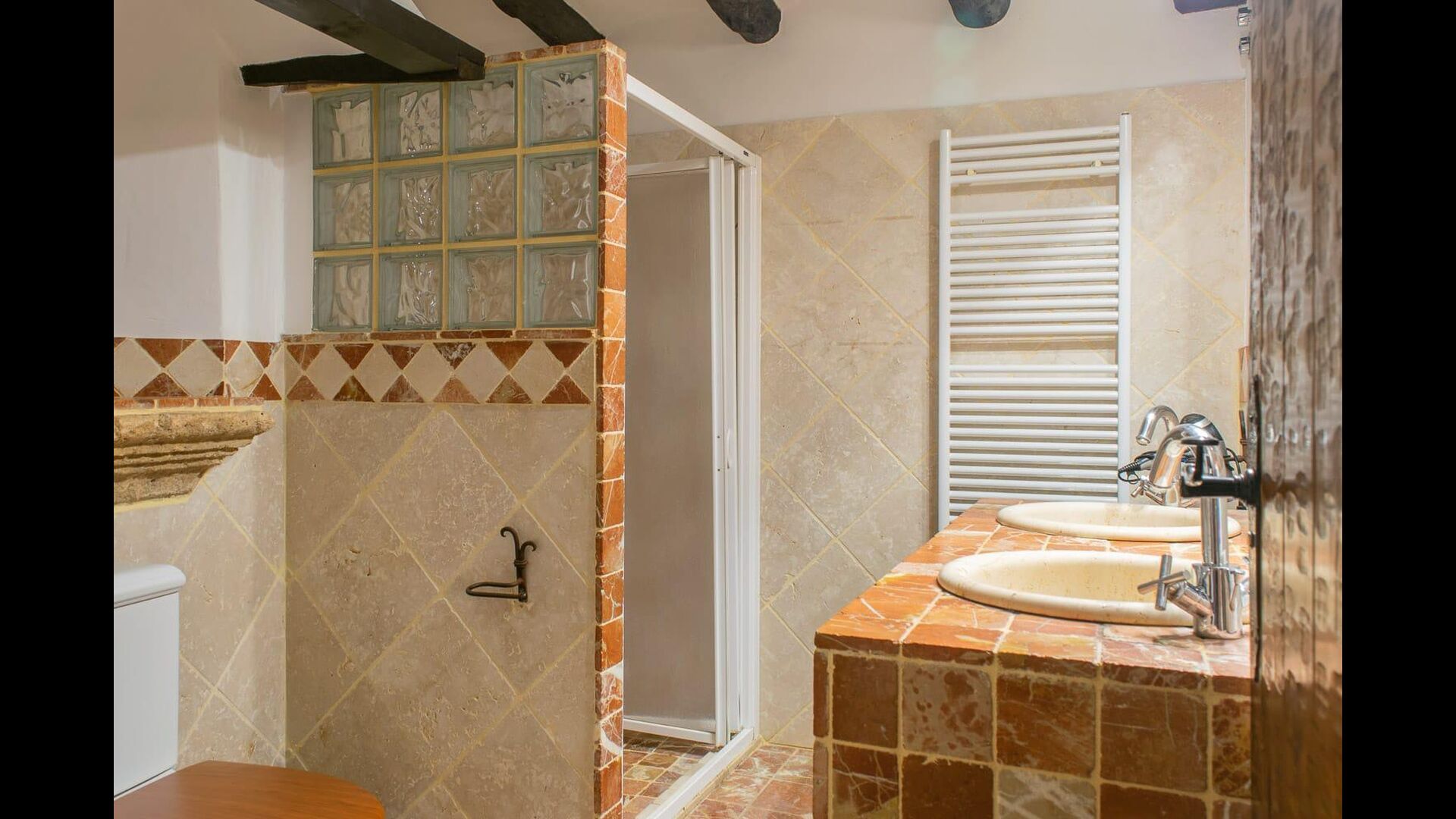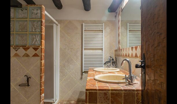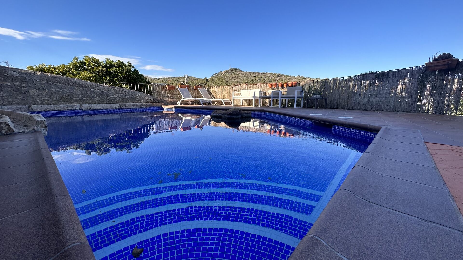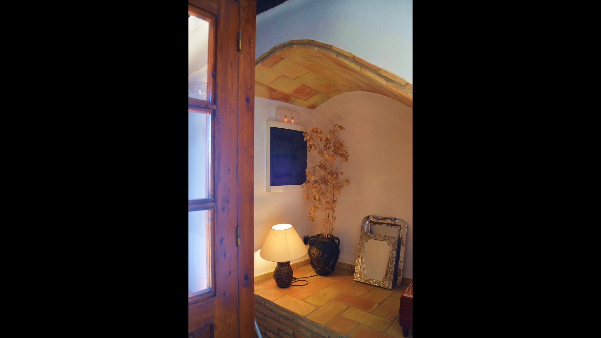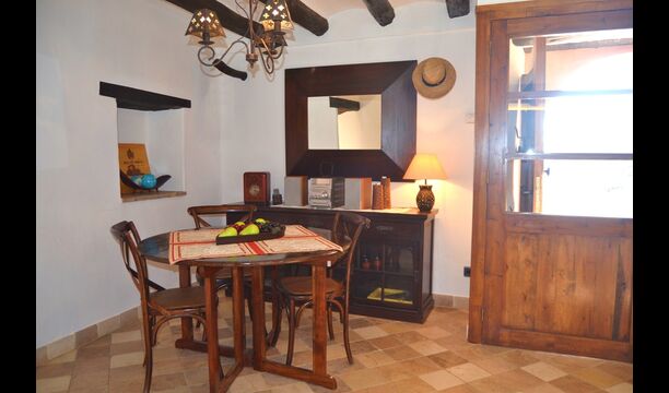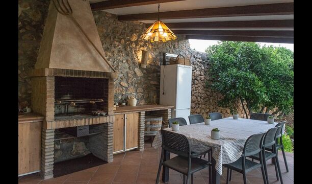 The holiday home is very authentically built with a typical rural structure and several floors. On the lower floor you will find two dining areas, one of which also functions as a common room with sofa corner and TV. The floor is made as an extension of the outdoor terrace and pool area, and here instead of the old fireplace, a gas grill has been installed, where paella and the like can be prepared. On the ground floor you will also find the well-equipped kitchen. In addition, you will also find the bathroom with two sinks and a shower. (Also extra bathroom at the lower terrace area)