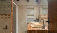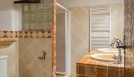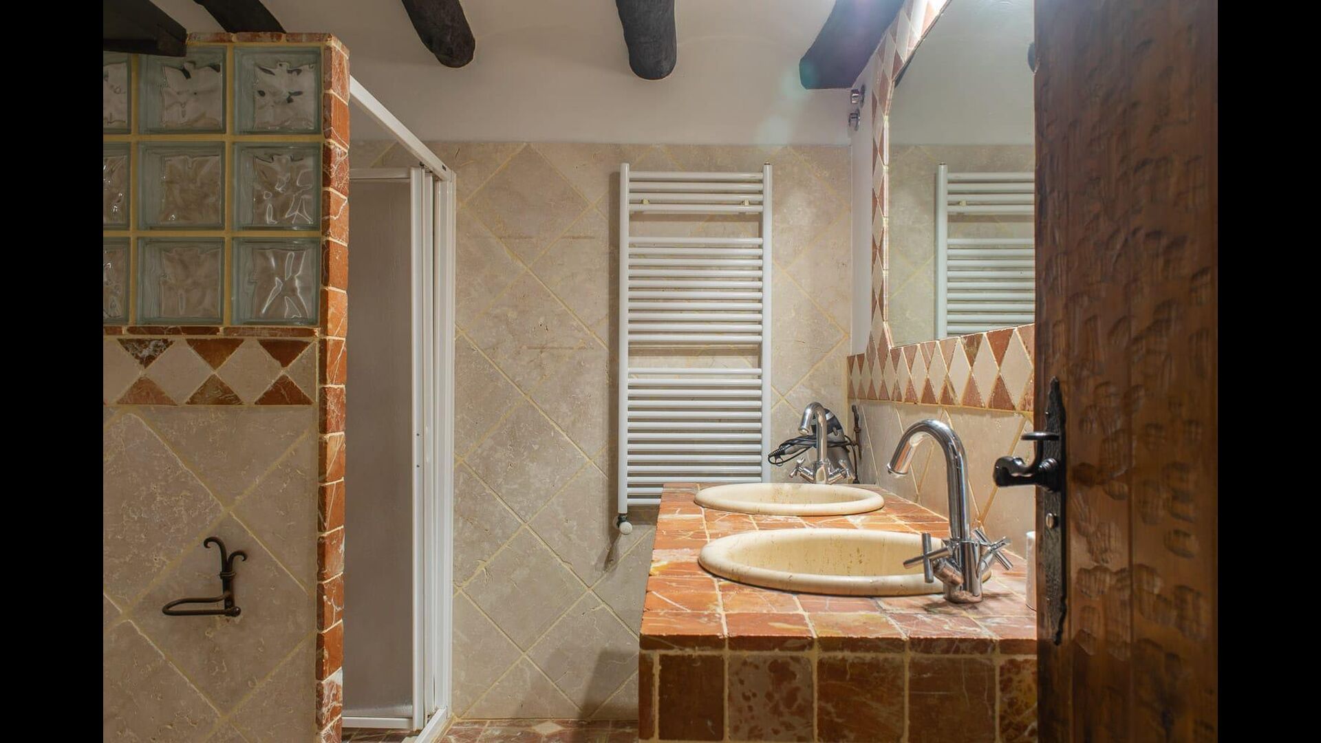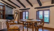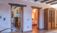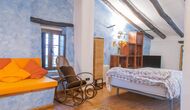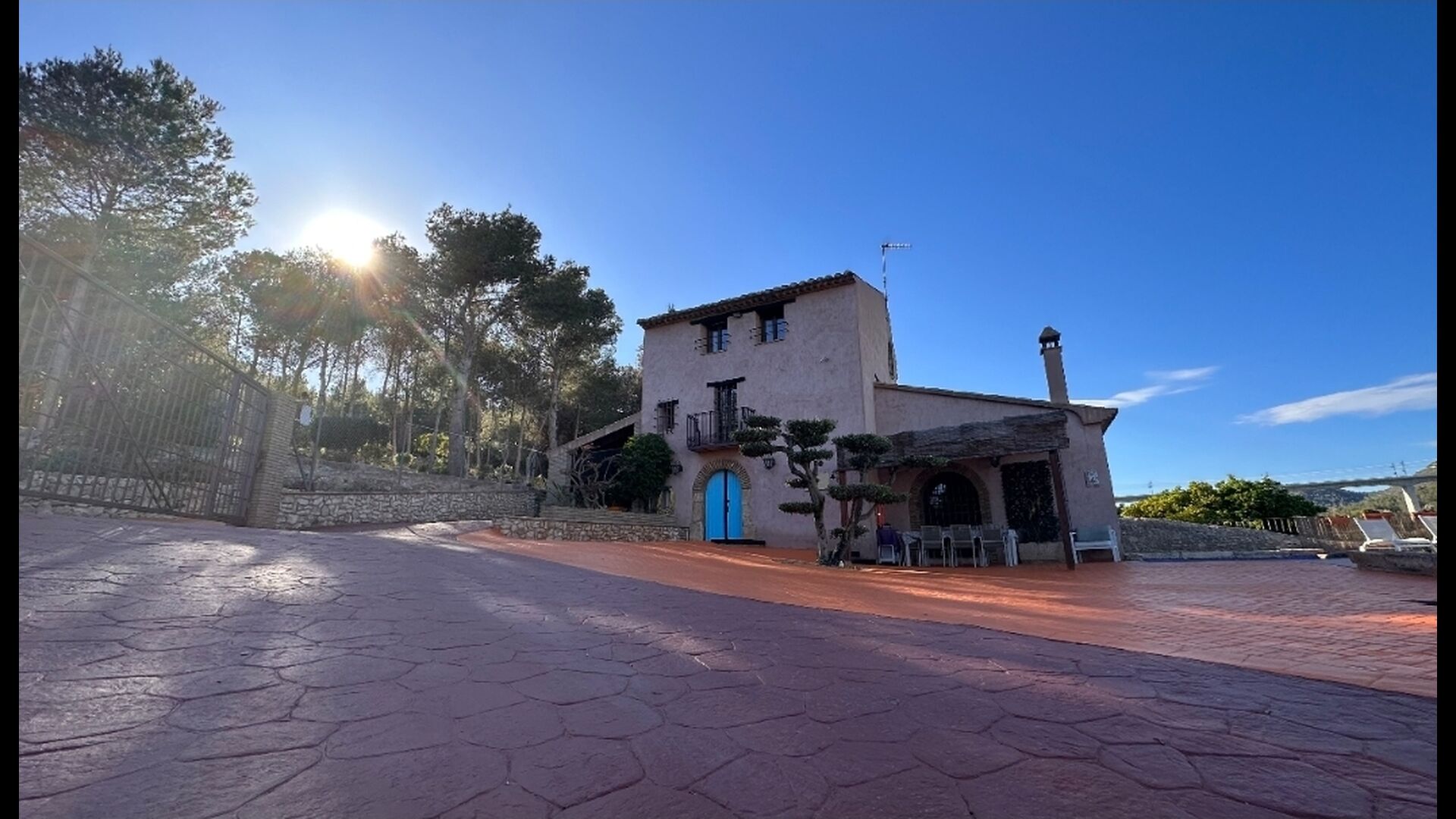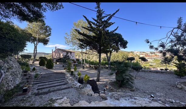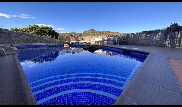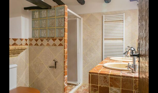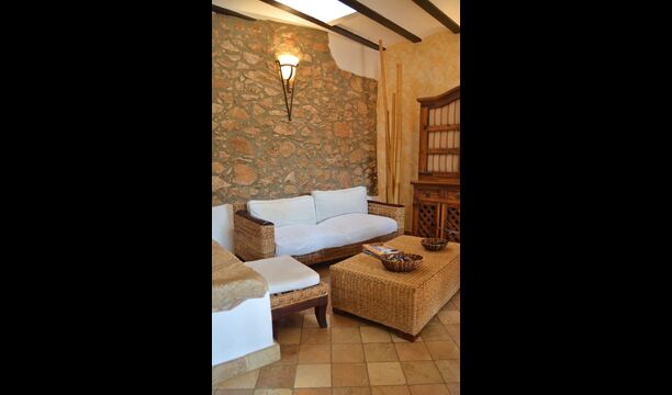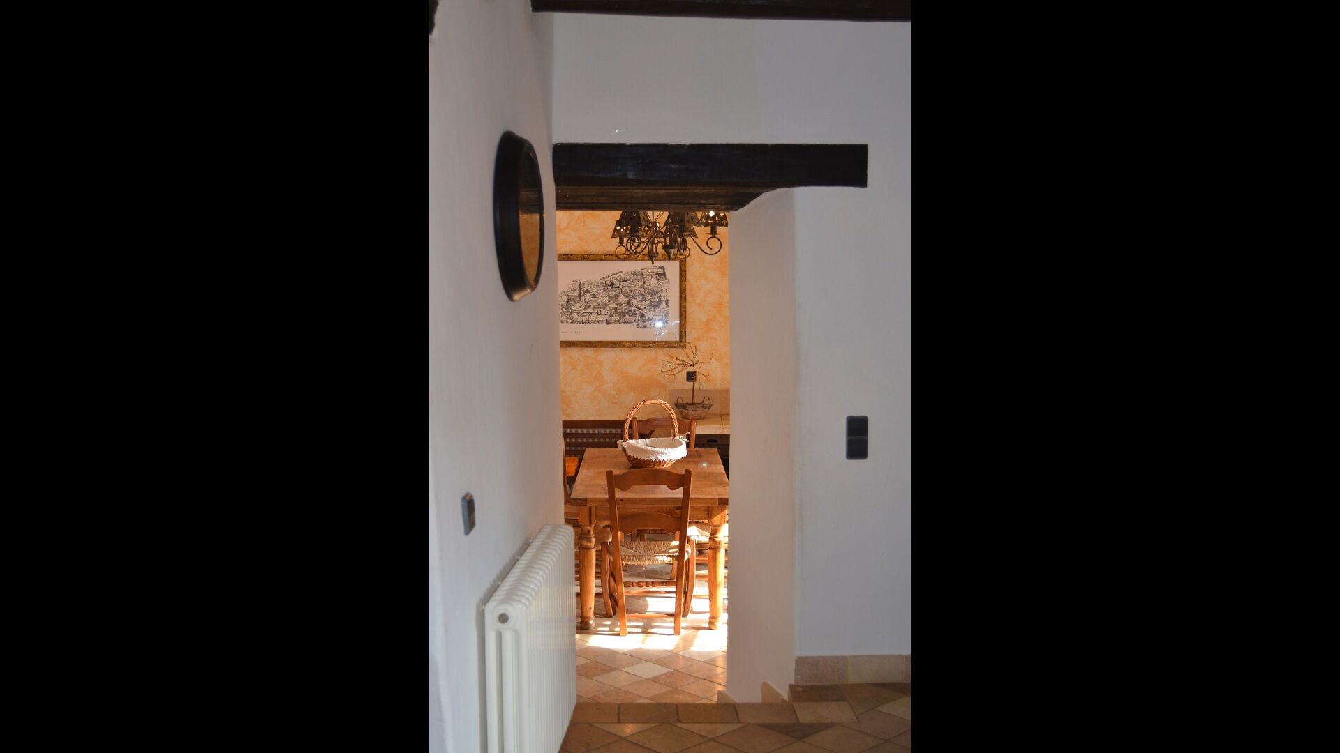 The holiday home is very authentically built with a typical rural structure and several floors. On the lower floor you will find two dining areas, one of which also functions as a common room with sofa corner and TV. The floor is made as an extension of the outdoor terrace and pool area, and here instead of the old fireplace, a gas grill has been installed, where paella and the like can be prepared. On the ground floor you will also find the well-equipped kitchen. In addition, you will also find the bathroom with two sinks and a shower. (Also extra bathroom at the lower terrace area)