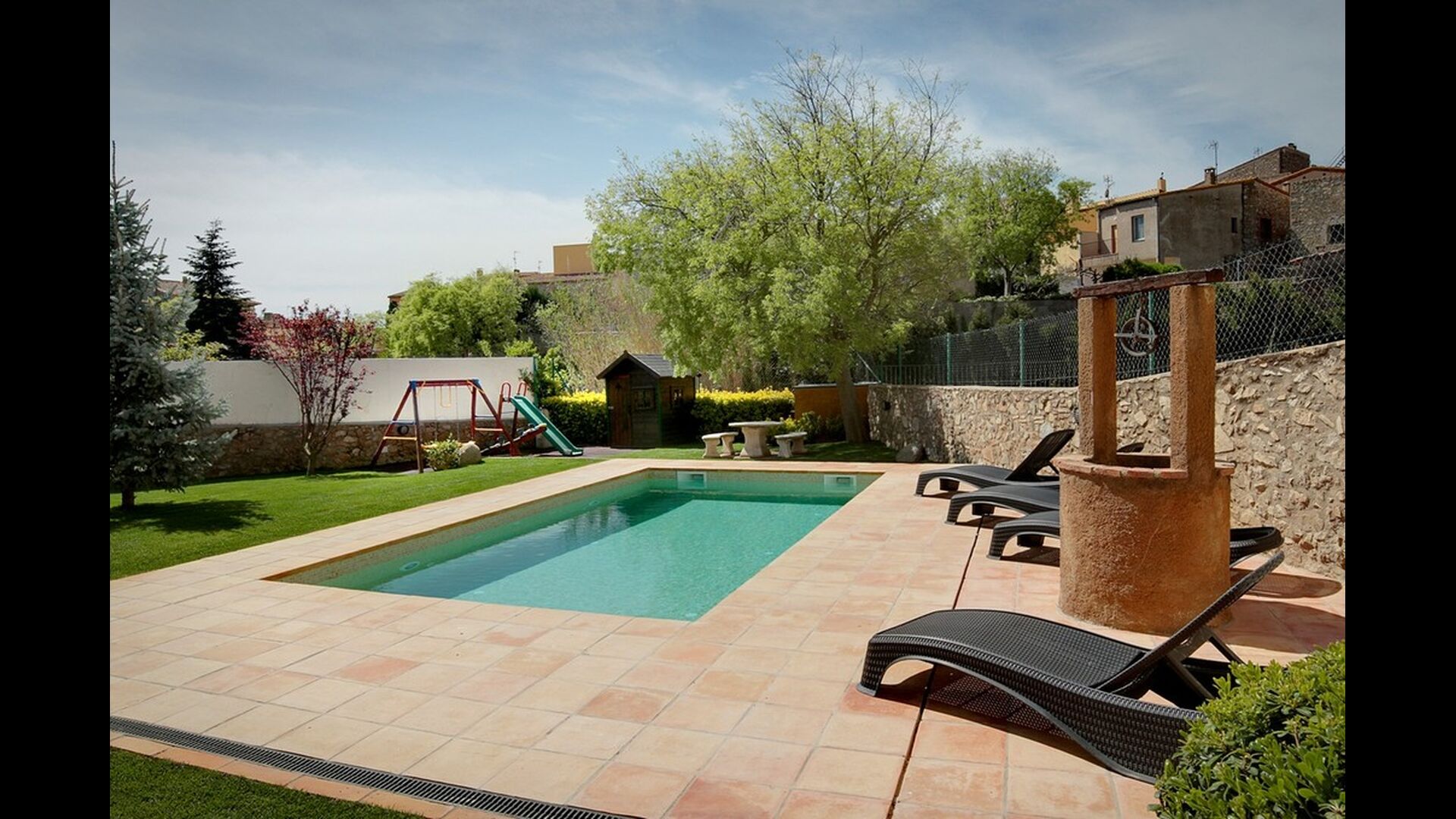 The common outdoor area consists of the swimming pool with Roman steps, sun beds, a play ground for the children, a BBQ and a outdoor dining area, where you can enjoy your dinner or a glass of local cold cava.