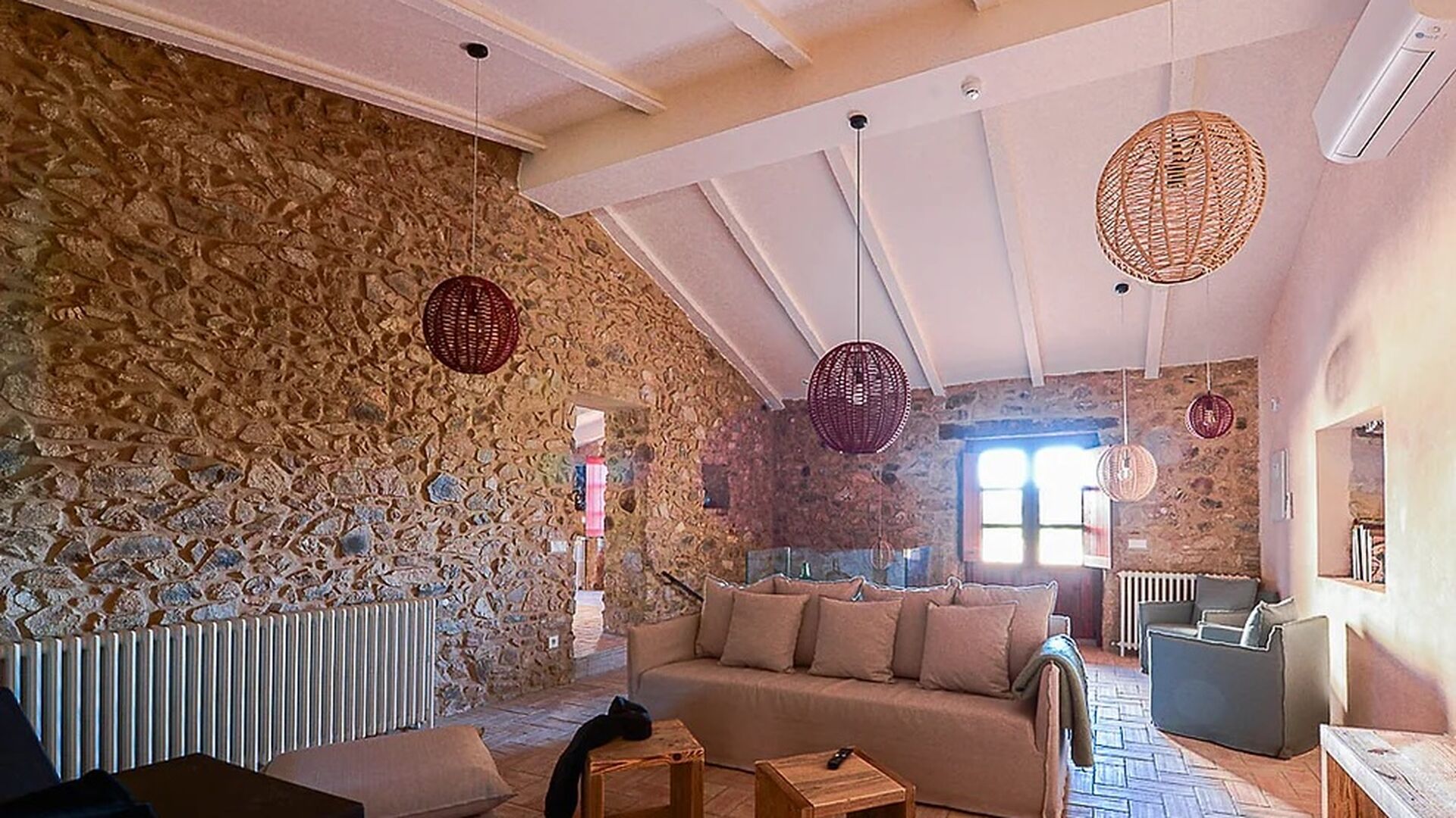 The apartment is located on the upper floor of Can Matin’s main building, and has 3 bedrooms – all coming with heating, A/C, and ensuite bathrooms. The room La Carinyena comes with 1 double bed and 1 single bed. The two other rooms – Garnatxa and Muscat – each come with one double bed (which can made into 2 single beds) and 1 sofa bed. Muscat has direct access to the Migjorn’s terrace on the second floor. Garnaxta is facing west, and also has a small table with chairs, a TV, and a small sofa. The windows provide a great view out over the property and the landscapes beyond.