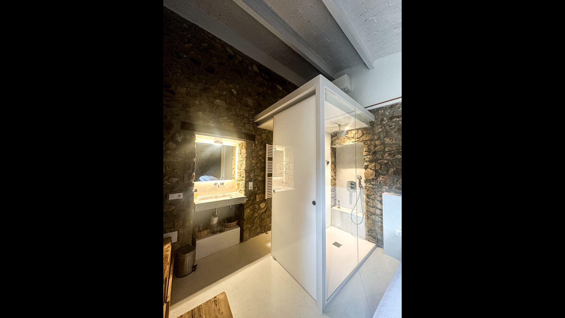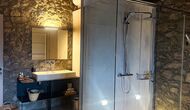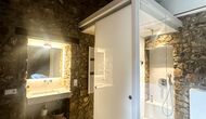 The apartment is 80m2 and is accessible from the garden’s level. You will find a large living room area, with its walls – as with the rest of the apartment – covered in a rustic, charming rock pattern, making you feel immersed in the house’s long, rustic legacy…but still filled with modern utilities and an interior design style that manages to ease you in effortlessly, perfectly blending old and new.