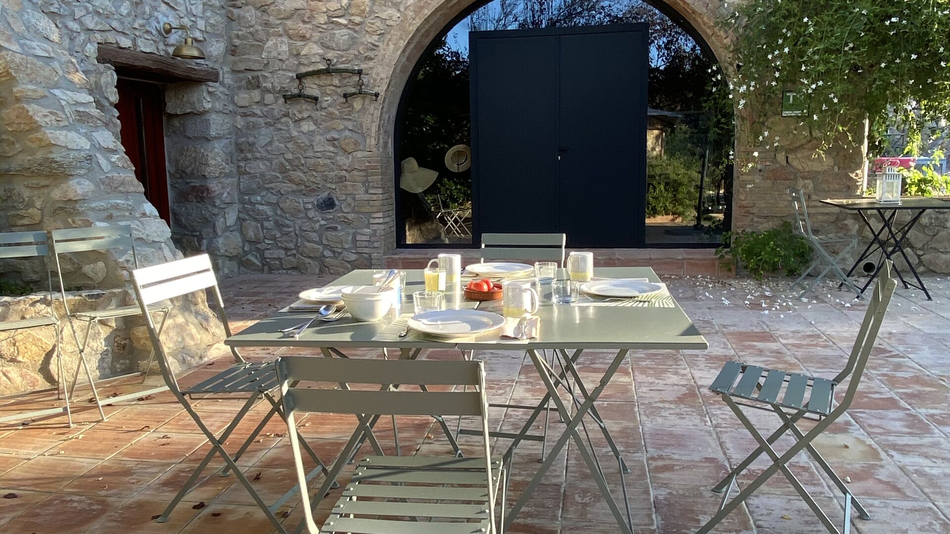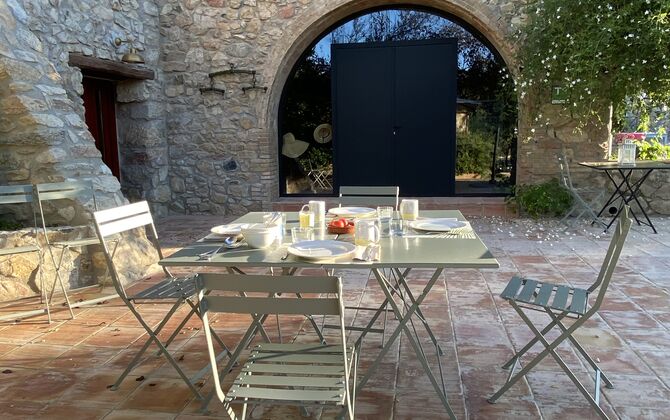 In front of the entrance door of the house, in the garden, there is an exclusive-use space with a table and chairs -ideal for outdoor meals- a parasol and sun loungers; and a few meters away, in very large shared spaces, more than one porch, a solarium with sun loungers, terraces, two mobile and two fixed BBQs, the swimming pool and the jacuzzi. It is very easy to find the privacy and comfort you want. The Mas can offer breakfast and kitchen service.