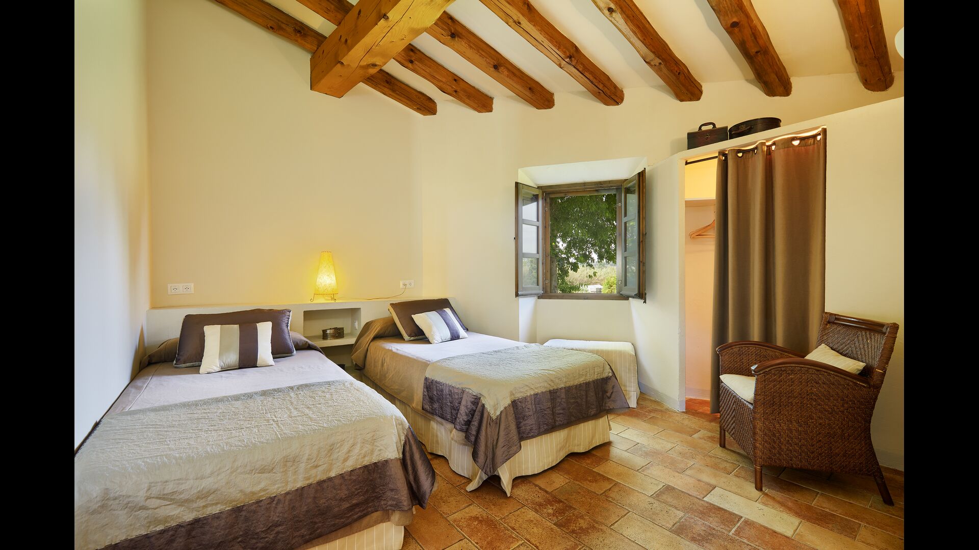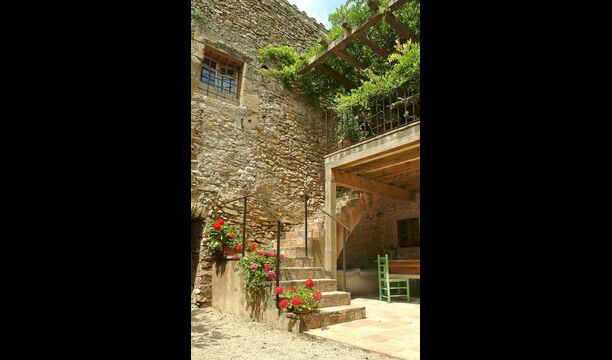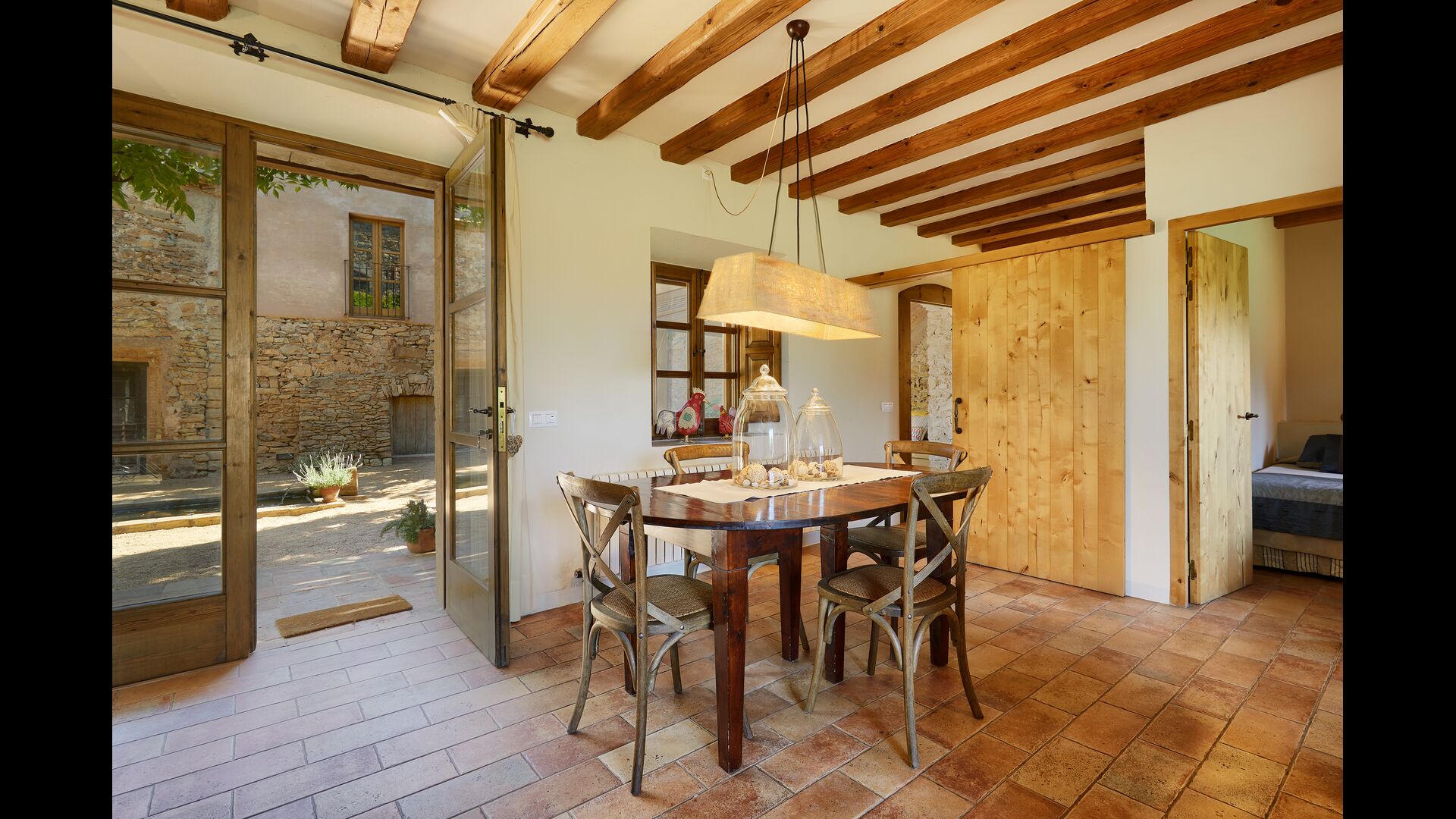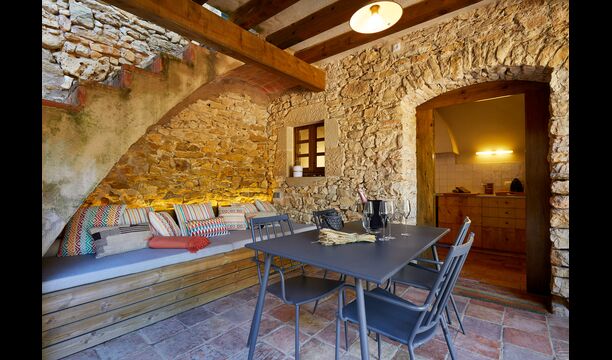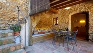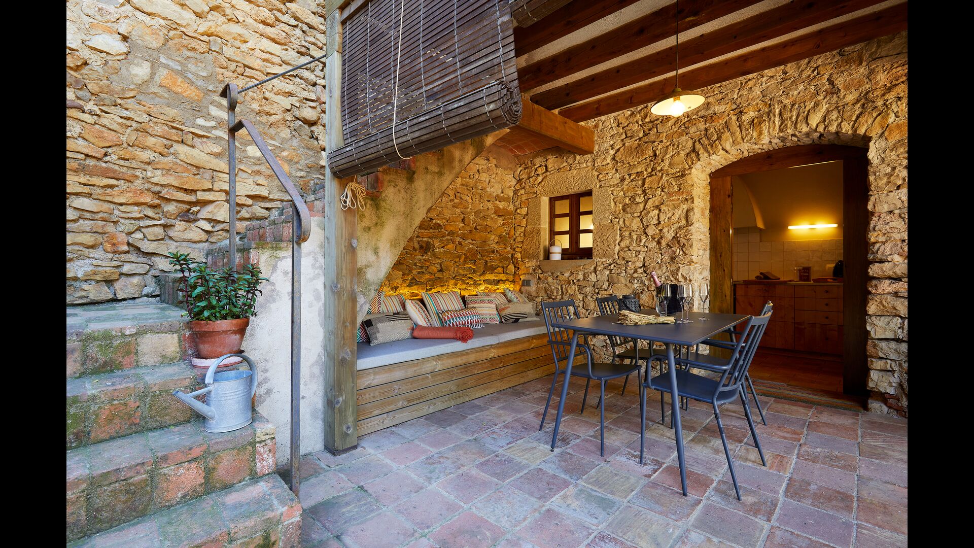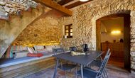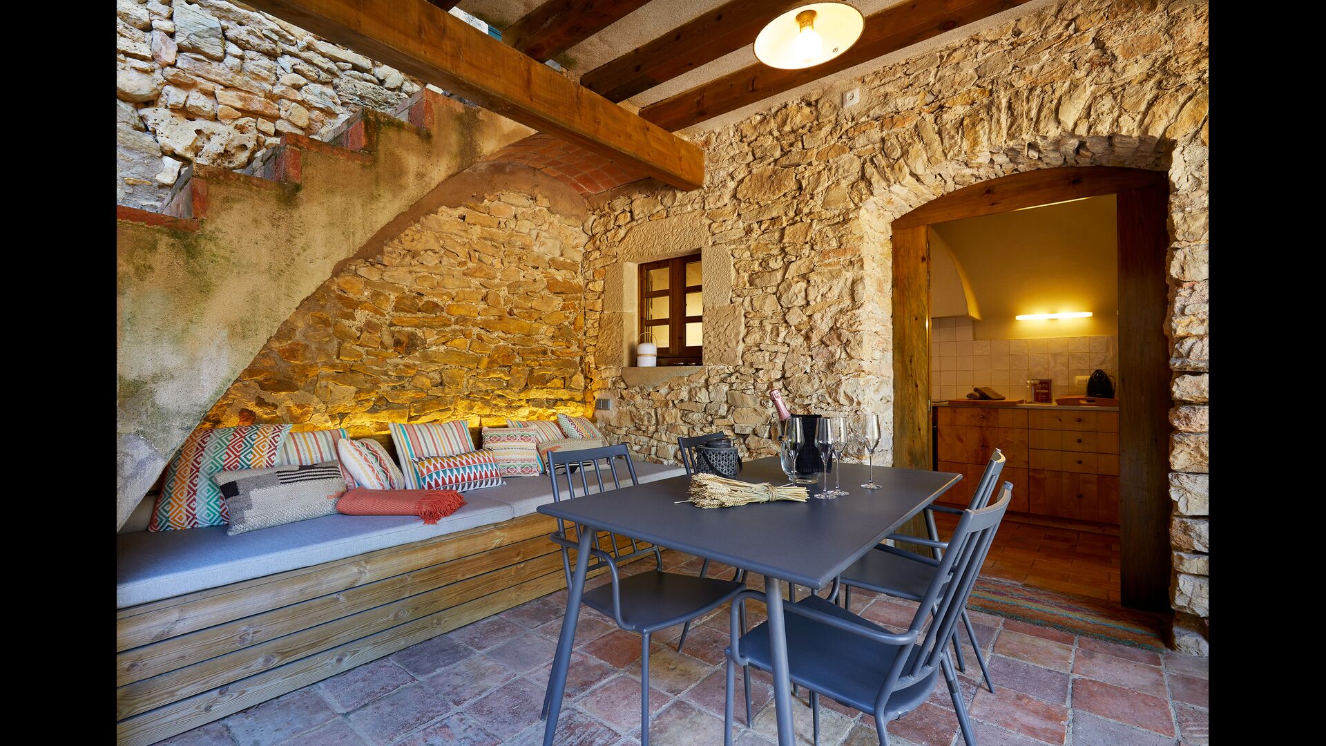 This first floor apartment is located on the lower right side of the large courtyard you are met by after the large wooden gate. The courtyard and the houses are built of stone, which gives a rustic and authentic atmosphere. This apartment has a cosy covered patio in the courtyard, where it is obvious to enjoy the homemade meals during the warm Catalan evenings. In the daytime, it is also a perfect place to relax, as there is a cooling shade.
