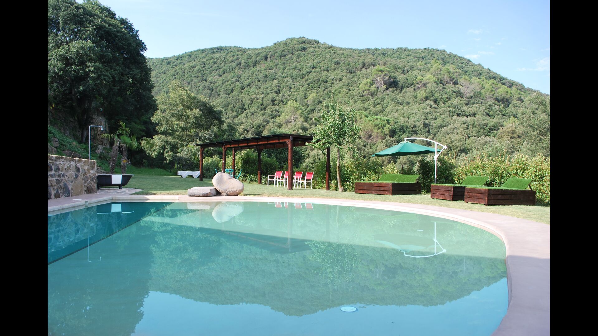 Outside you will find a porch, the large, wonderful garden, swimming pool, barbeque, a gorgeous tree with shade, and much more. The pool, like the rest of the house, is well designed in a very modern taste and it is perfect for children as it is beach-inspired. A few minutes walk from the house, there even is a river with a gorgeous natural waterfall where you can take a dip!