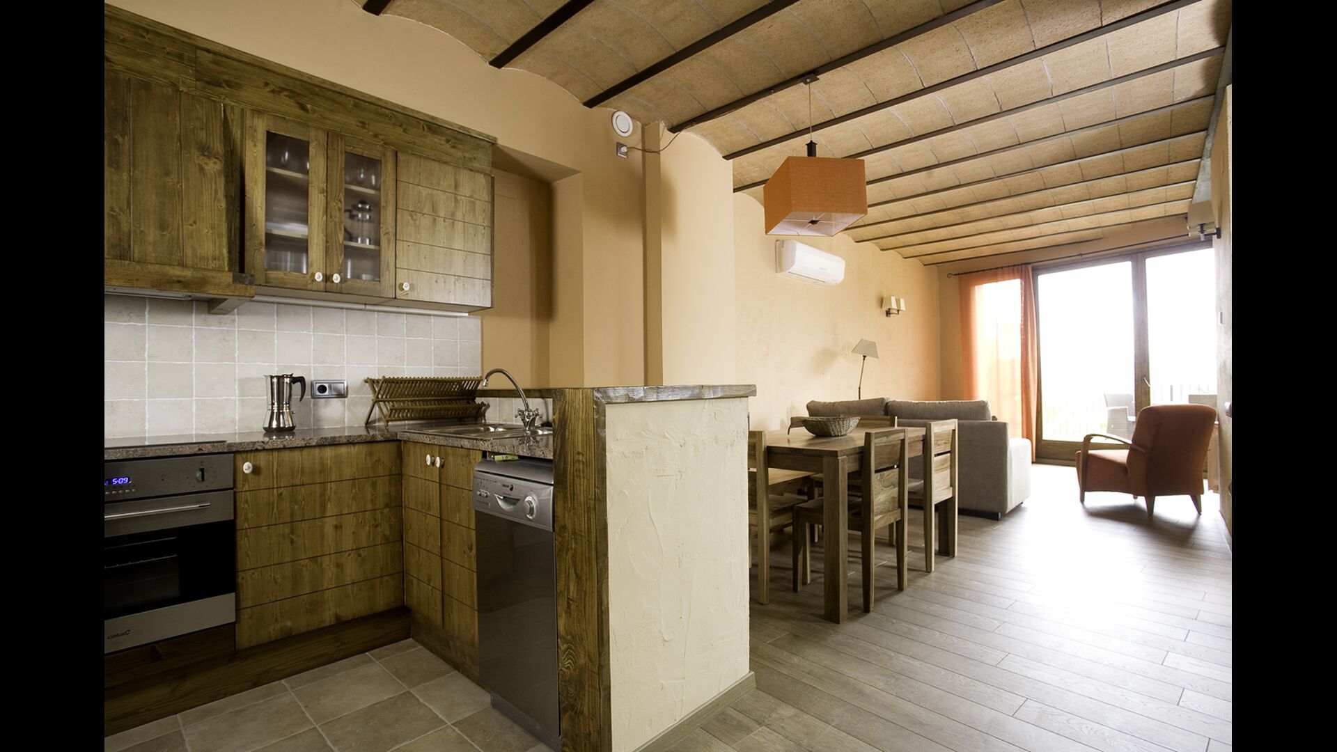 Then in 2010, they converted building where they used to have the bakery into four high standard apartments (Llucanés 4P, Margarita 4P, Font Nova 5P and Els Munts 7P) and made a beautiful café/bakery in the ground floor facing the village street. These four apartments situated on 1. and 2. floor can be accessed by elevator, making them very suitable for elderly people and people with reduced mobility. In addition, the elevator makes it very convenient to get the suitcases to your apartment.