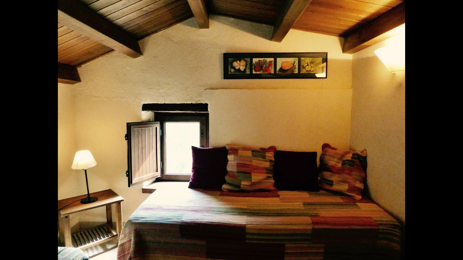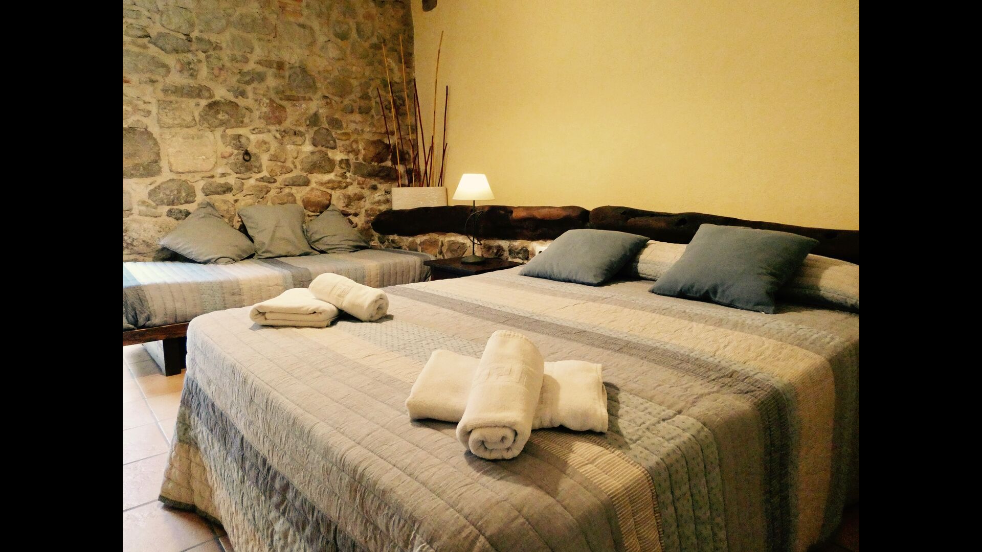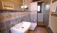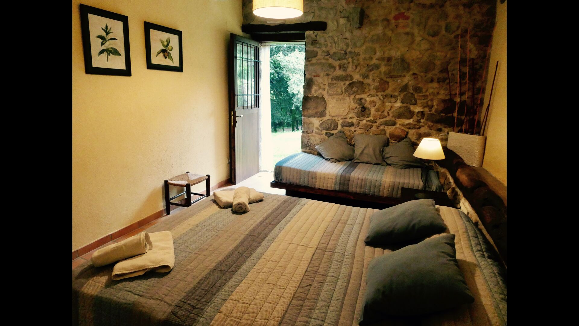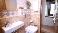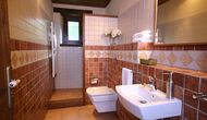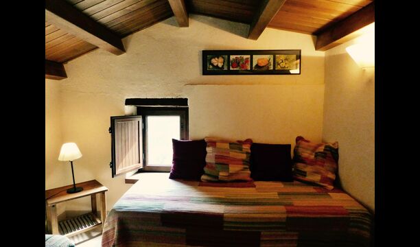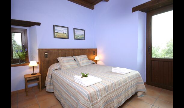 In Can Bosquita - Gran there is a total of 6 bedrooms, of which 2 are triple rooms and 4 are double rooms, as well as 4 bathrooms. The house has entrance level with the parking lot. As the house is located on a slope, the house has several levels, which is very charming. A few steps up are the first three bedrooms, all very spacious. They are equipped with single beds, which can be set up as double beds if preferred. One of the rooms has its own exit to the garden. These three bedrooms share two bathrooms, all fully equipped and also with showers. Further up there are 3 extra bedrooms, one of which is smaller than the others in "loft style".