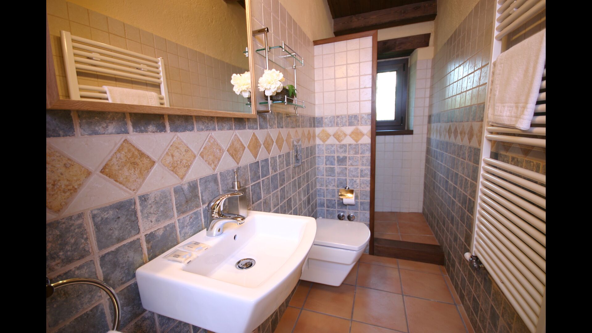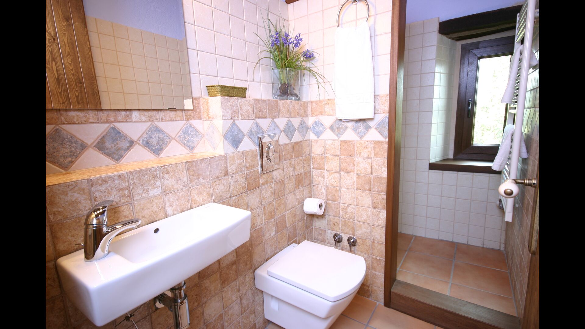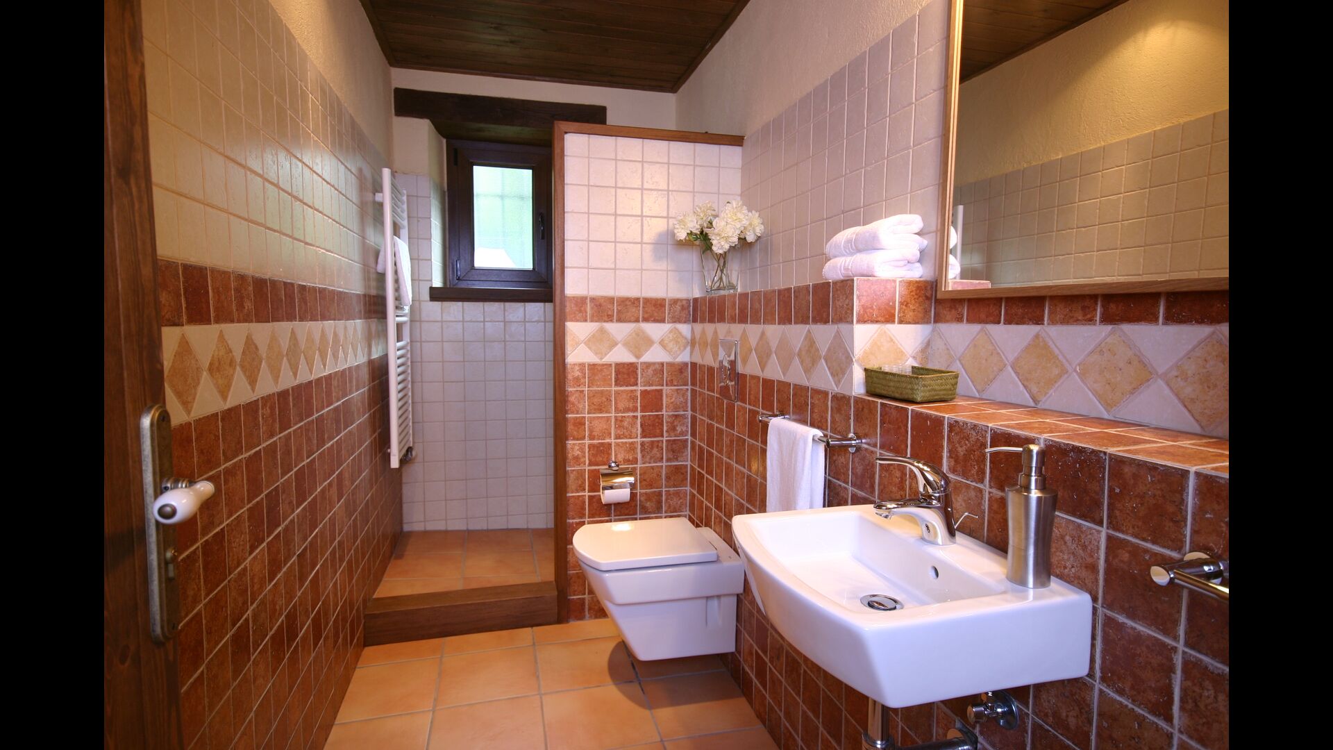 In Can Bosquita - Gran there is a total of 6 bedrooms, of which 2 are triple rooms and 4 are double rooms, as well as 4 bathrooms. The house has entrance level with the parking lot. As the house is located on a slope, the house has several levels, which is very charming. A few steps up are the first three bedrooms, all very spacious. They are equipped with single beds, which can be set up as double beds if preferred. One of the rooms has its own exit to the garden. These three bedrooms share two bathrooms, all fully equipped and also with showers. Further up there are 3 extra bedrooms, one of which is smaller than the others in "loft style".