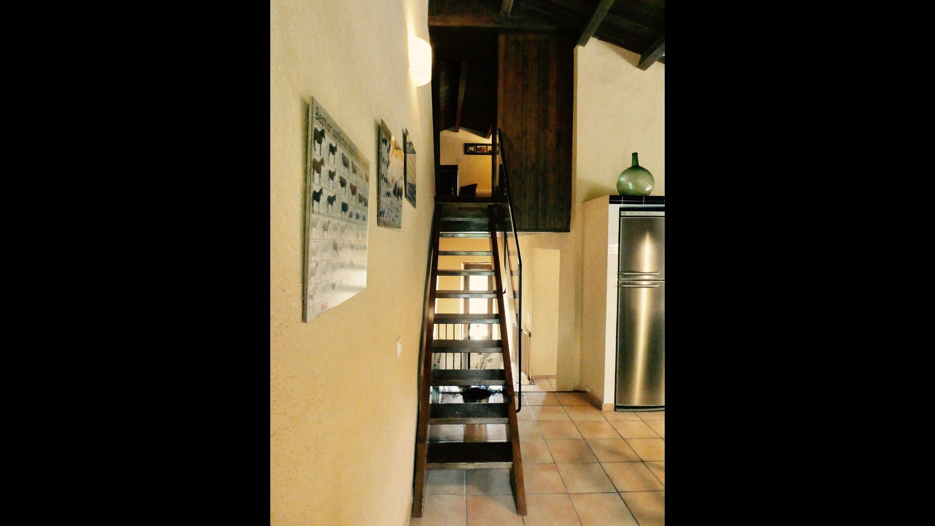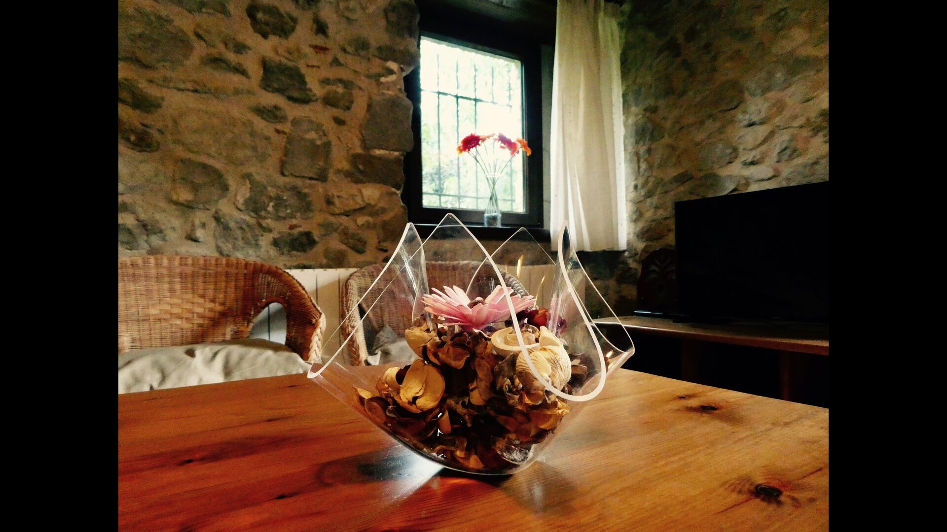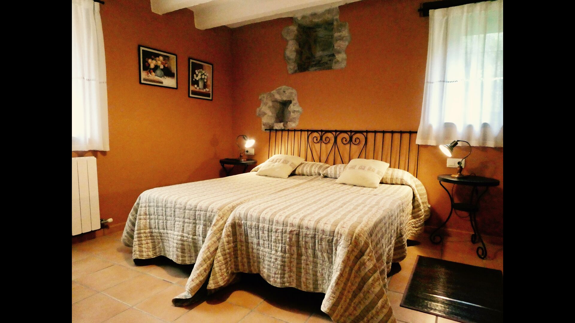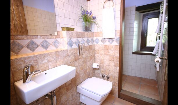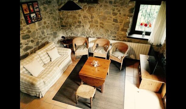 There is a fantastic kitchen where the original sink and fireplace have been integrated with all modern equipment of high standard, such as microwave, large stove with 5 hotplates (gas) and plenty of work space so cooking can be done together, perhaps accompanied by a glass wine or cava.