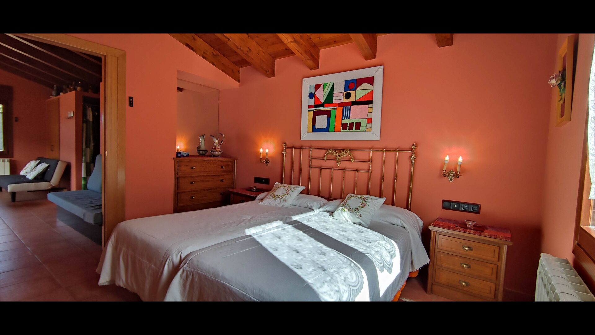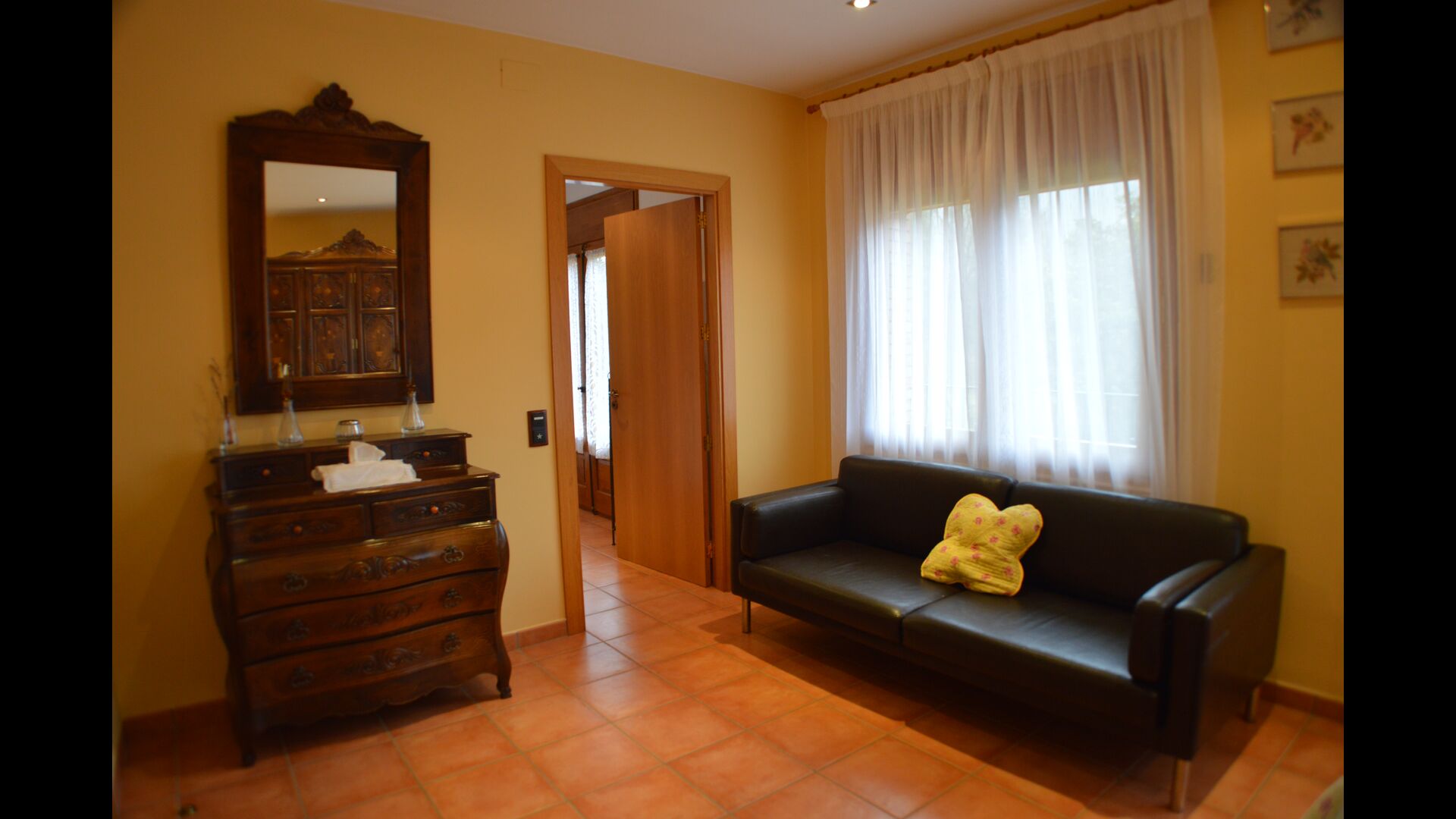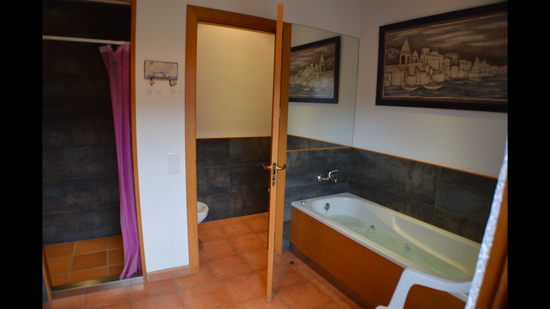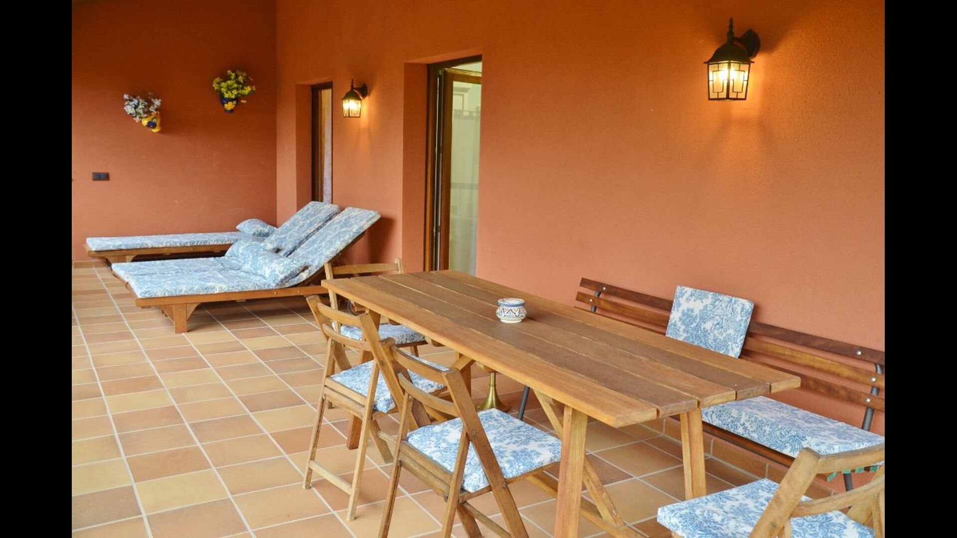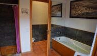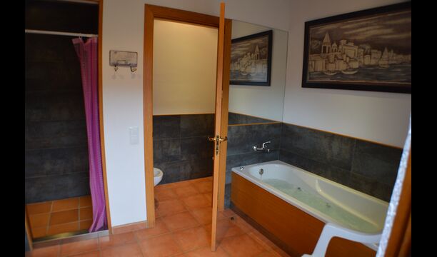 Most of the bedrooms are situated on the first floor . Here are four spacious double rooms and two bathrooms, of which one has as well shower as a bathtub with spa. This bathroom has exit to a large terrace with sitting arrangement and loungers. – there is of course also entry to this terrace from a bedroom.