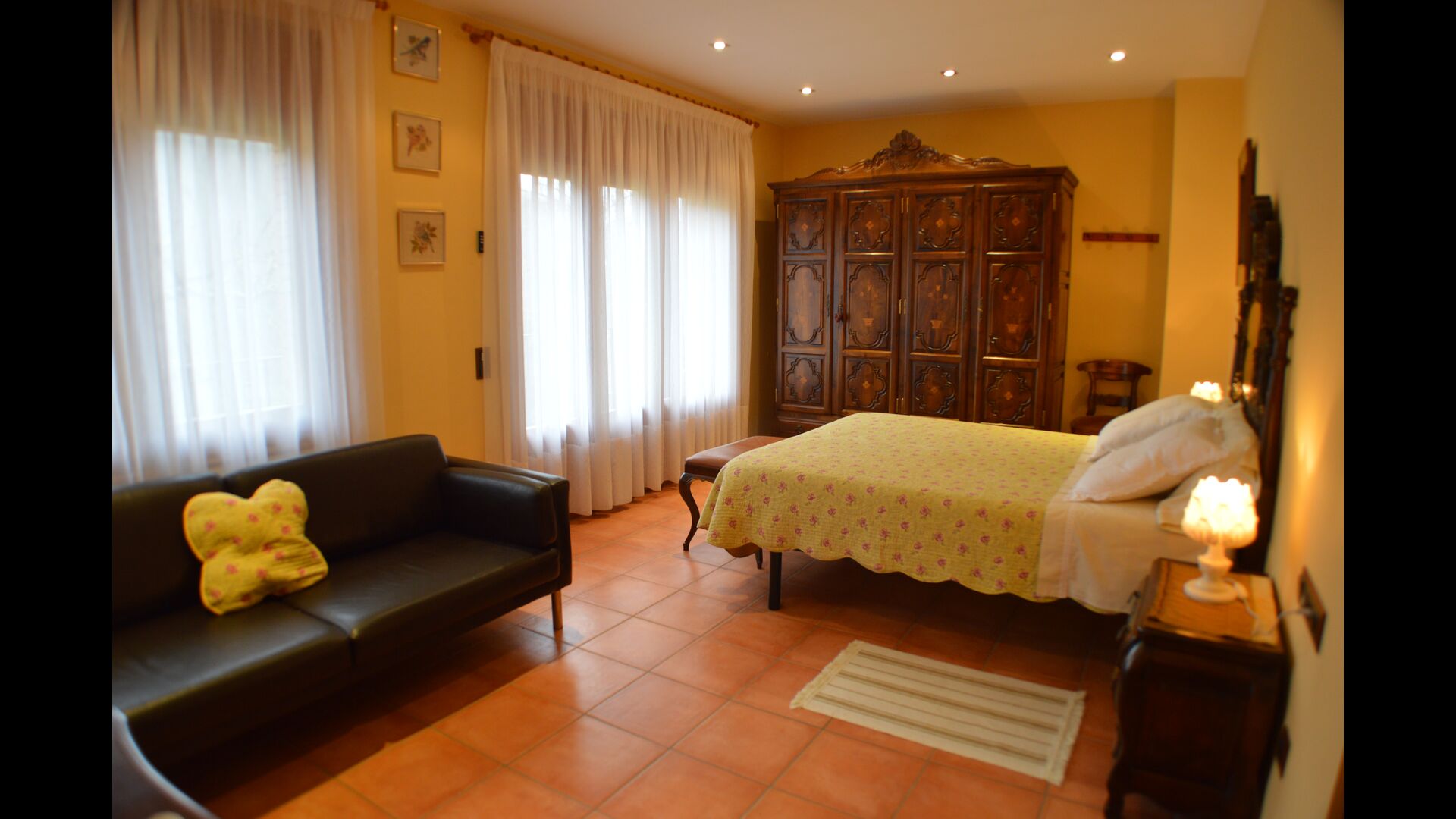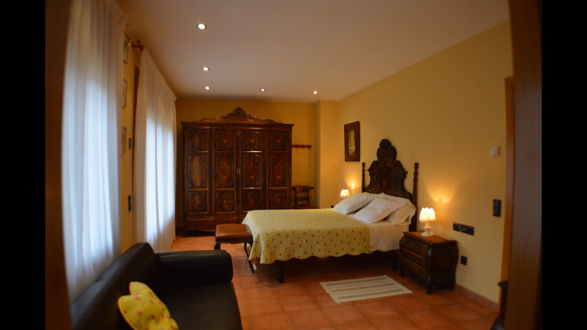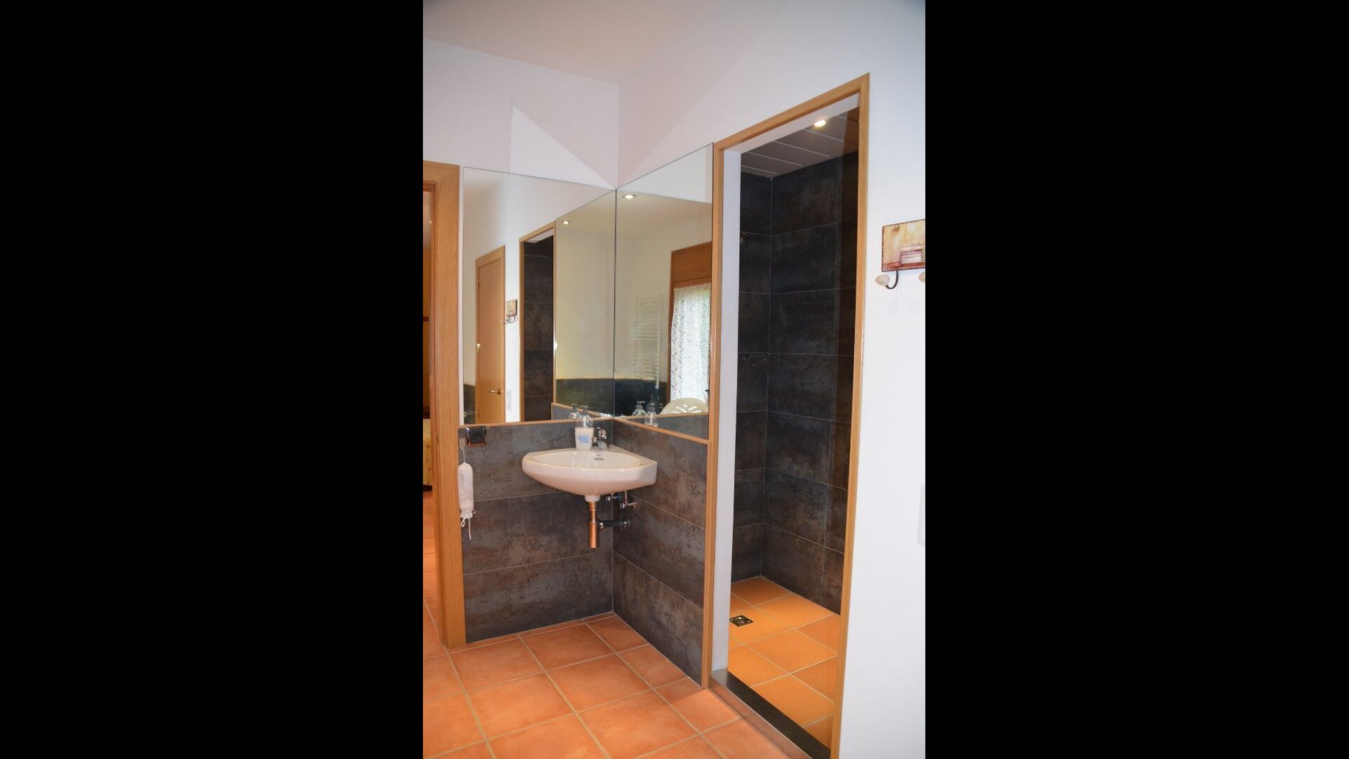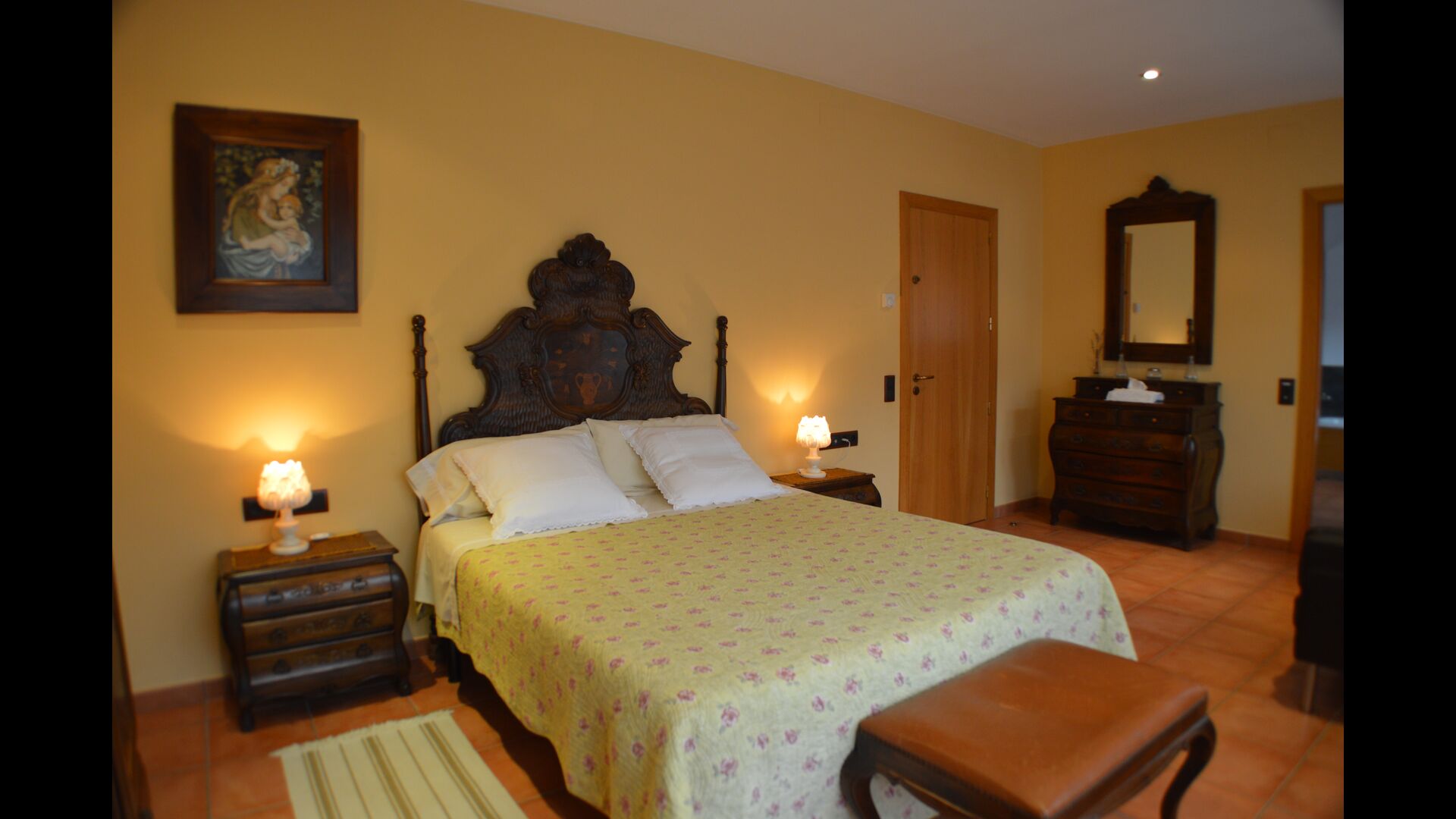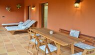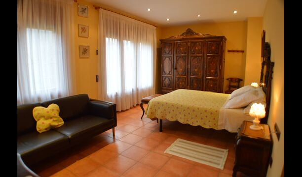 Most of the bedrooms are situated on the first floor . Here are four spacious double rooms and two bathrooms, of which one has as well shower as a bathtub with spa. This bathroom has exit to a large terrace with sitting arrangement and loungers. – there is of course also entry to this terrace from a bedroom.