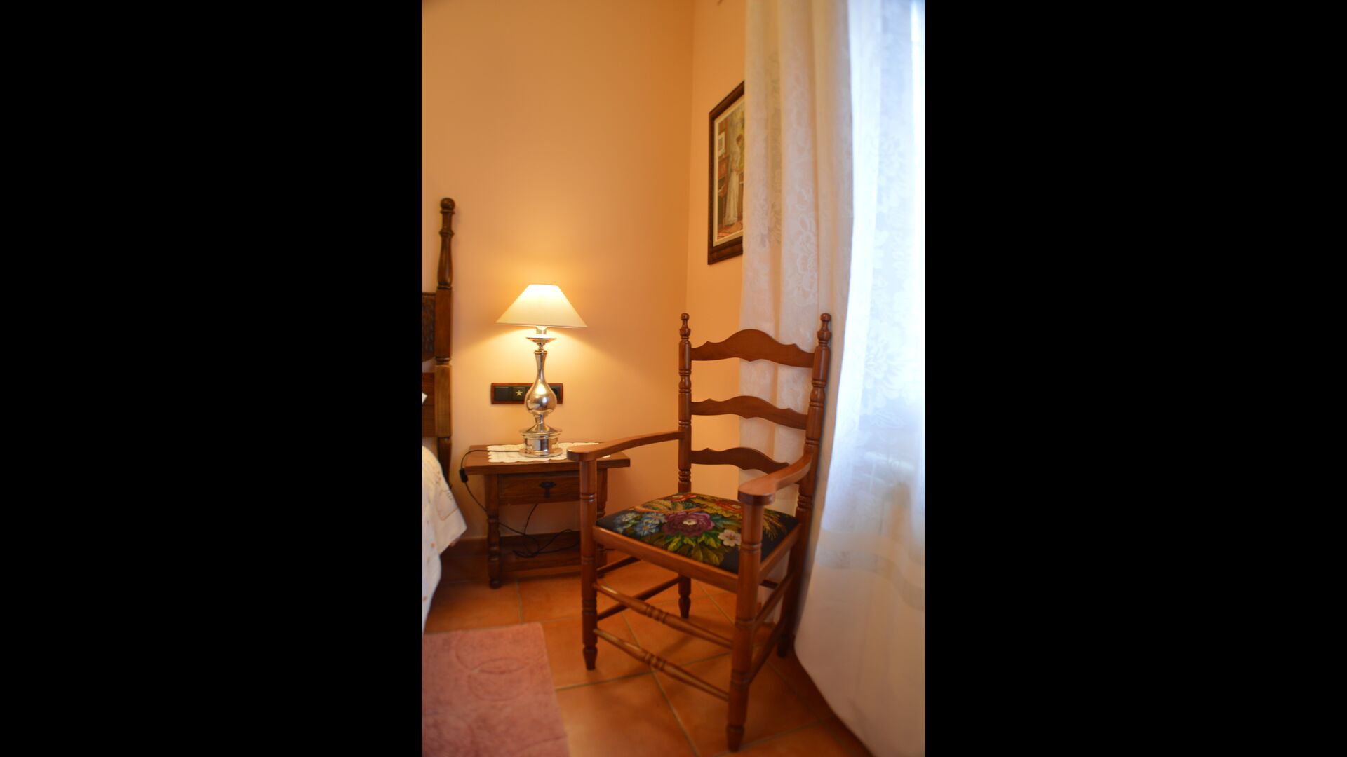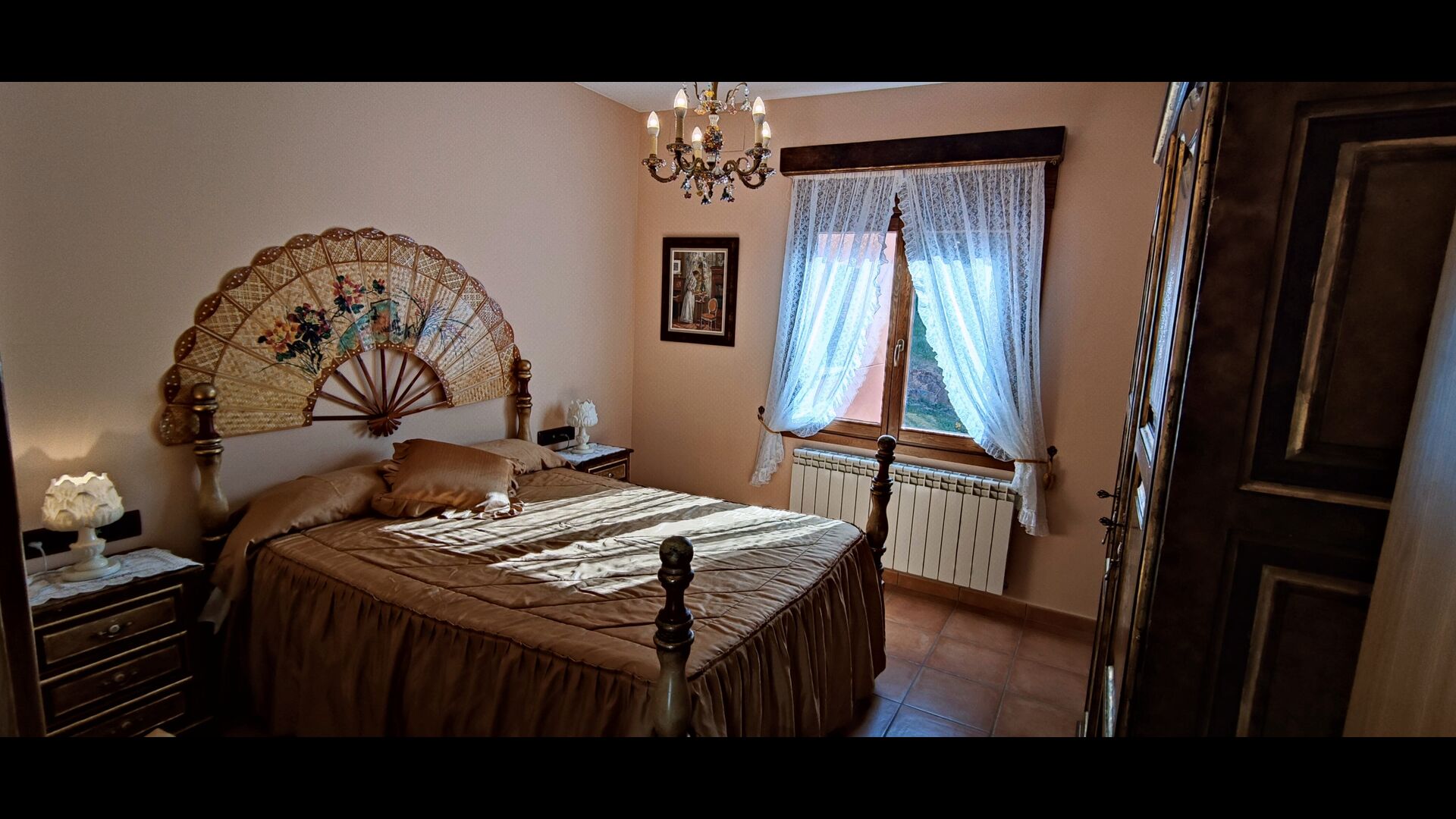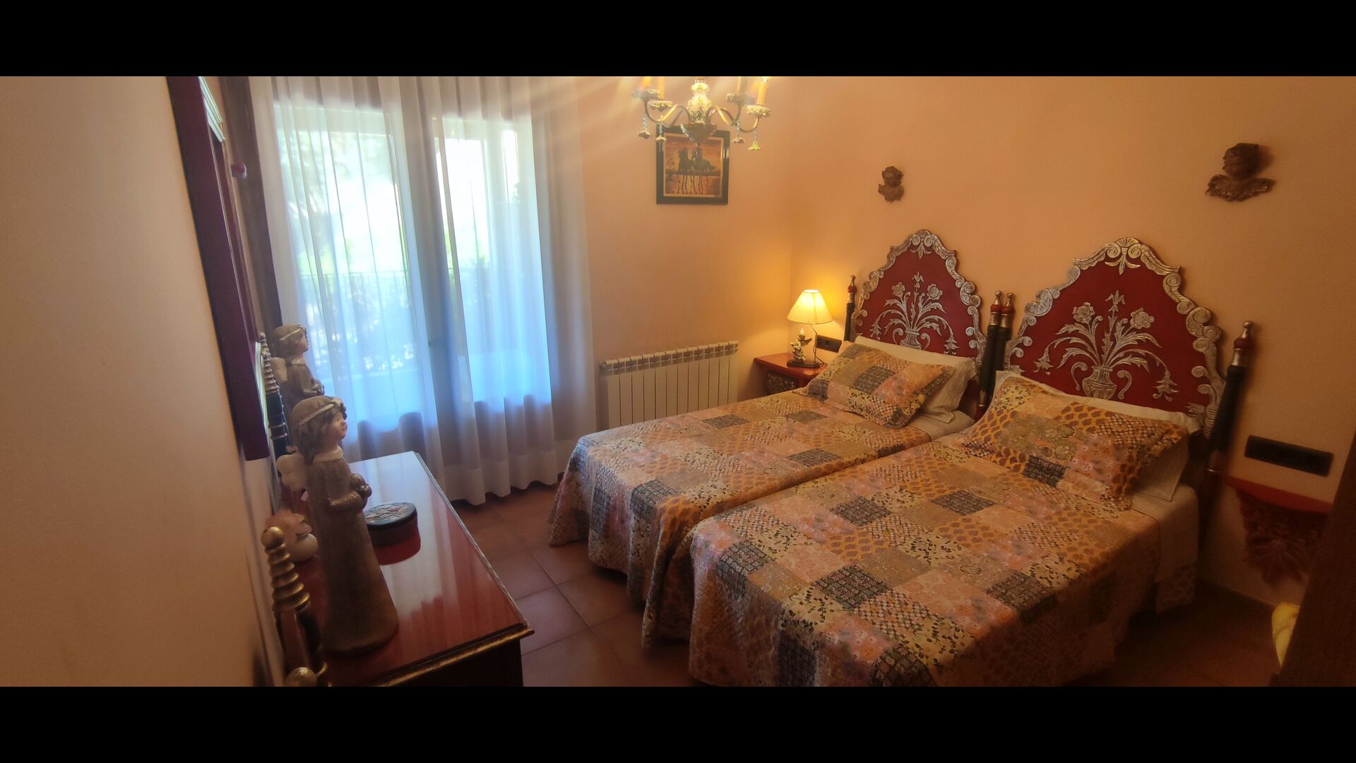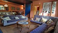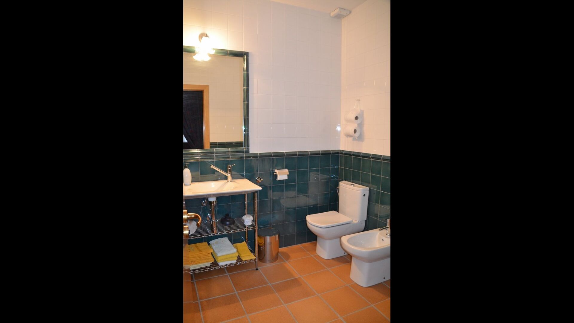 Most of the bedrooms are situated on the first floor . Here are four spacious double rooms and two bathrooms, of which one has as well shower as a bathtub with spa. This bathroom has exit to a large terrace with sitting arrangement and loungers. – there is of course also entry to this terrace from a bedroom.