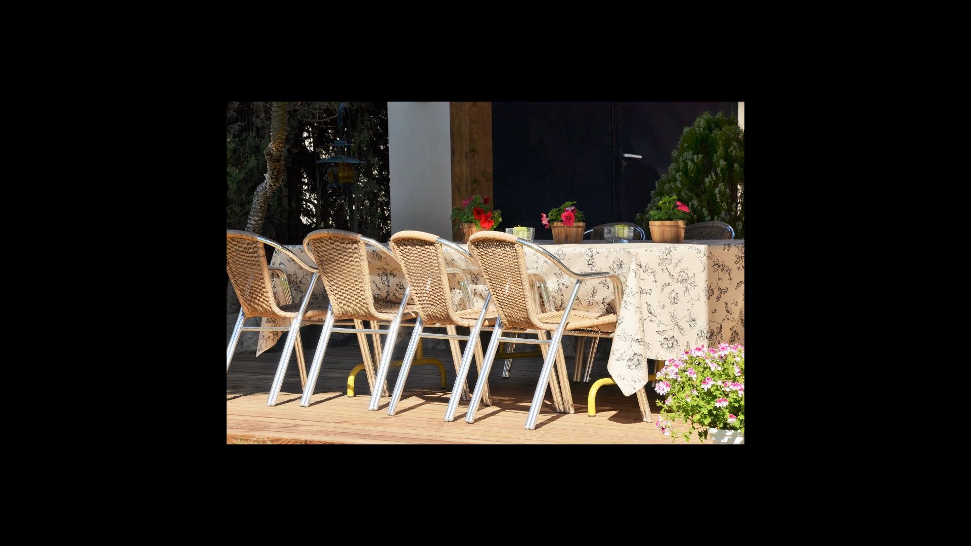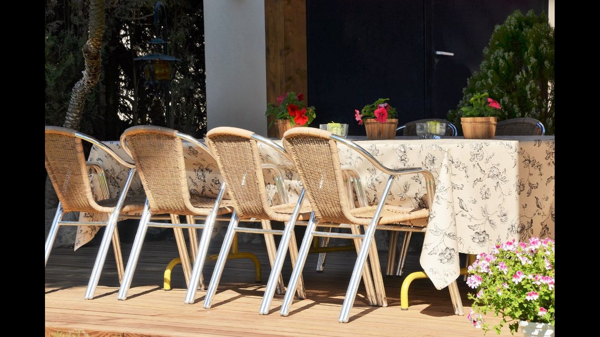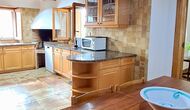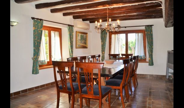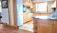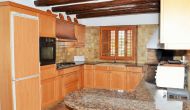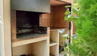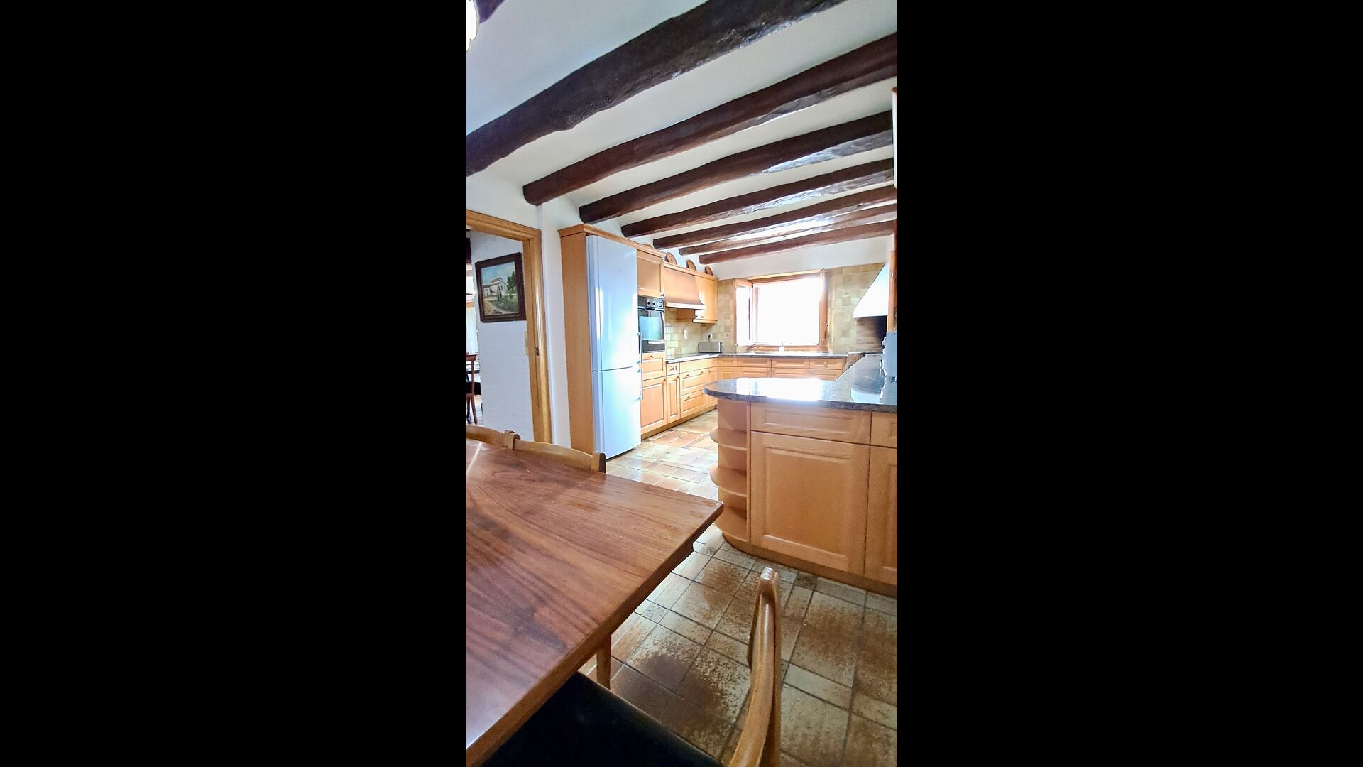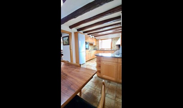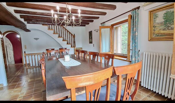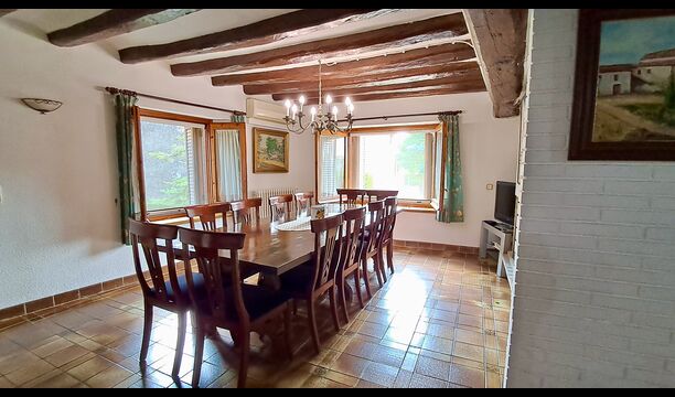 In the right part, the kitchen is nicely located, with a door to the garden to one side, and directly connected to the other side, a dining room with a big dining table. The classic-style kitchen is well-equipped with stove, hotplates, fridge, freezer, microwave etc. and also, an open barbecue makes it possible to prepare meat over open fire.