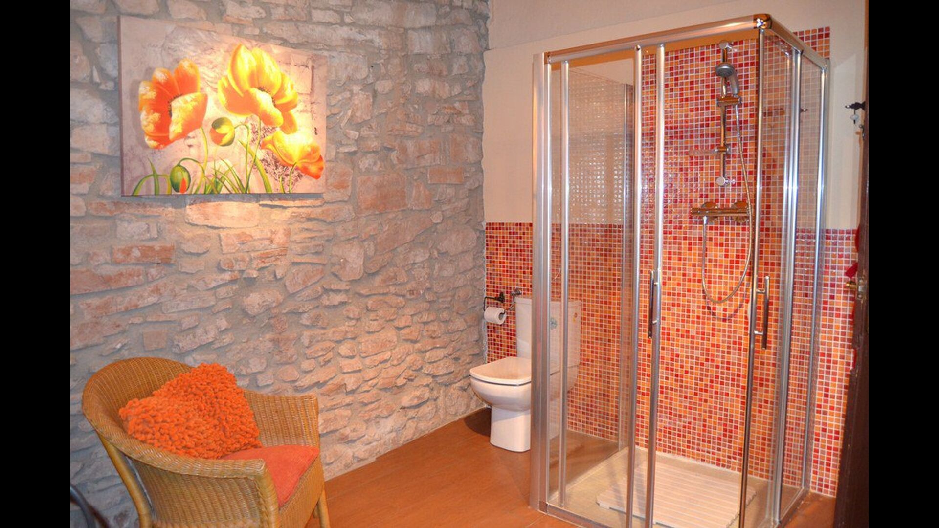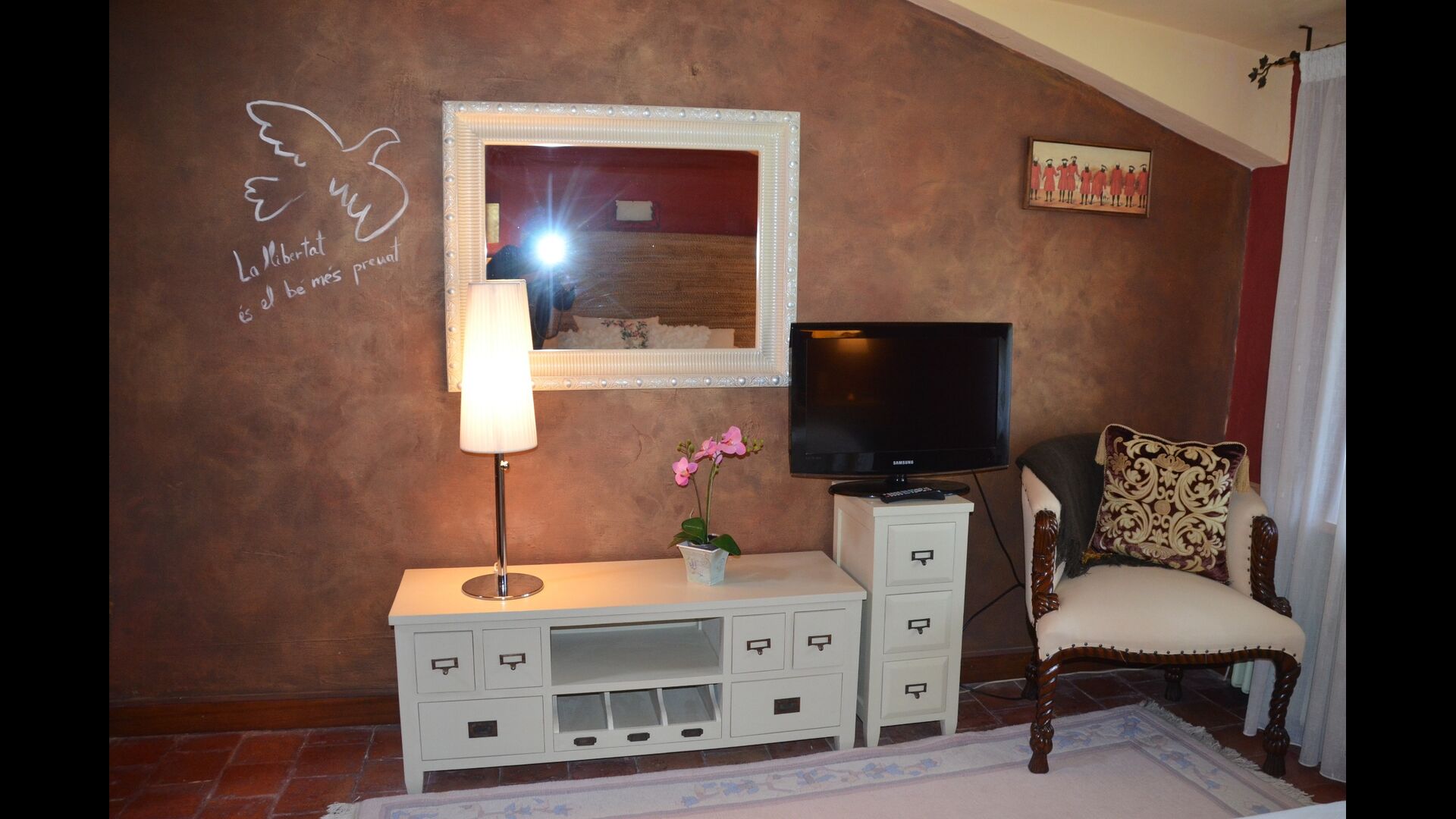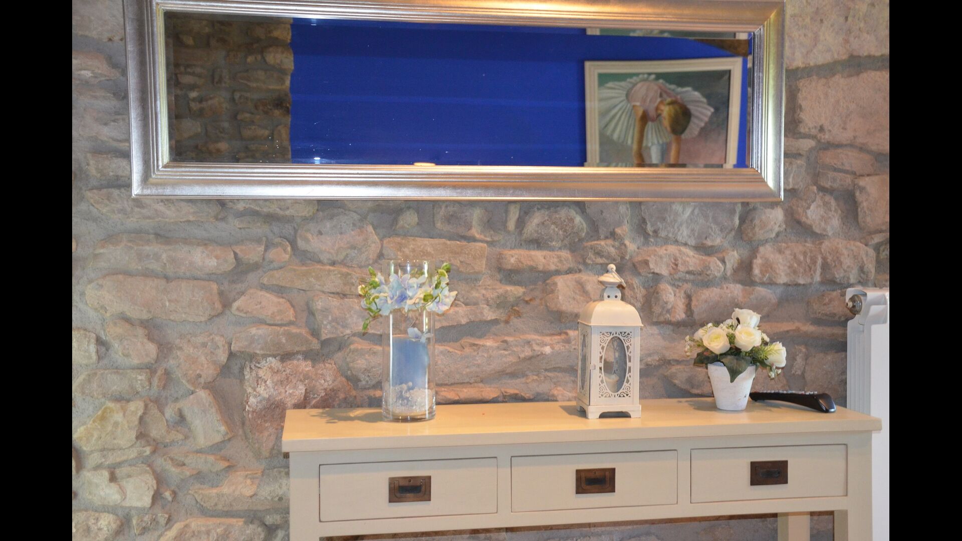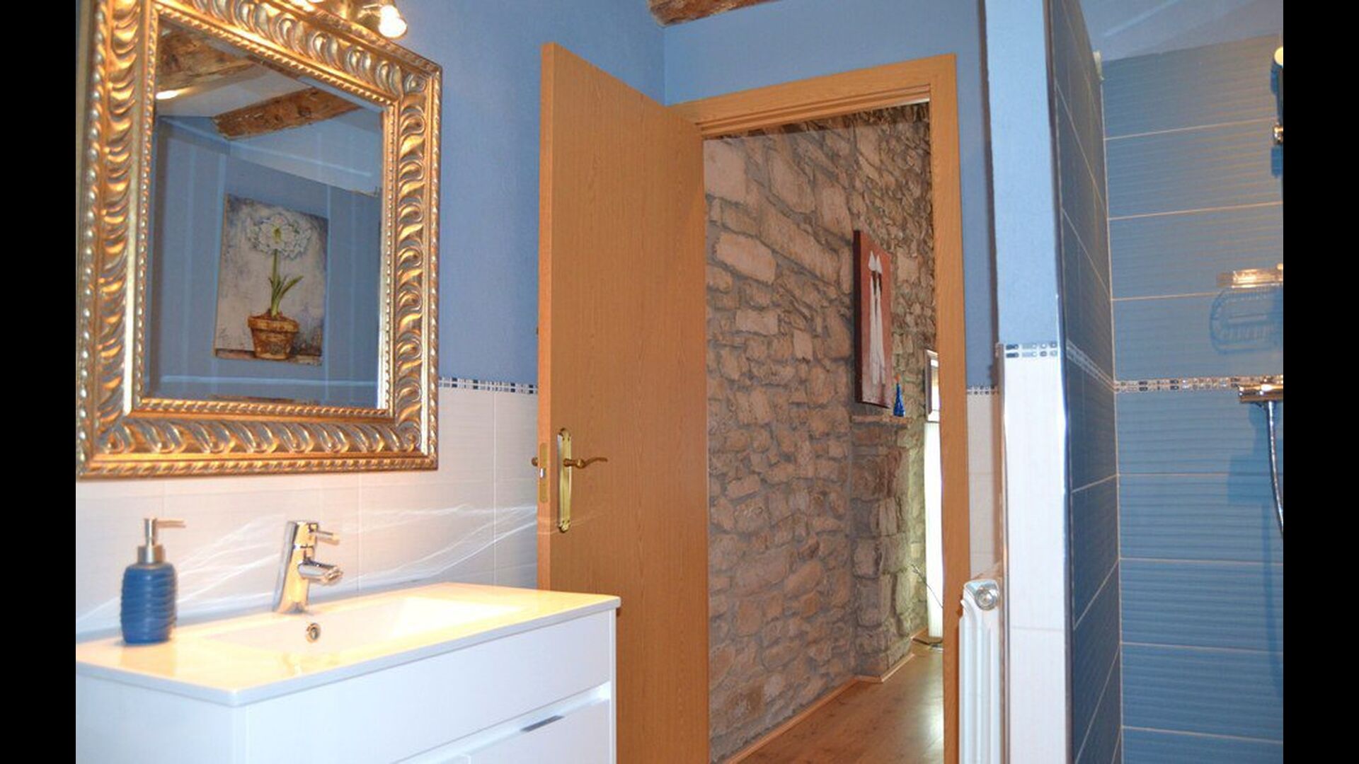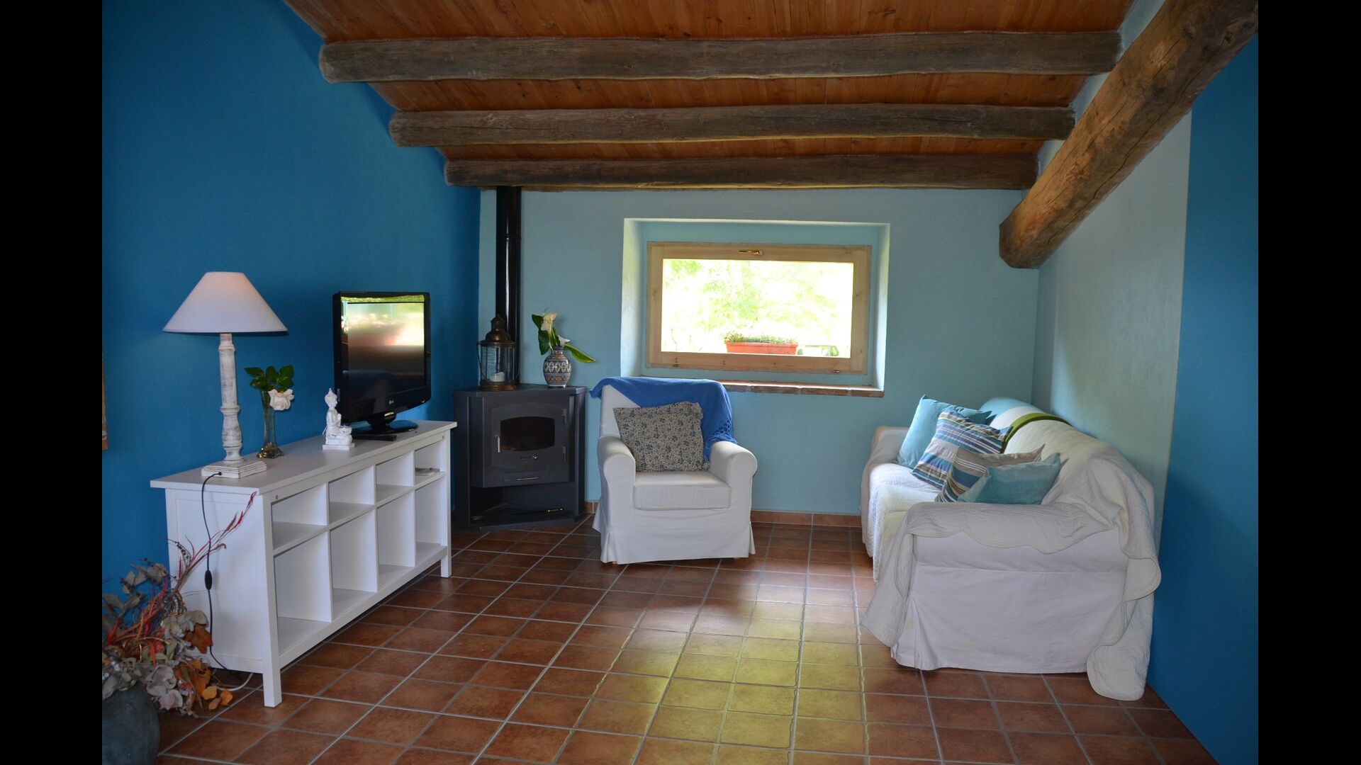 The beautiful living room with sofas and a fireplace is an extension of the house dining area that is decorated with the good traditional Spanish dining table. The kitchen is really beautiful and really spacious so it has plenty of space for the large holiday group. It has all modern amenities. These include refrigerator, freezer, good large oven, microwave, dishwasher, espresso and gas stove. The house has fast WI-FI, DVD and music system.