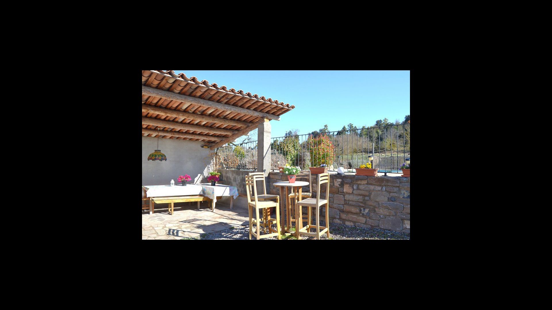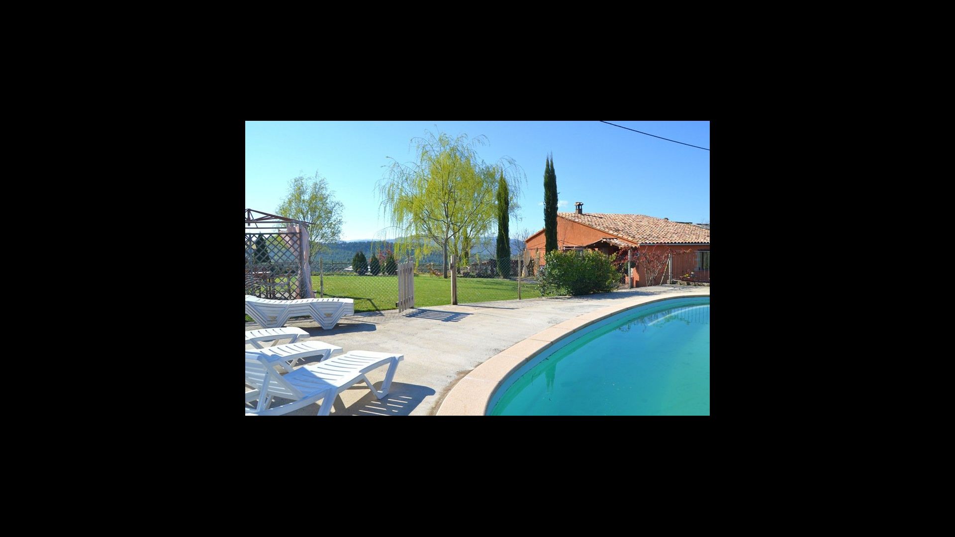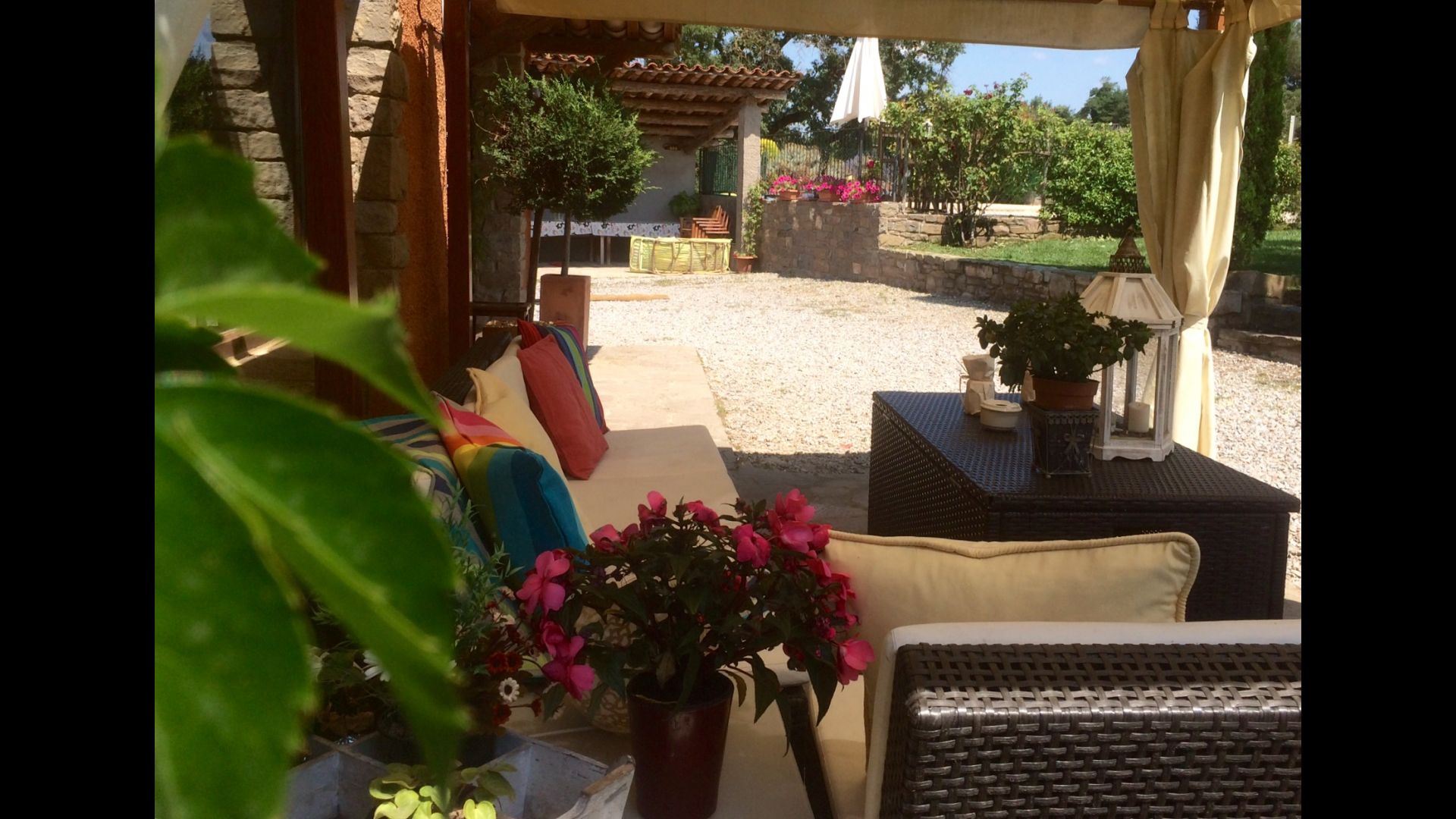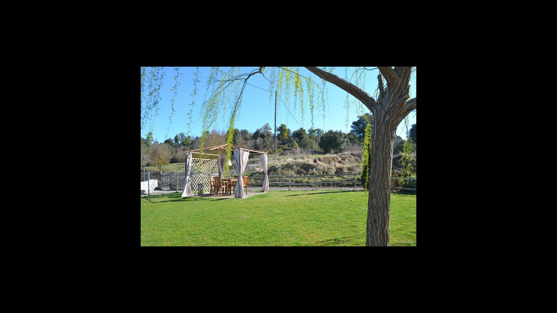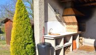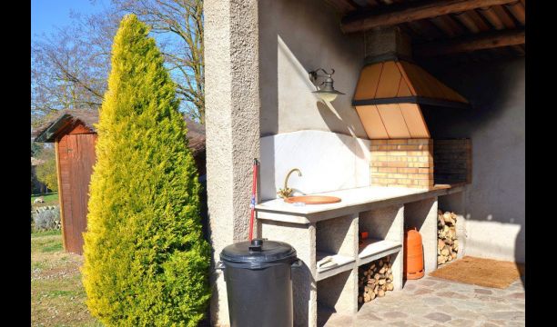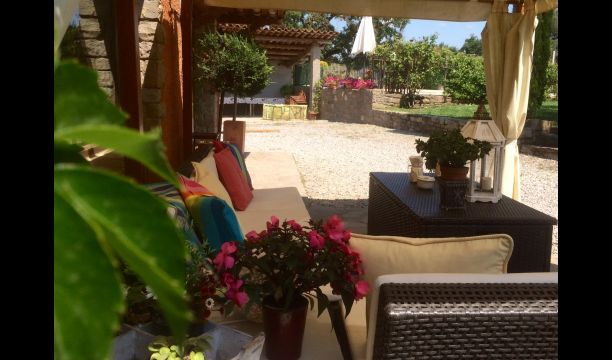 In the garden there is a fenced, private swimming pool (each of the two houses has its own pool) and at the end of the swimming pool is a covered terrace with BBQ and outdoor kitchen. There is also a small terrace in front of the house and on the lawn is set up a small pavilion, where you also can find shade on hot summer days.