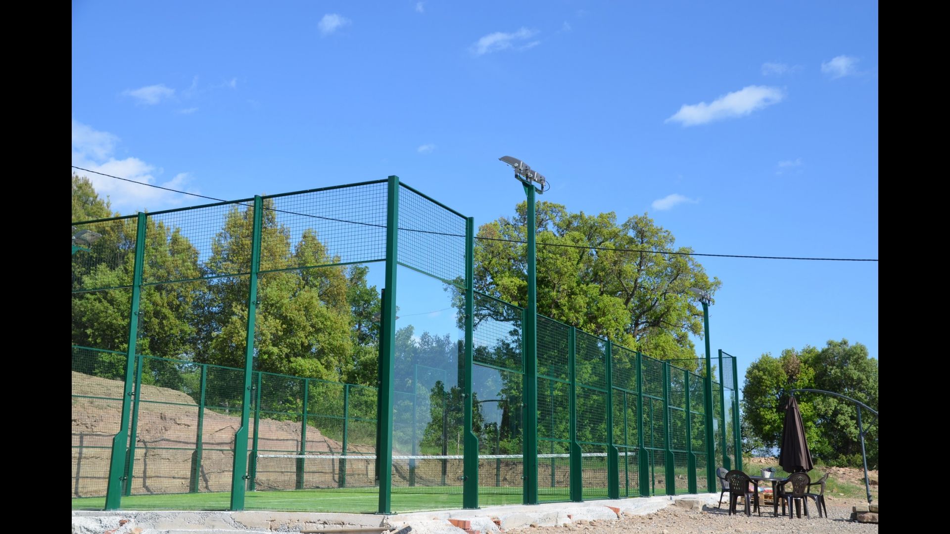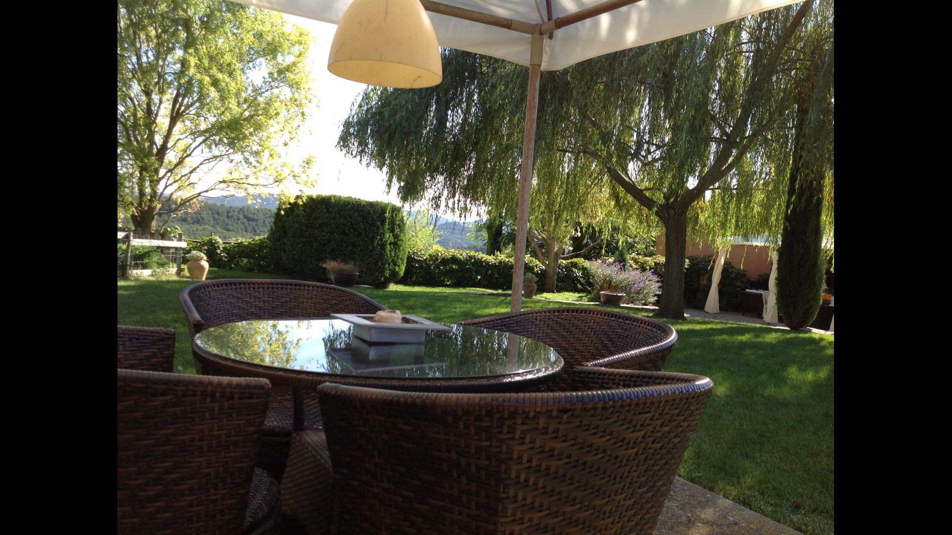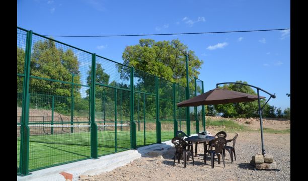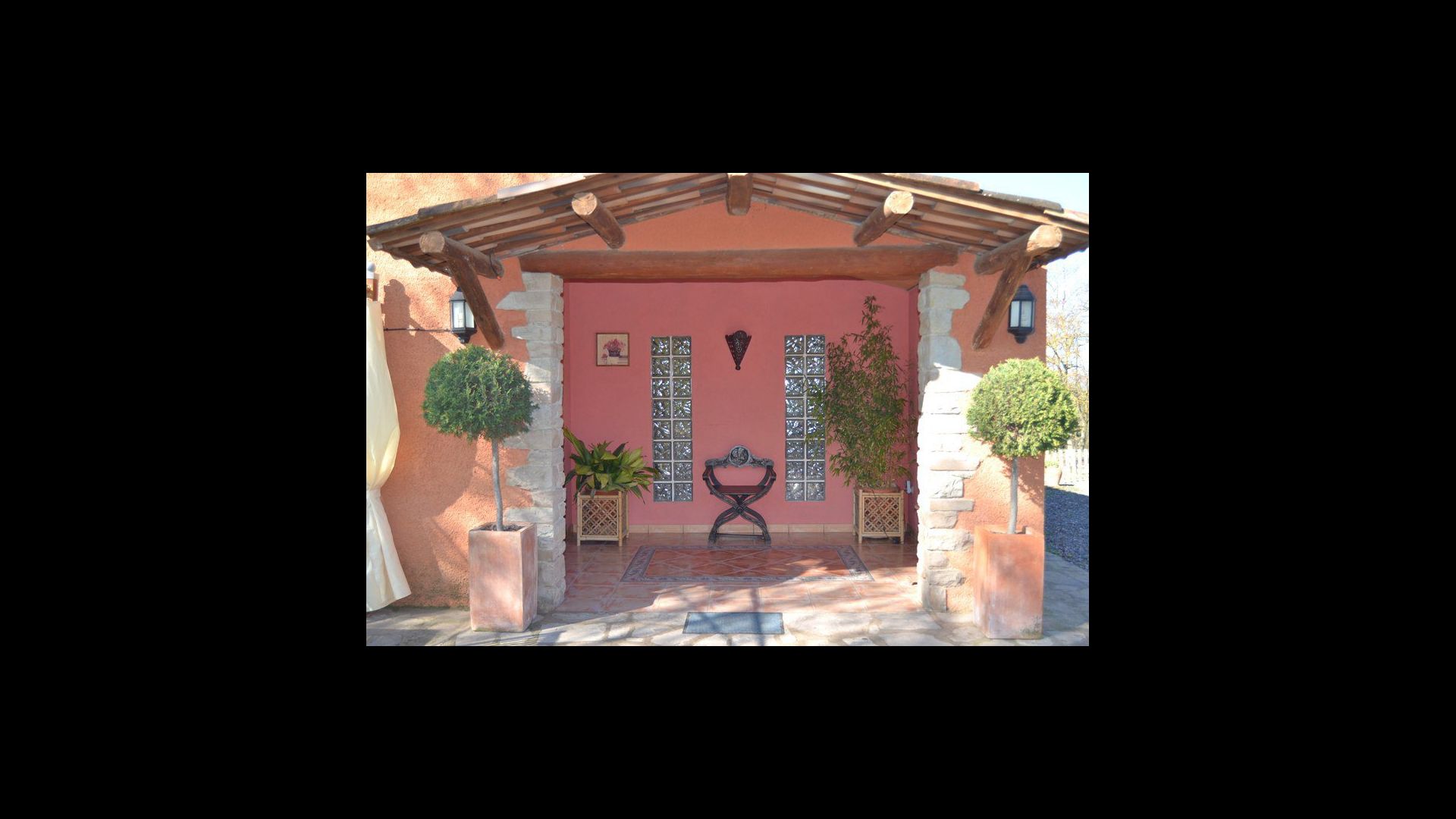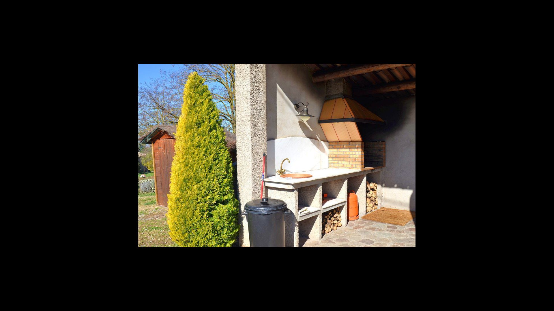 In the garden there is a fenced, private swimming pool (each of the two houses has its own pool) and at the end of the swimming pool is a covered terrace with BBQ and outdoor kitchen. There is also a small terrace in front of the house and on the lawn is set up a small pavilion, where you also can find shade on hot summer days.