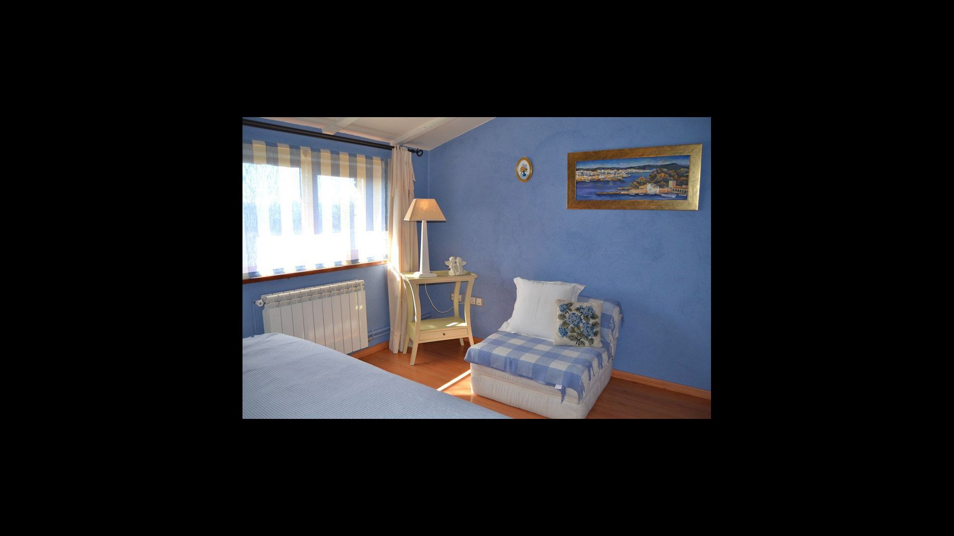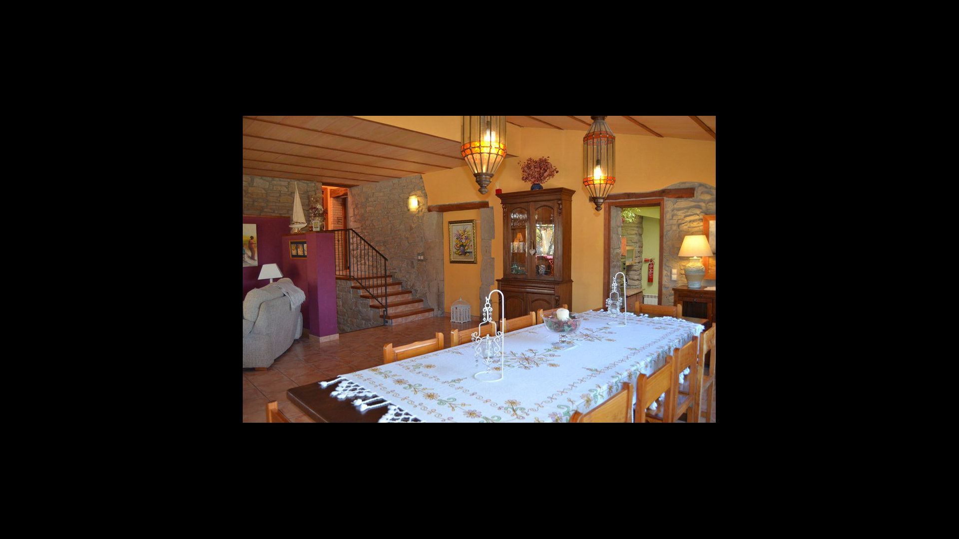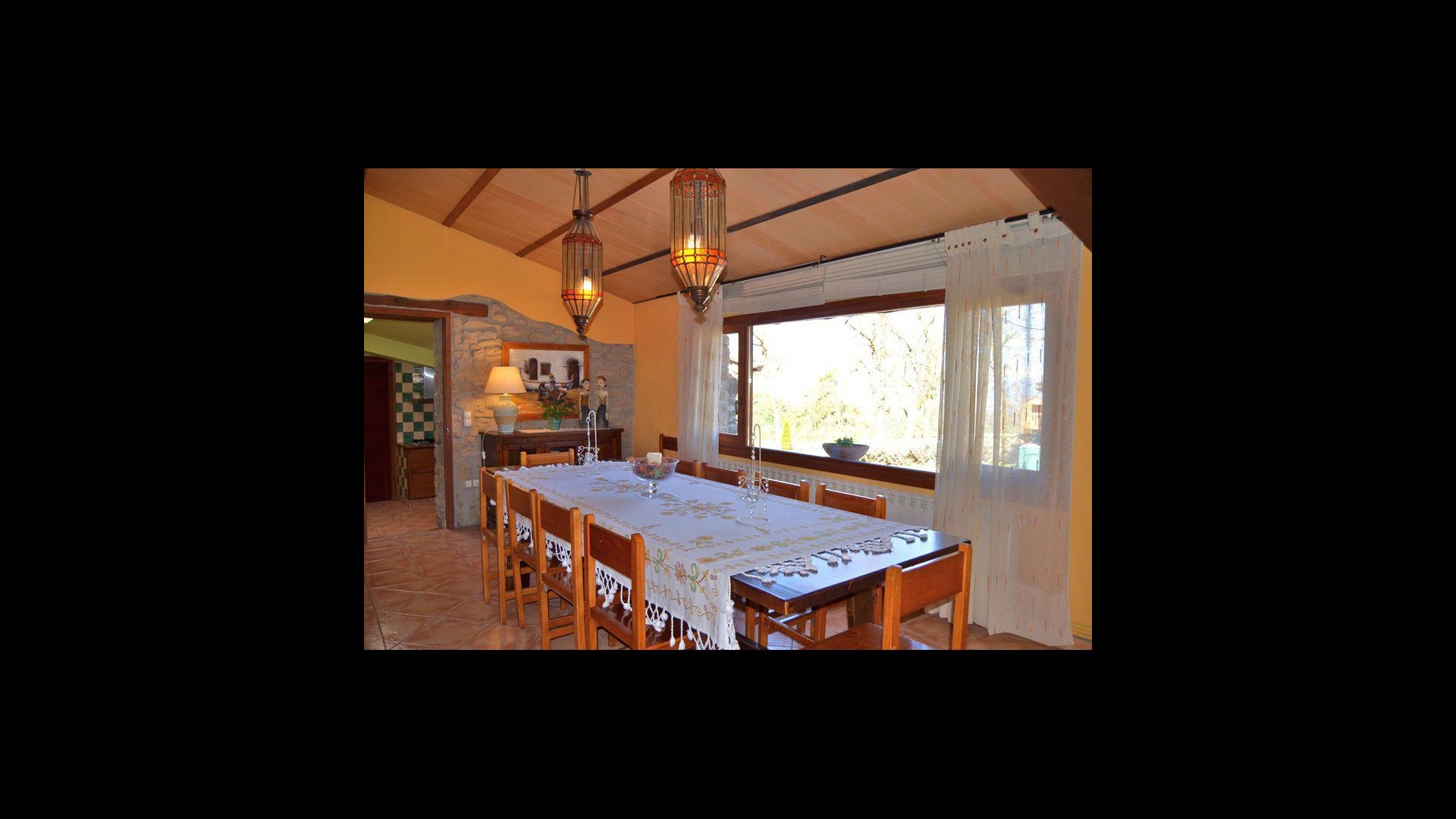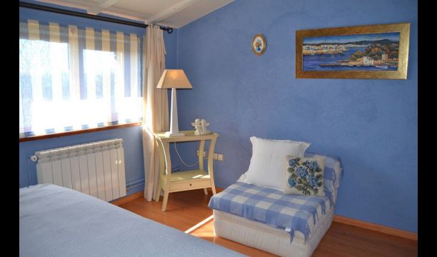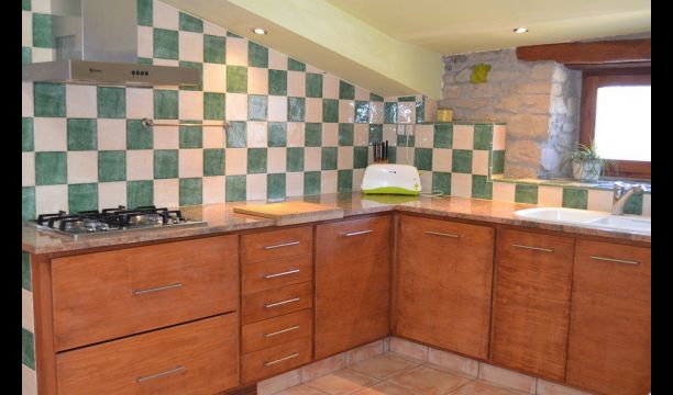 The beautiful living room with sofas and a fireplace is an extension of the house dining area that is decorated with the good traditional Spanish dining table. The kitchen is large and has plenty of space for the large holiday group. The kitchen has all modern amenities. These include refrigerator, freezer, good large oven, microwave, dishwasher, espresso and gas stove. The house has fast WI-FI, DVD and music system.