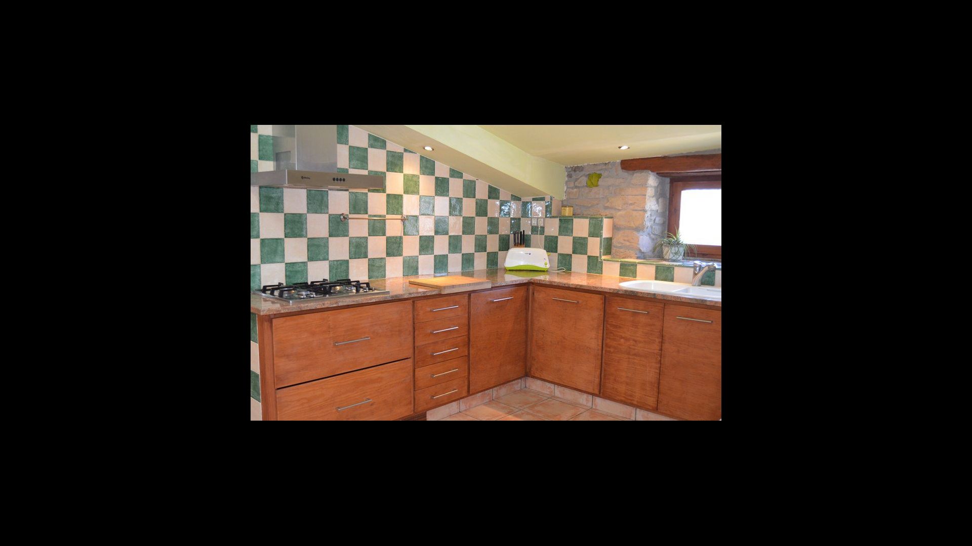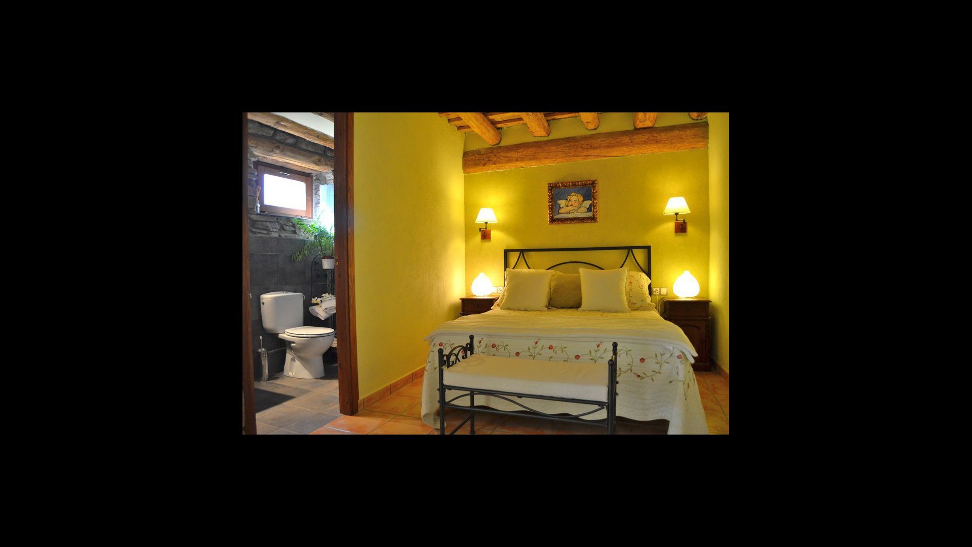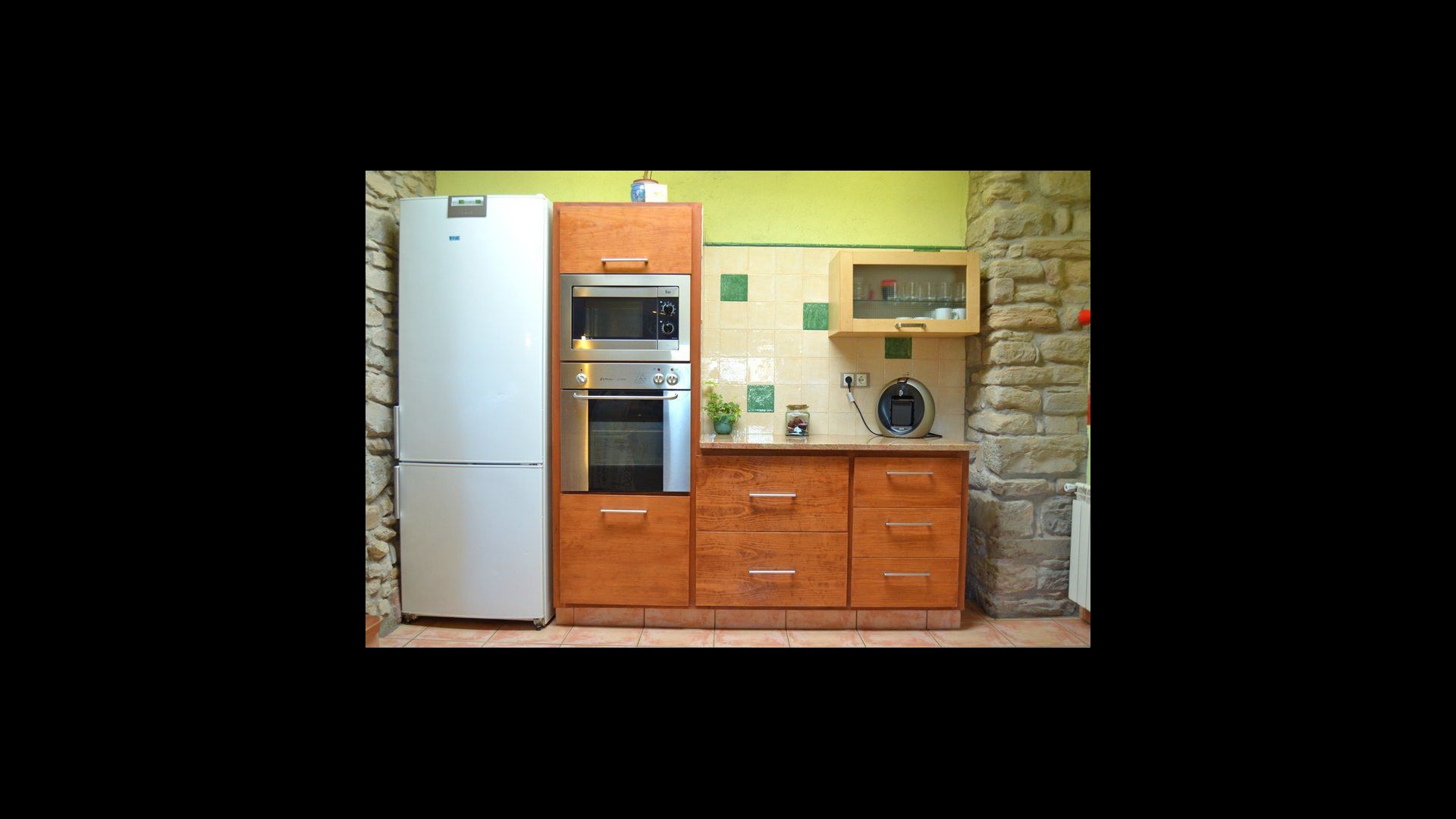 The beautiful living room with sofas and a fireplace is an extension of the house dining area that is decorated with the good traditional Spanish dining table. The kitchen is large and has plenty of space for the large holiday group. The kitchen has all modern amenities. These include refrigerator, freezer, good large oven, microwave, dishwasher, espresso and gas stove. The house has fast WI-FI, DVD and music system.