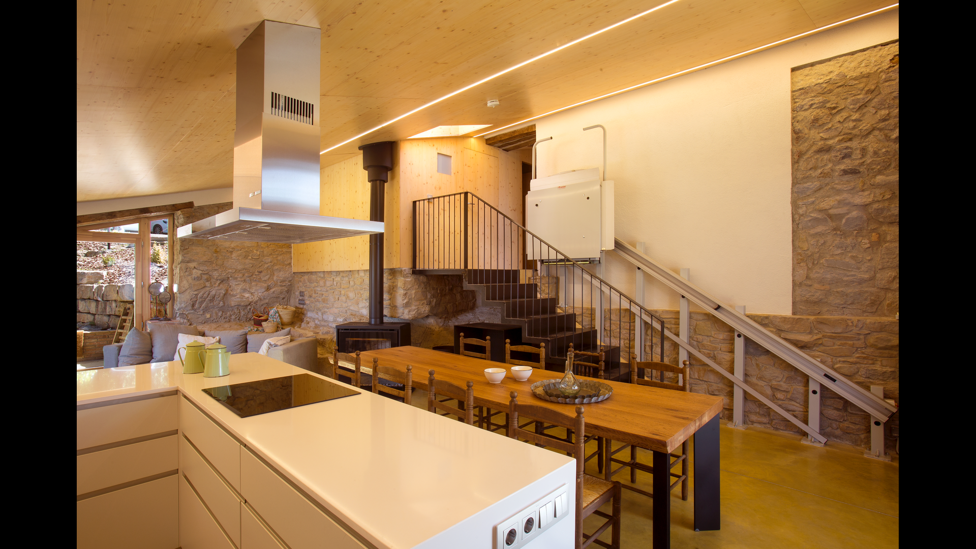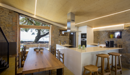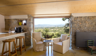 Inside the house you will find the large, open kitchen and dining space. The panoramic windows give the room a beautiful, natural light but also gives you yet another place to enjoy the spectacular view. The kitchen is fully equipped, and also has basic products such as scrub and soap, cloths and kitchen paper, oil, vinegar, salt, sugar and coffee. You will also find four very nicely decorated double rooms which each have private bathrooms.