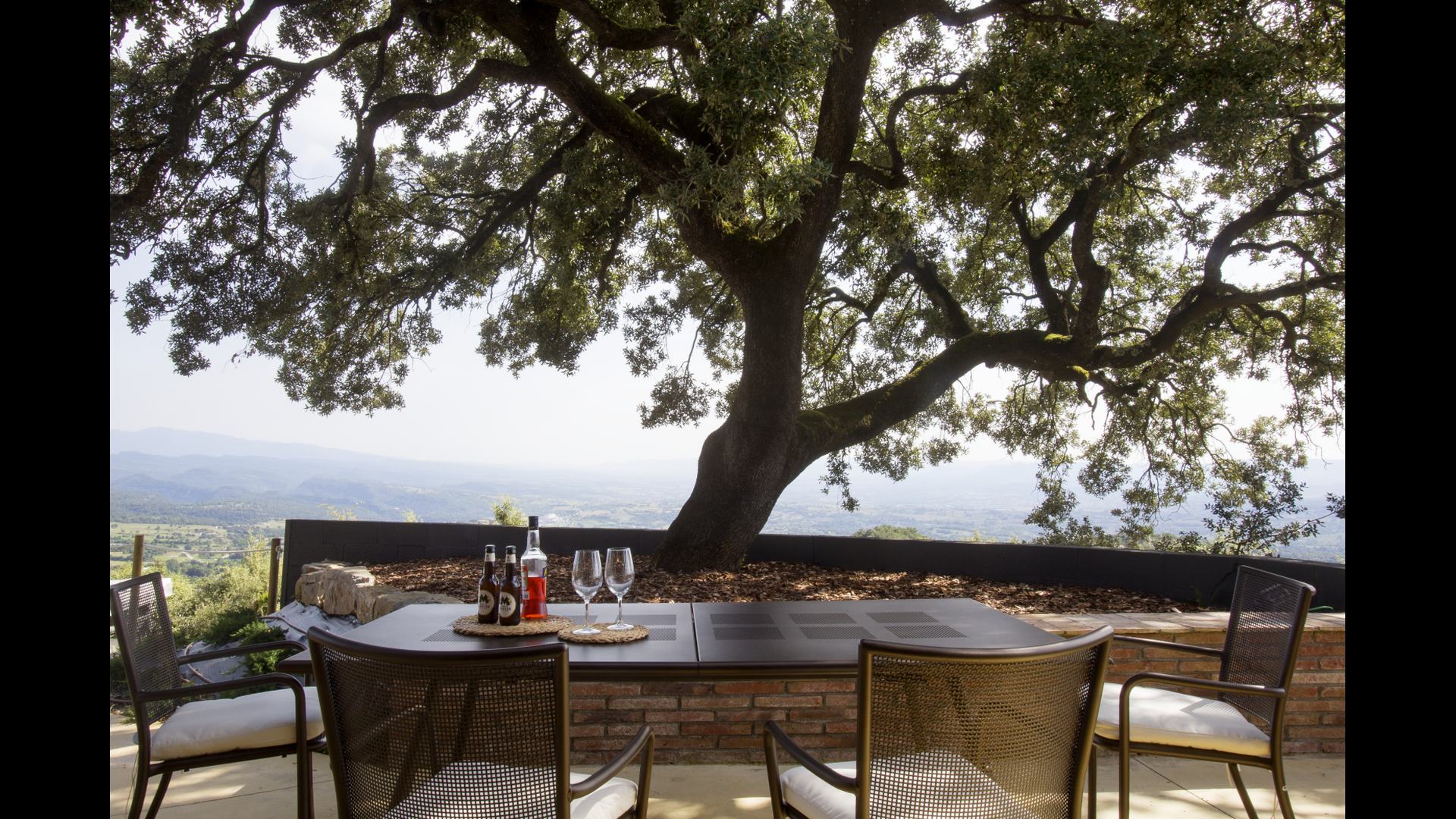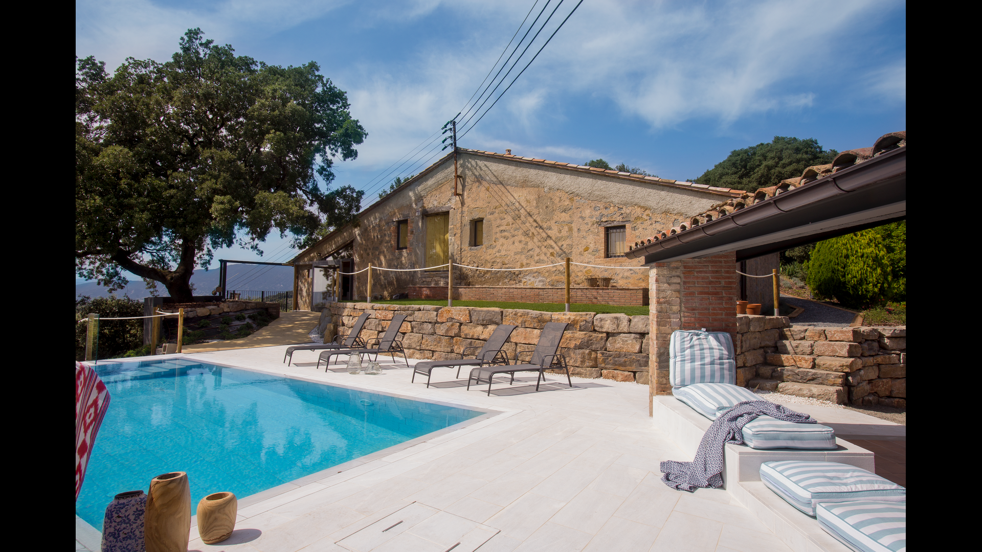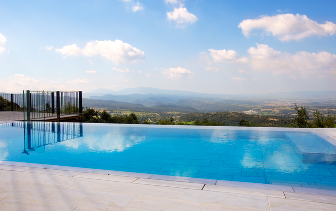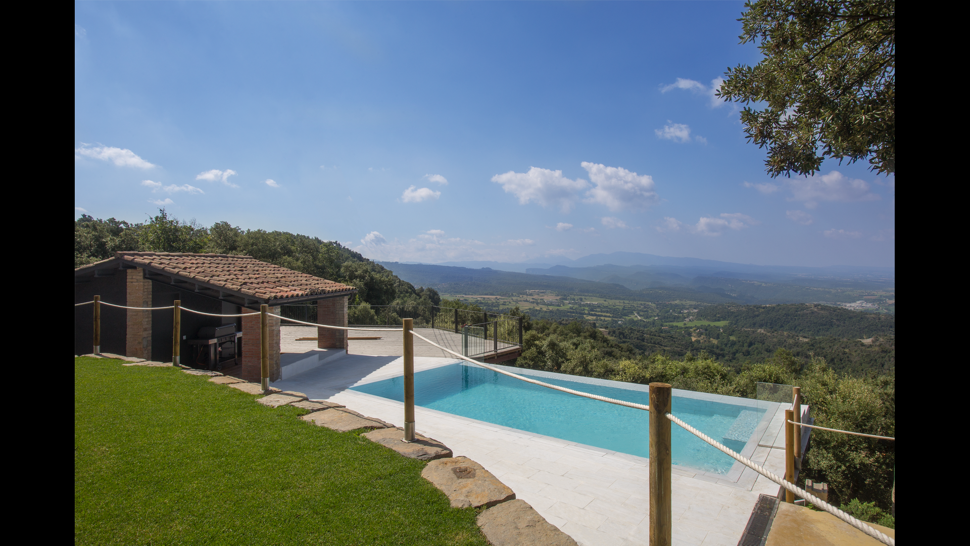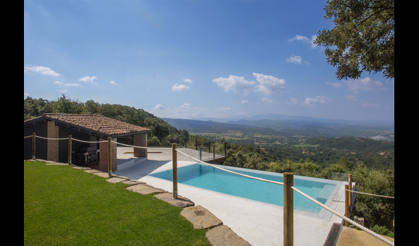 The stunning swimmingpool is located in the front of the house and has the same magnificent view, as the rest of the house. We imagine that you will probably spend the most of your holiday right here, watching the children play and swim the day away, reading books, and enjoying the Catalan sun rays. To the left of the pool you will find the BBQ area and the large terrace, where you can enjoy meals throughout the day whilst admiring the green and lush landscape.