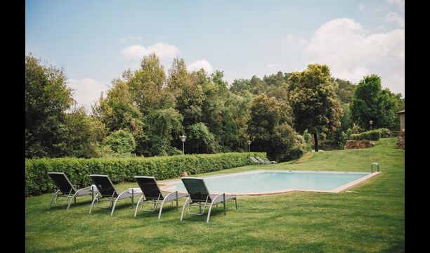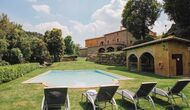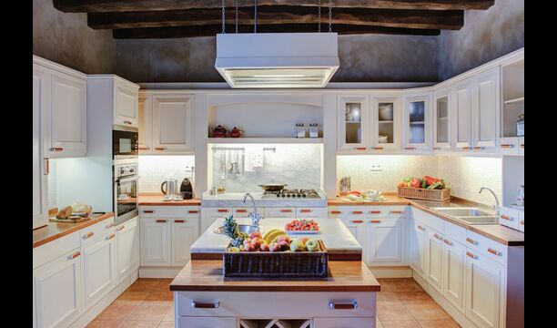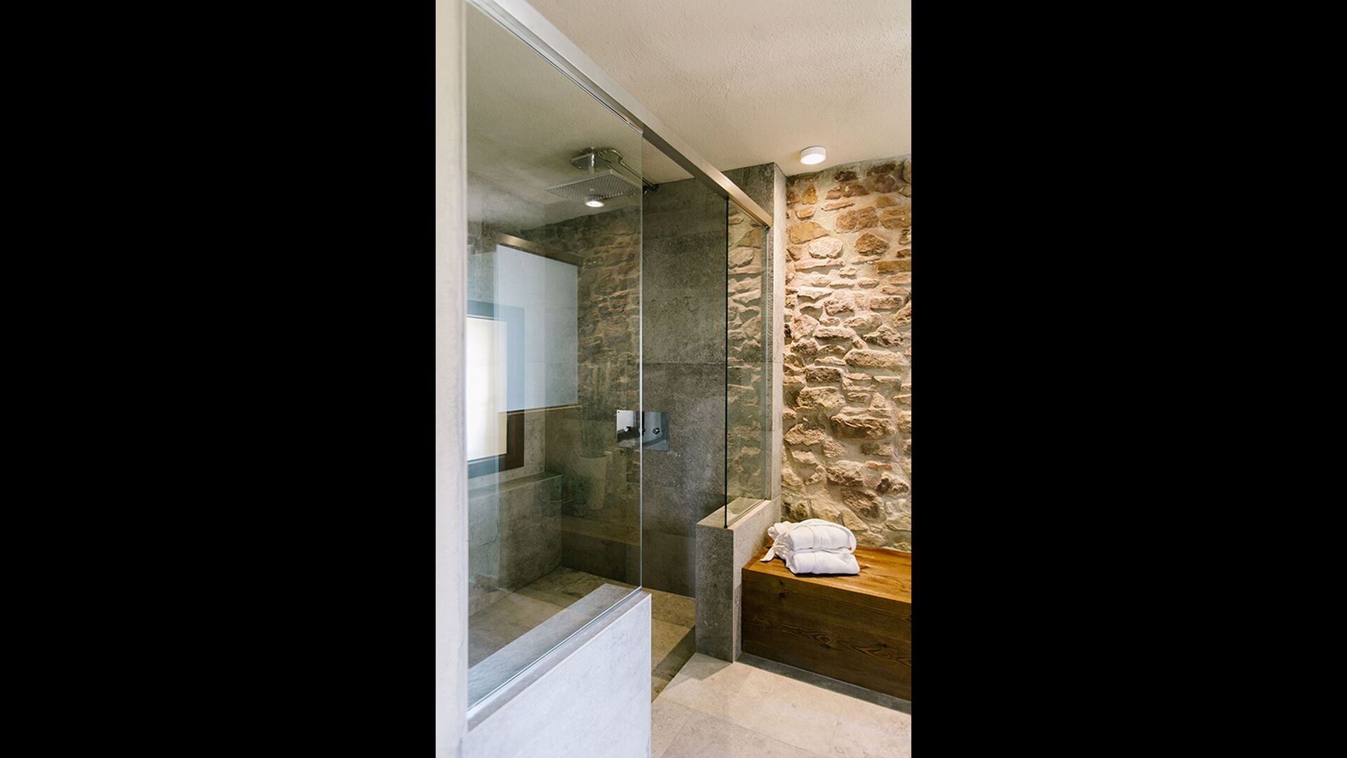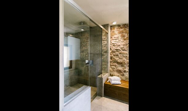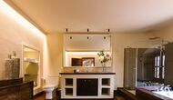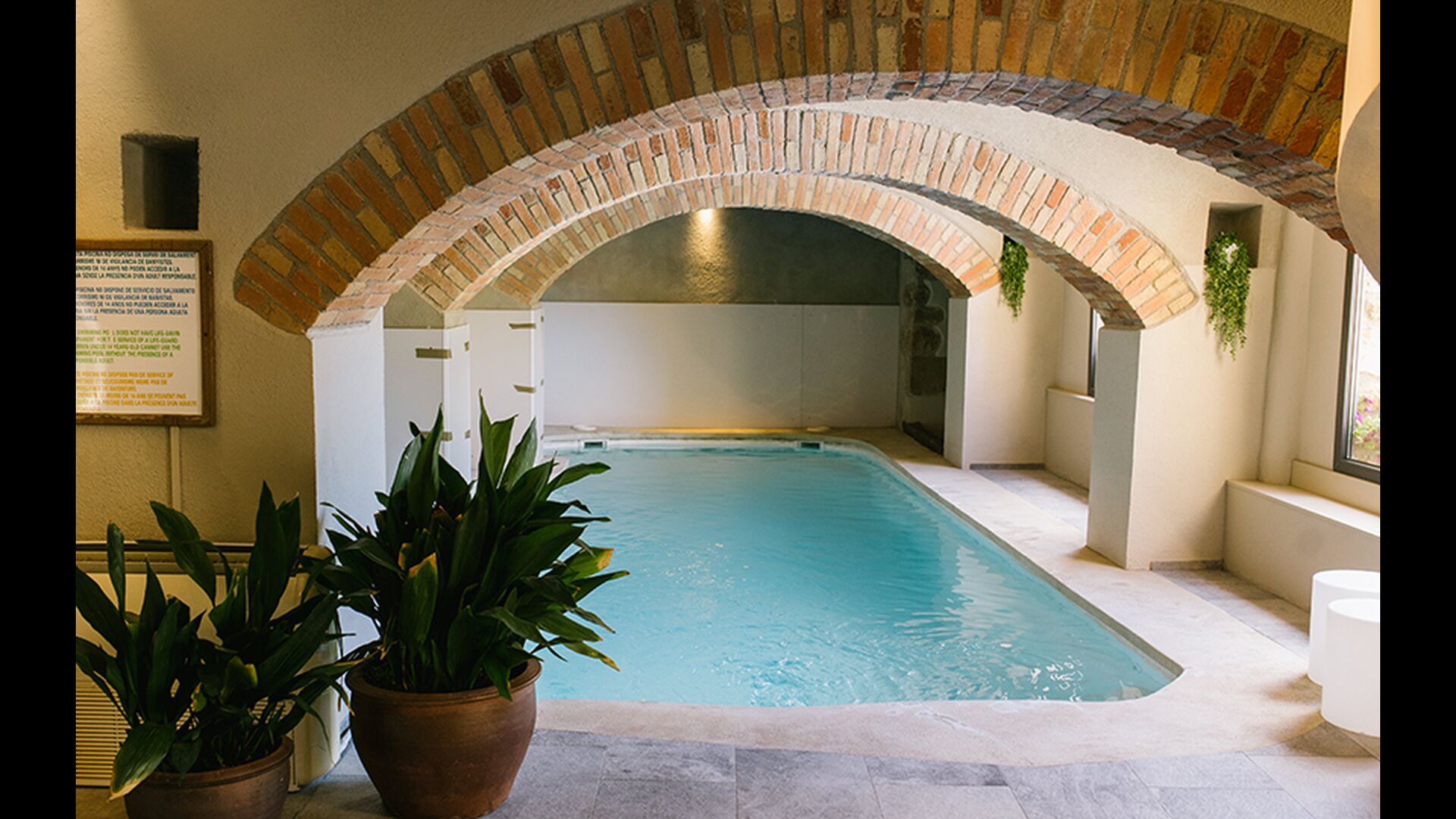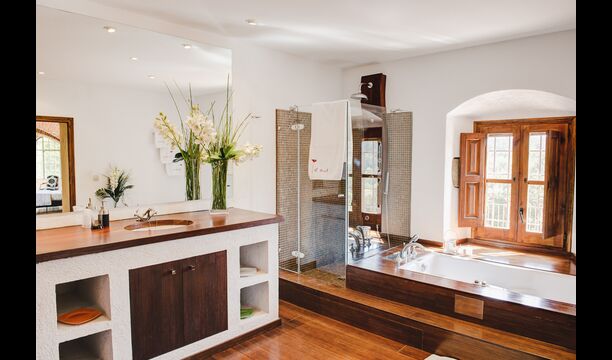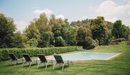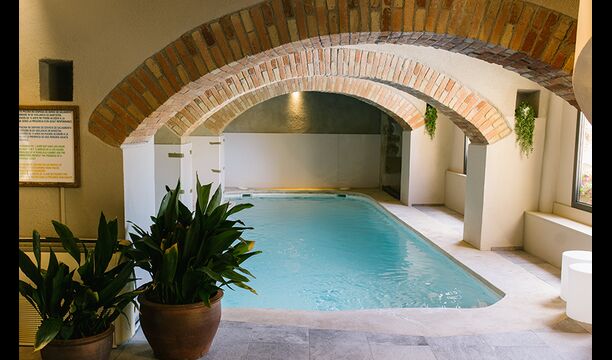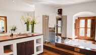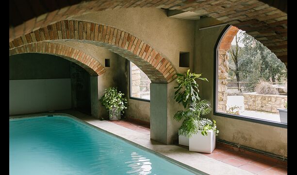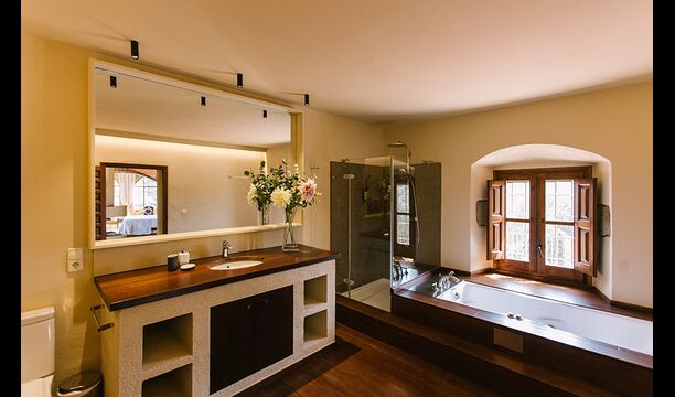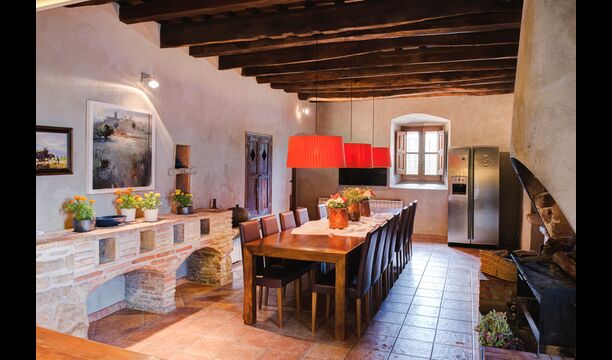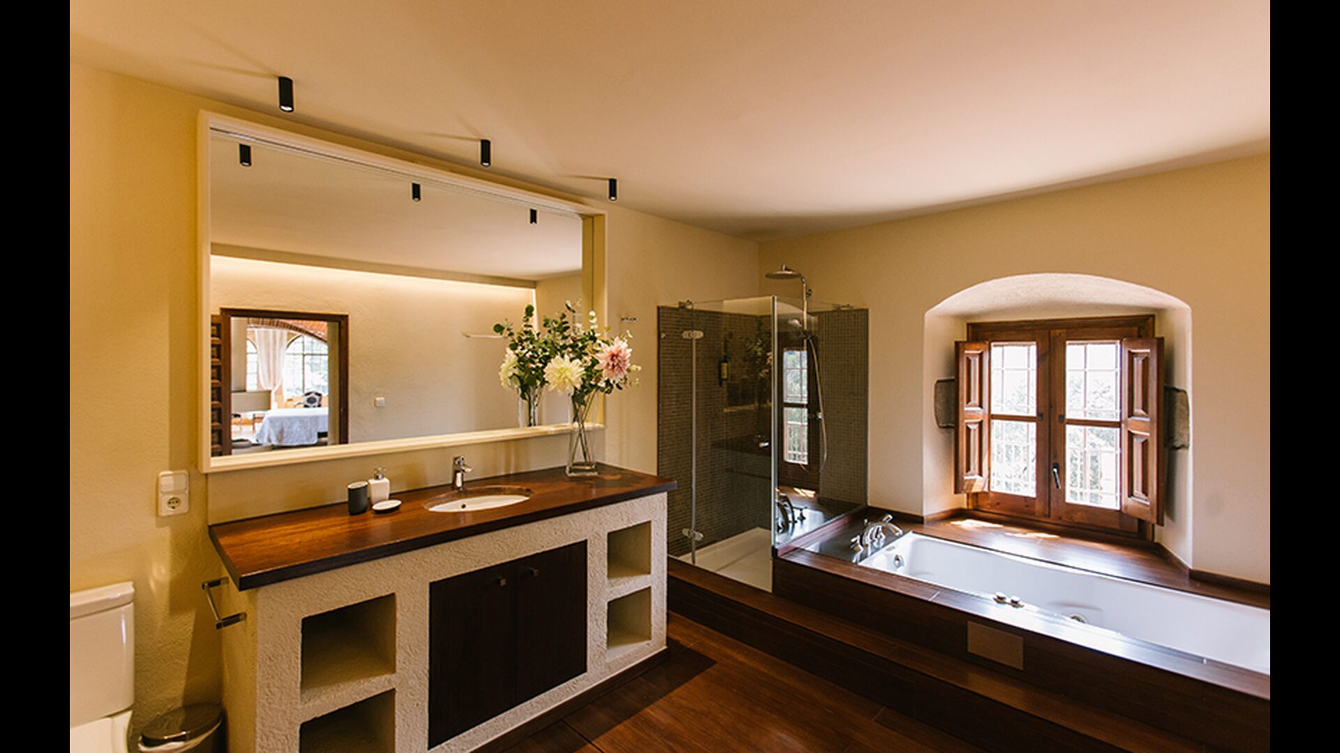The ground floor contains a huge dining-kitchen with open fireplace, an extensive lounge area, separate dining room, bar and a bathroom. Furthermore, there is an heated indoor swimming pool sized 3,5 x 7 metres.