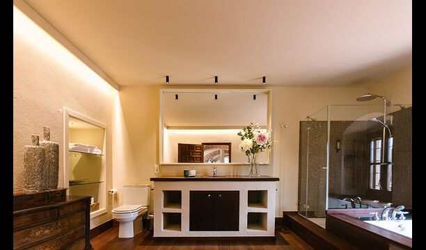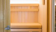 The first floor contains a large lounge with open fireplace, television, DVD and stereo. Four double rooms with bathrooms (3 with double beds, 1 with 2 individual beds) and a 65m2 master suite with open fireplace, television, and bathroom with spa bath. From the master suite there is a private stairway directly to the indoor pool-area.