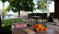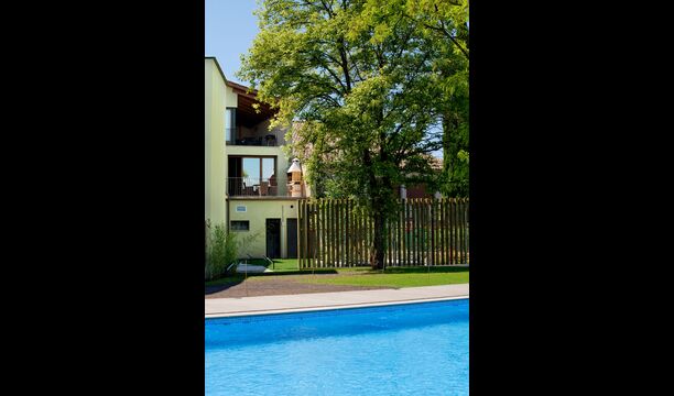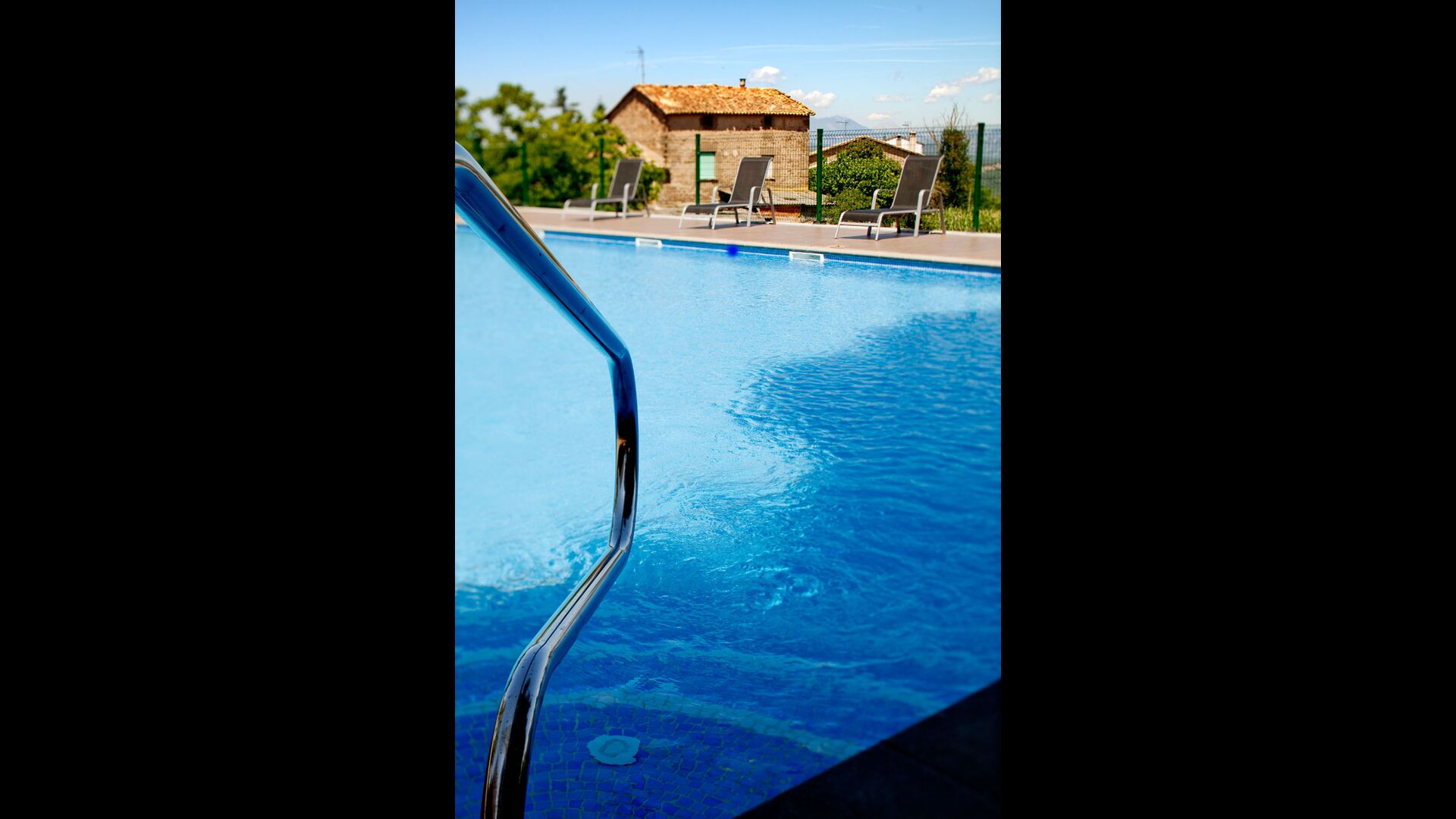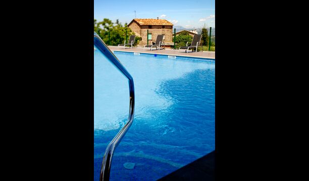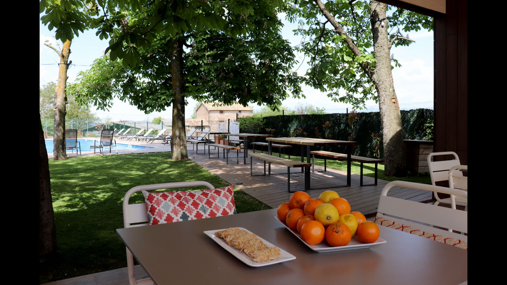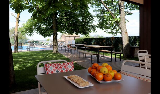In addition, the back of the house was turned into the fantastic swimming pool area with the big swimming pool (17 x 5 meters), café tables, toilets and changing rooms, and shady corners and sunny spots. The view is stunning, directly to the Pyrenees. As you book all apartments, this area will of course be for your private use only.