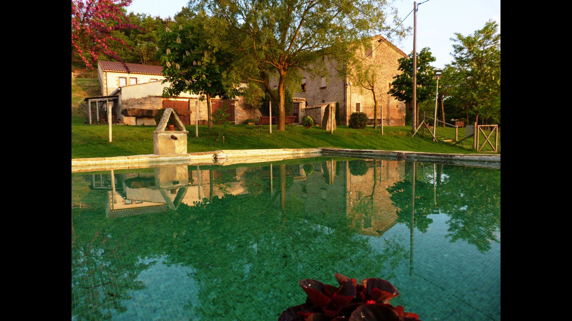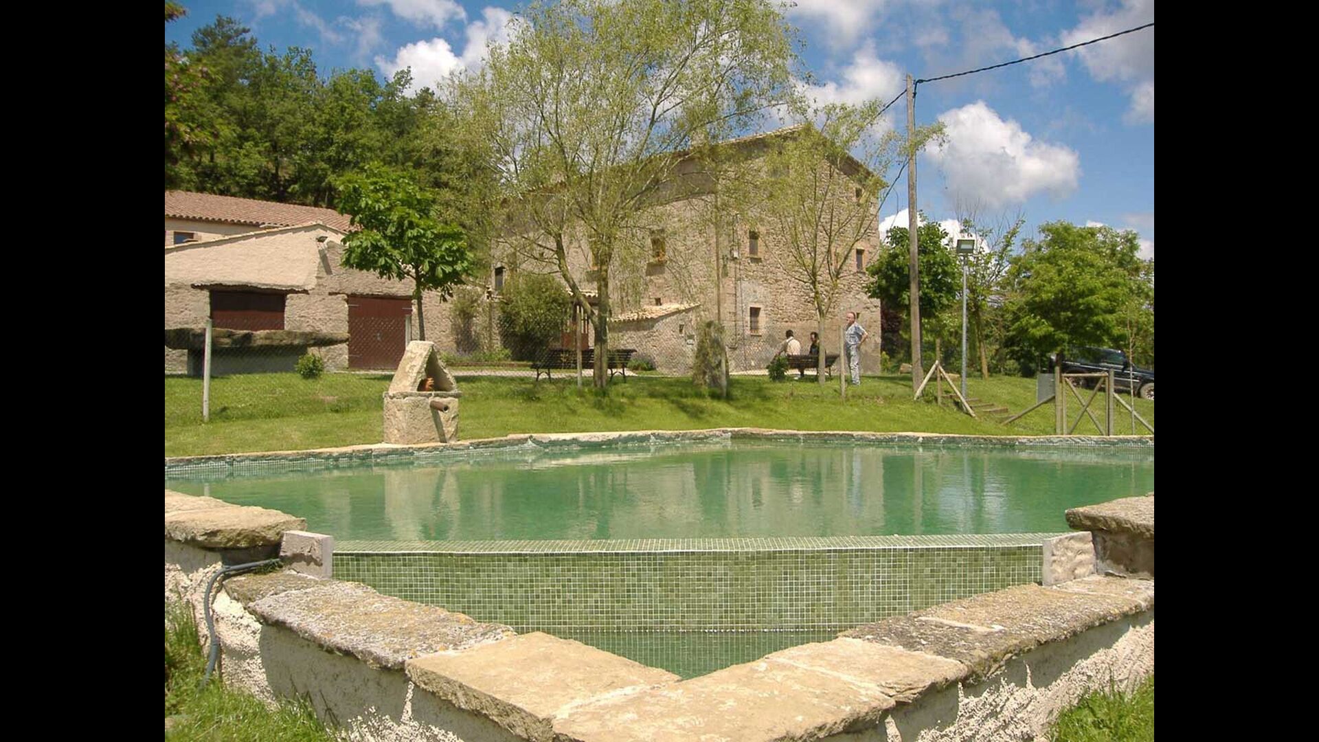 In front of the house, you will find a lovely courtyard with a barbecue - a great spot for outside dining. The swimming pool area is situated by the side of the house, and has an impressive size of 9 x 8 meters. Instead of building a traditional swimming pool, Joan and Alicia decided to make a swimming pool, which to a greater extend matches the house and the history. Therefore, the swimming pool has been made with rocks and with a small fountain circulating the water.
