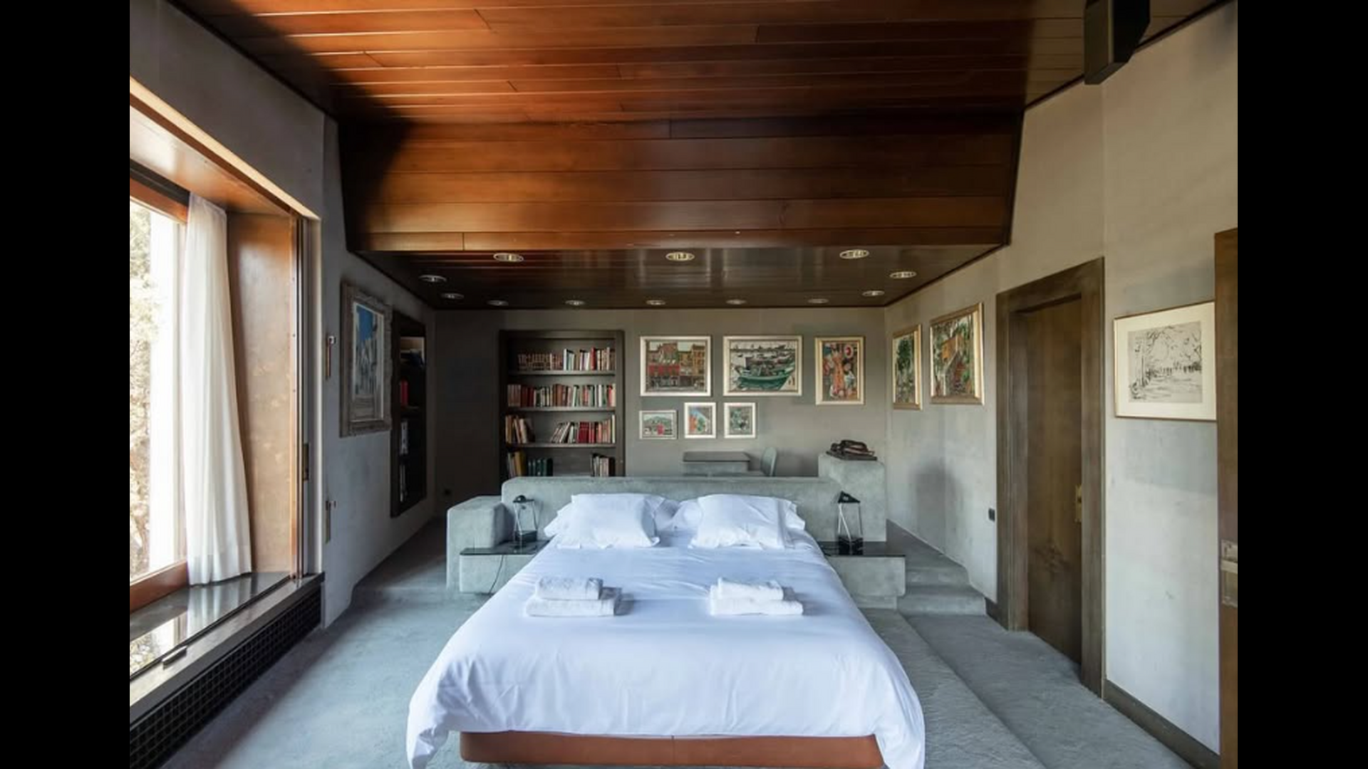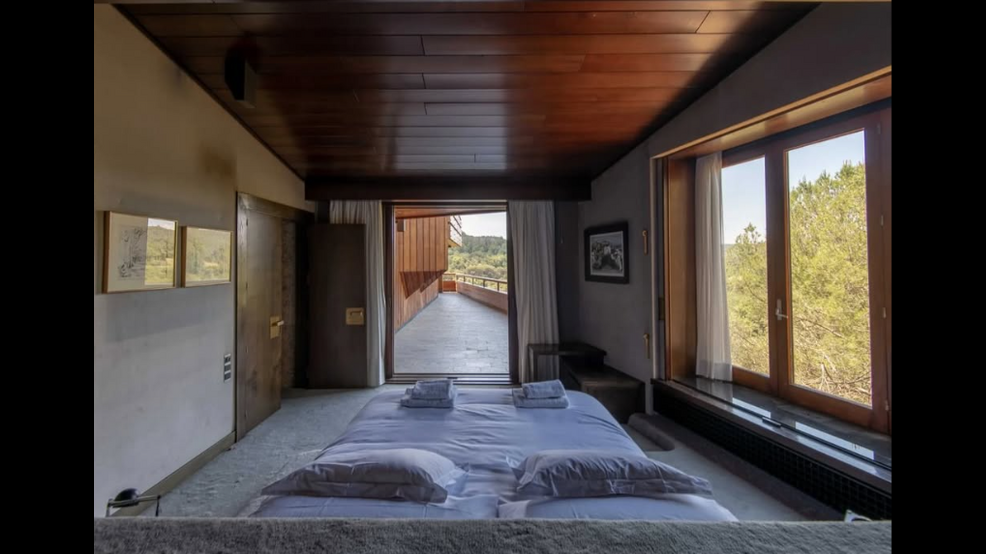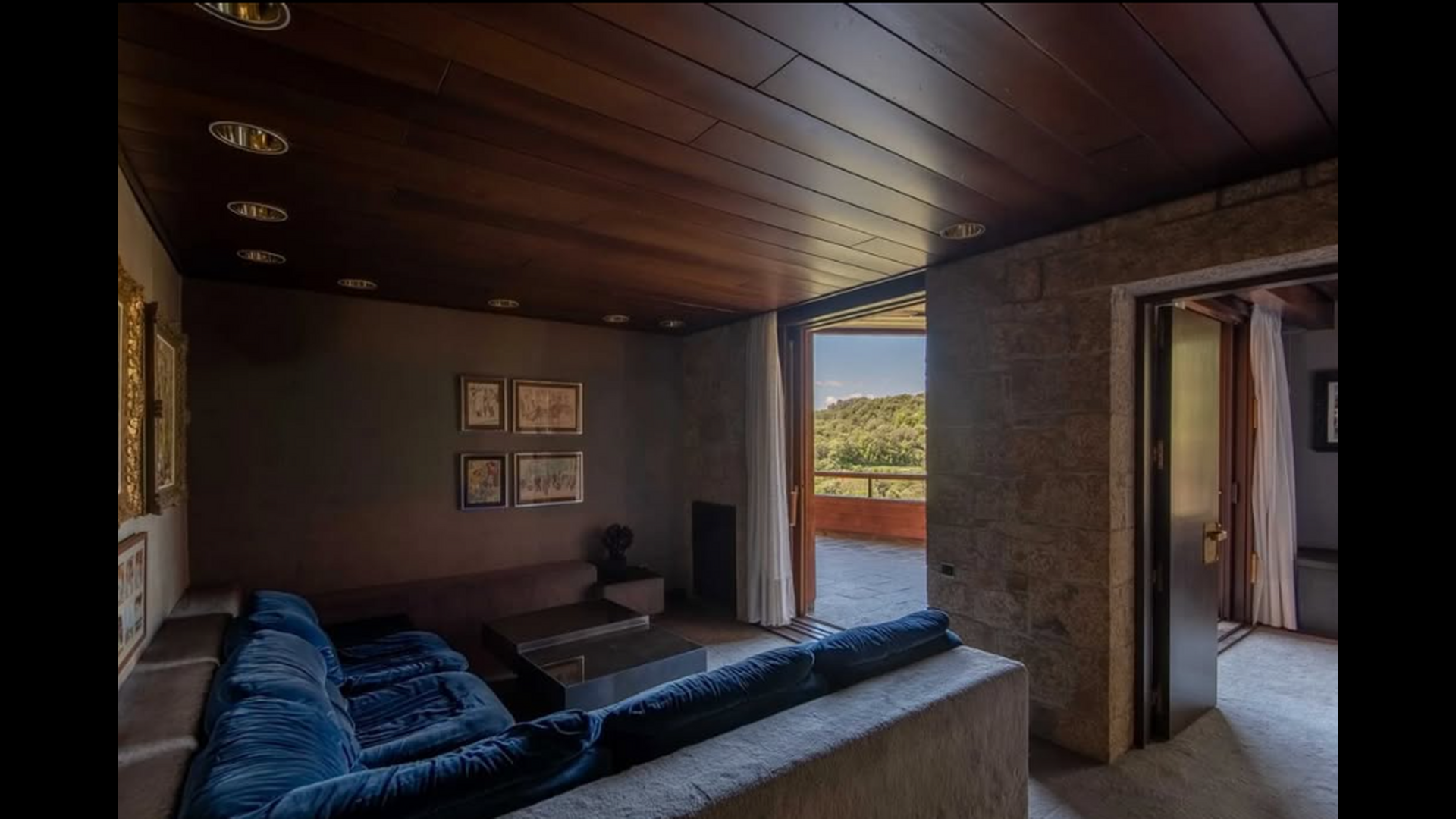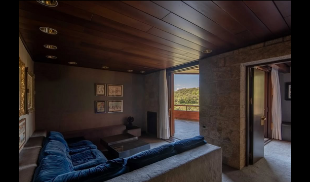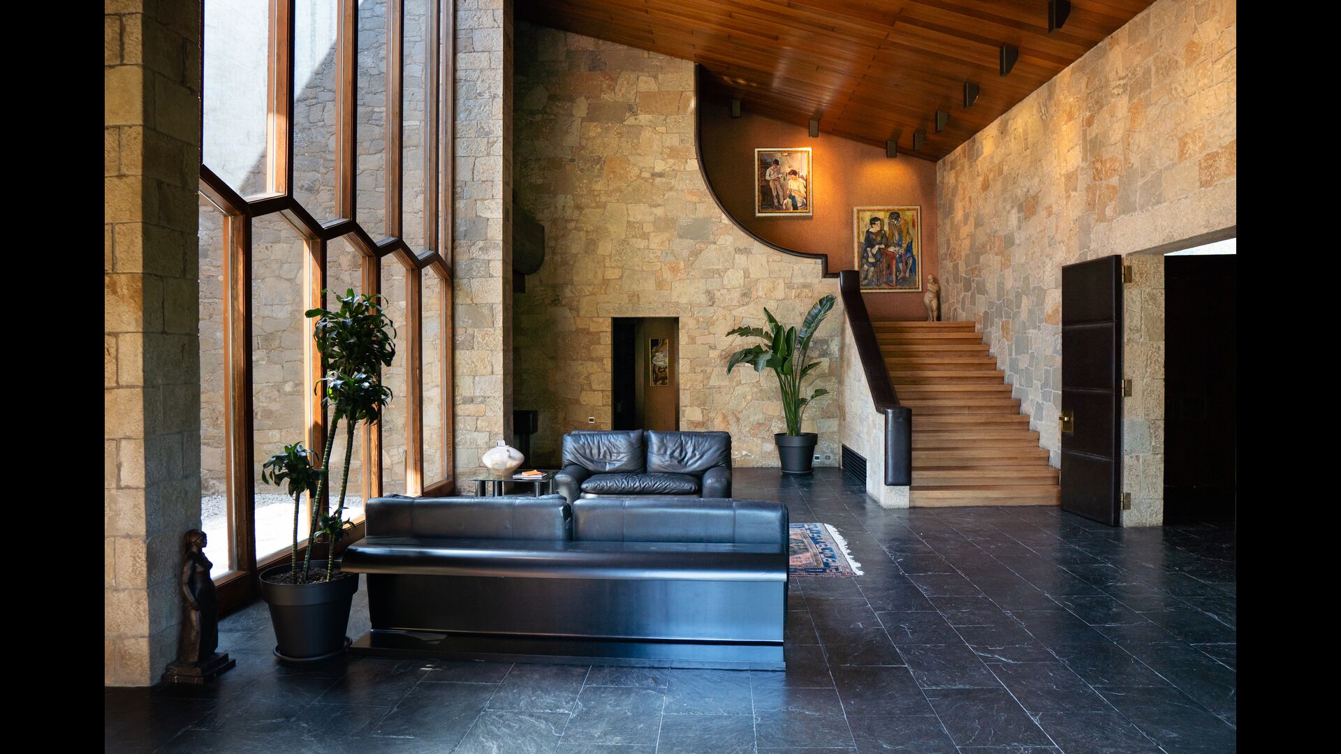 Inside, the house features inviting common areas, including a cozy lounge with a large fireplace, a private office space, and various terraces to take in the tranquil views. The combination of art, architecture, and nature makes this estate a perfect place to relax, work, or celebrate a special gathering.