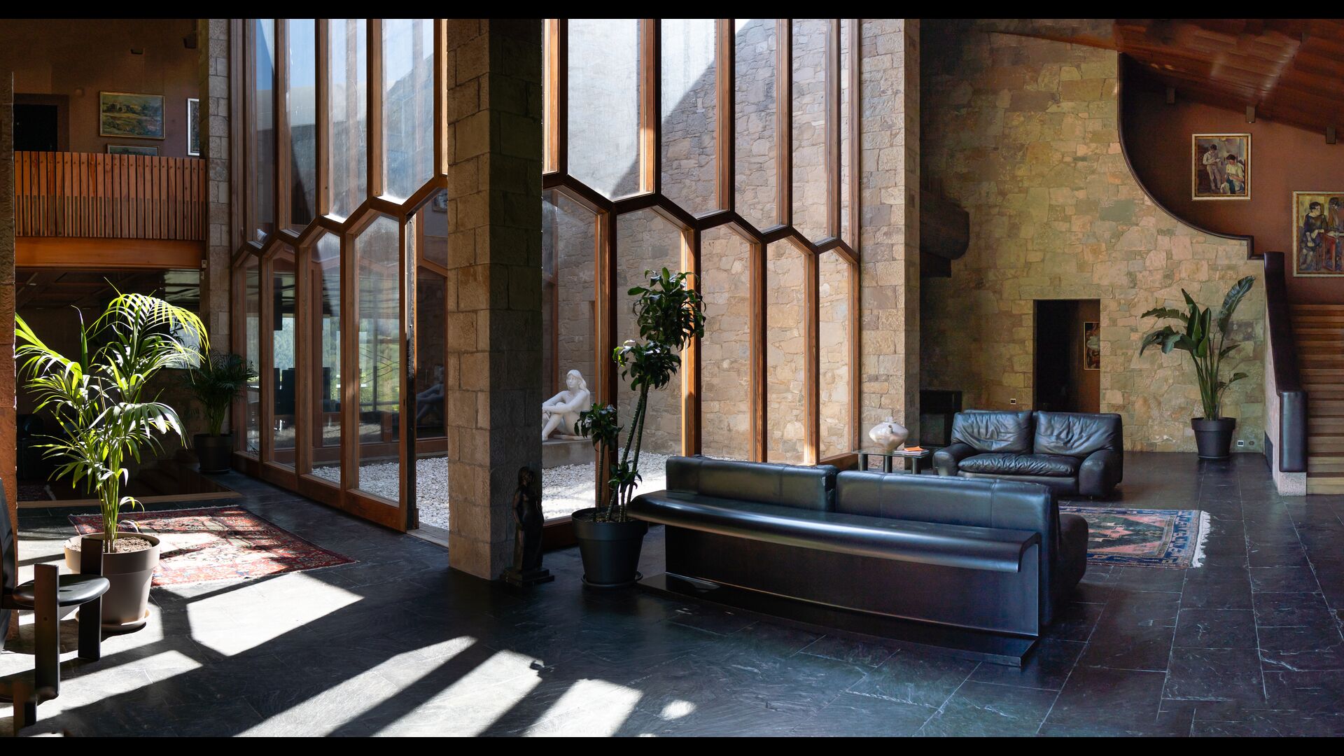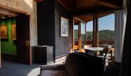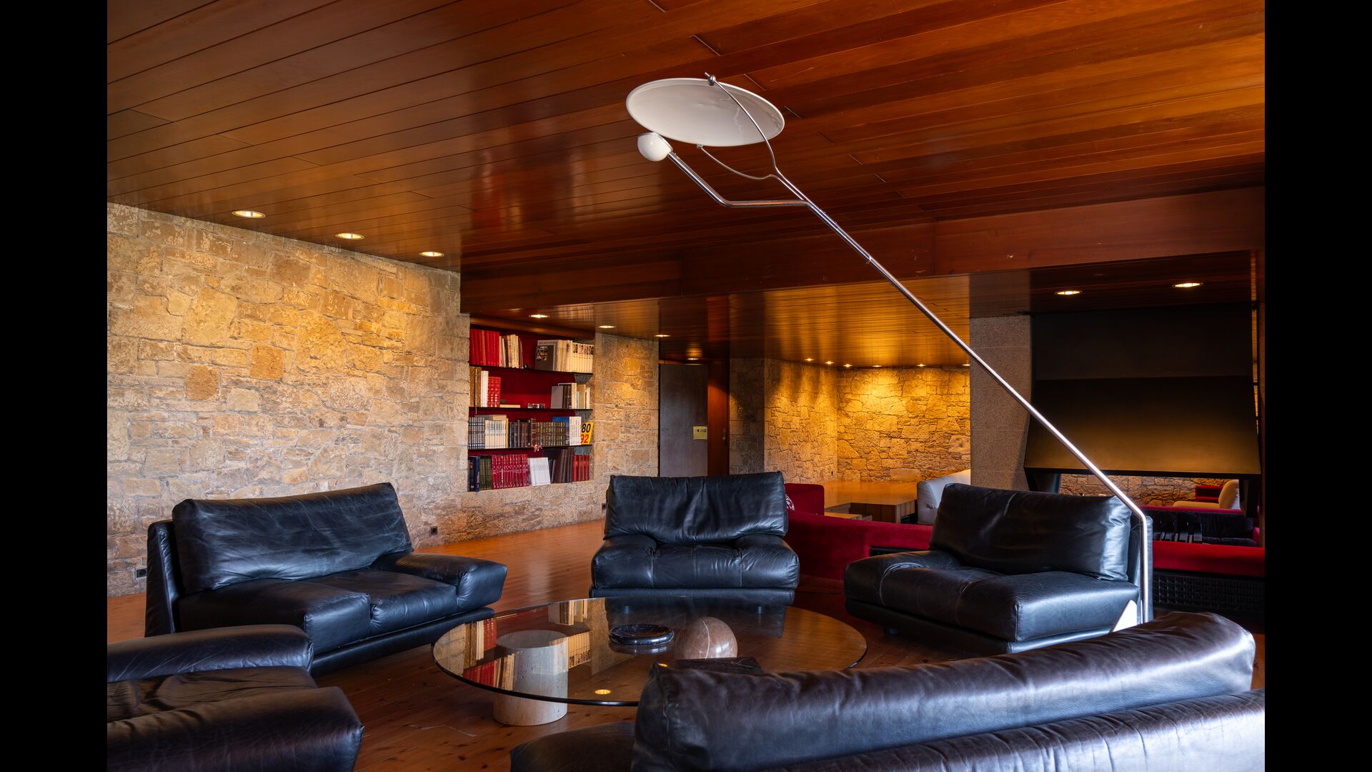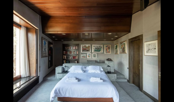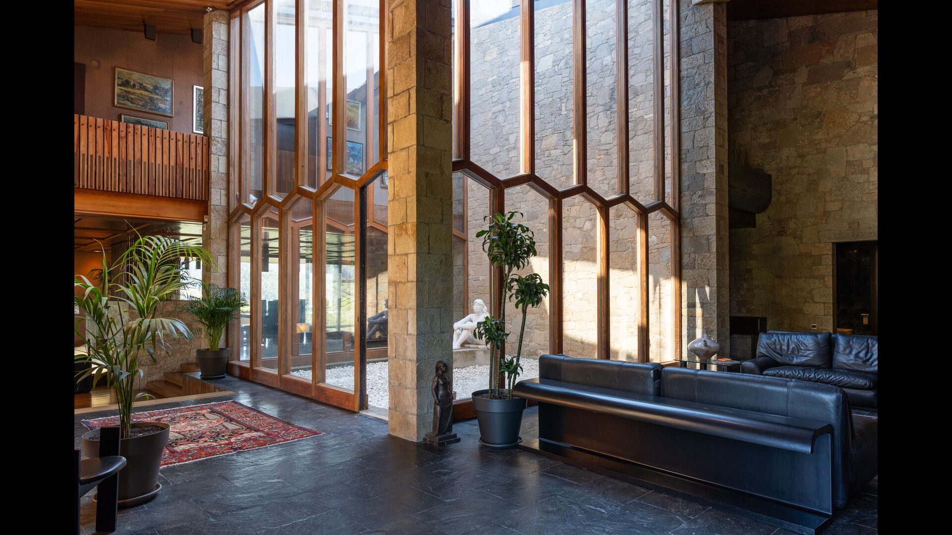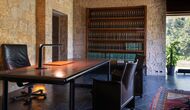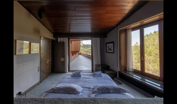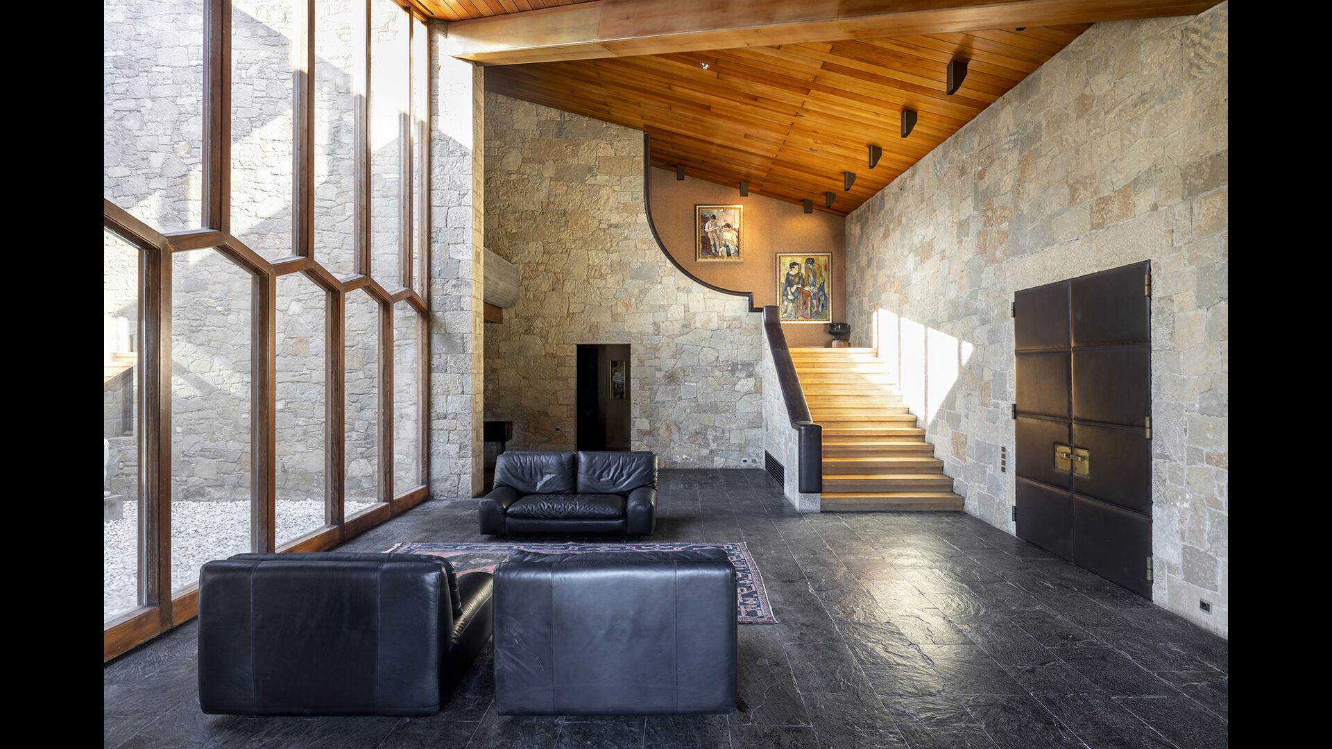 Inside, the house features inviting common areas, including a cozy lounge with a large fireplace, a private office space, and various terraces to take in the tranquil views. The combination of art, architecture, and nature makes this estate a perfect place to relax, work, or celebrate a special gathering.