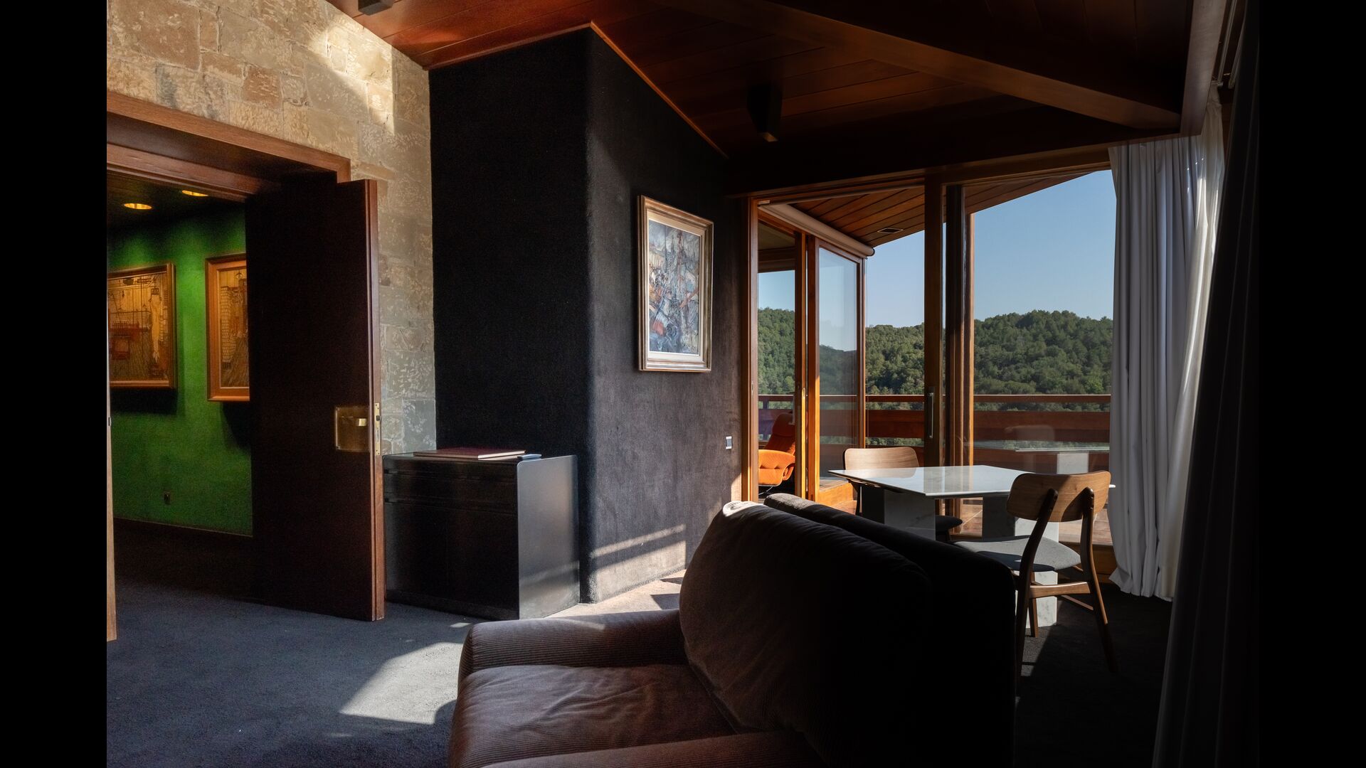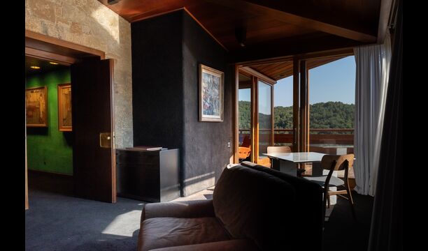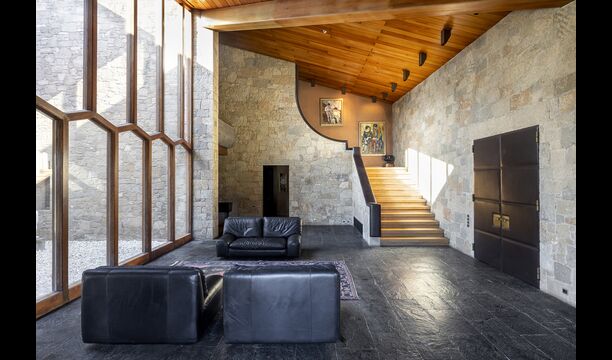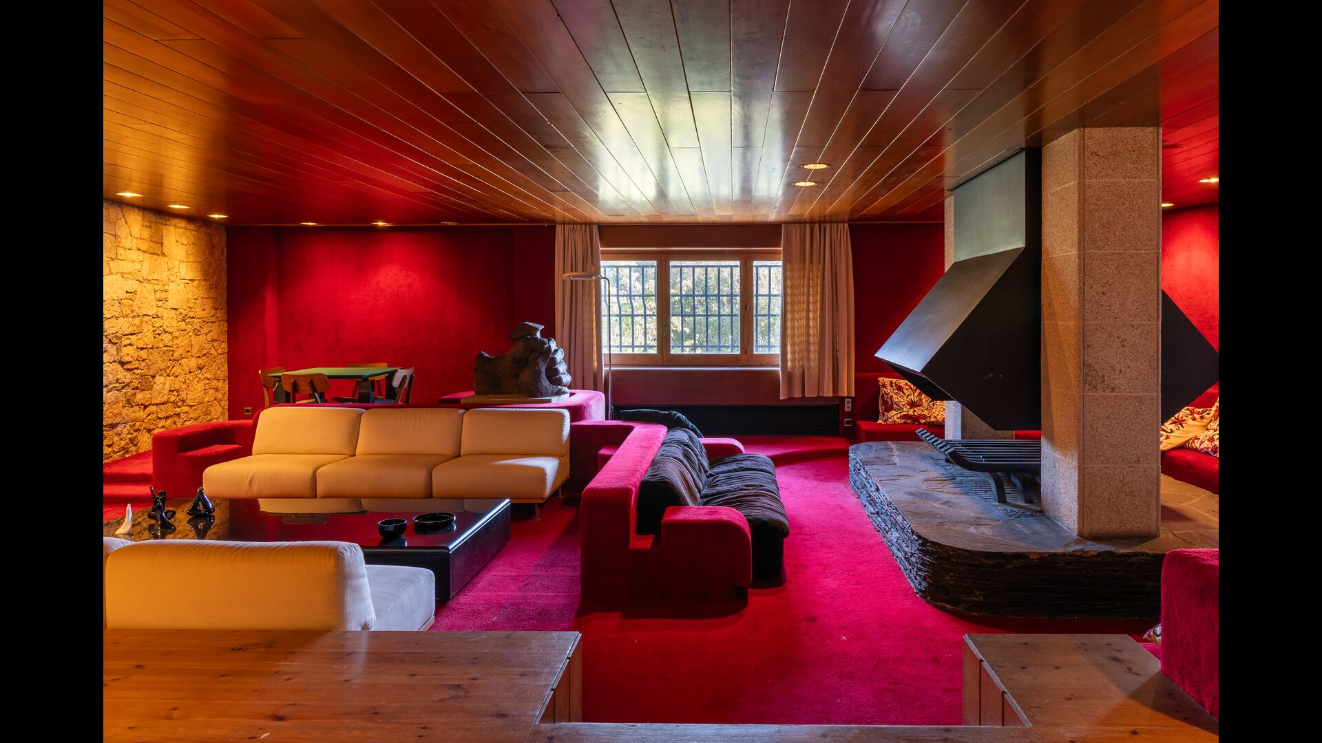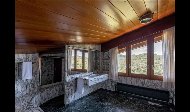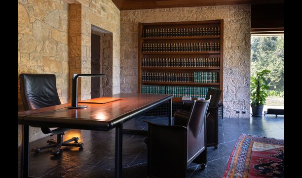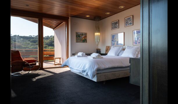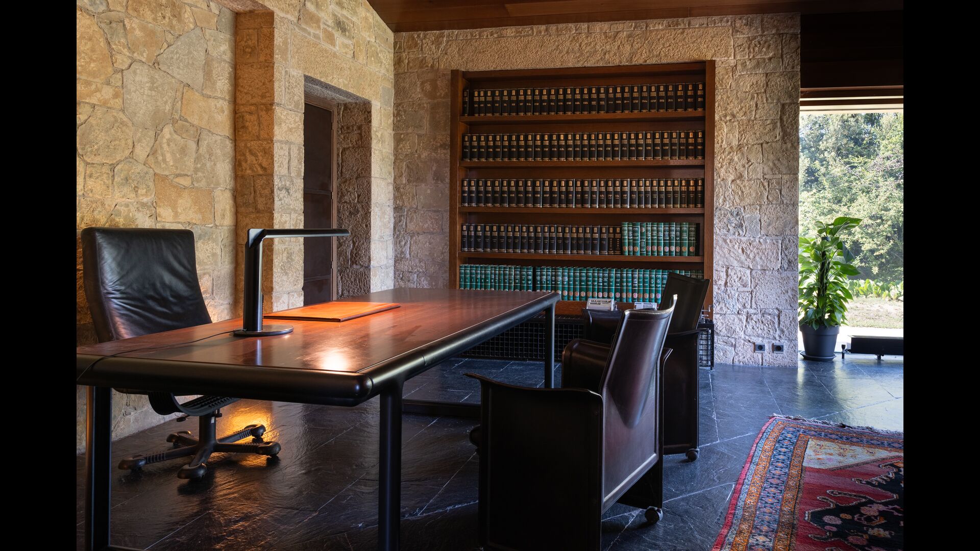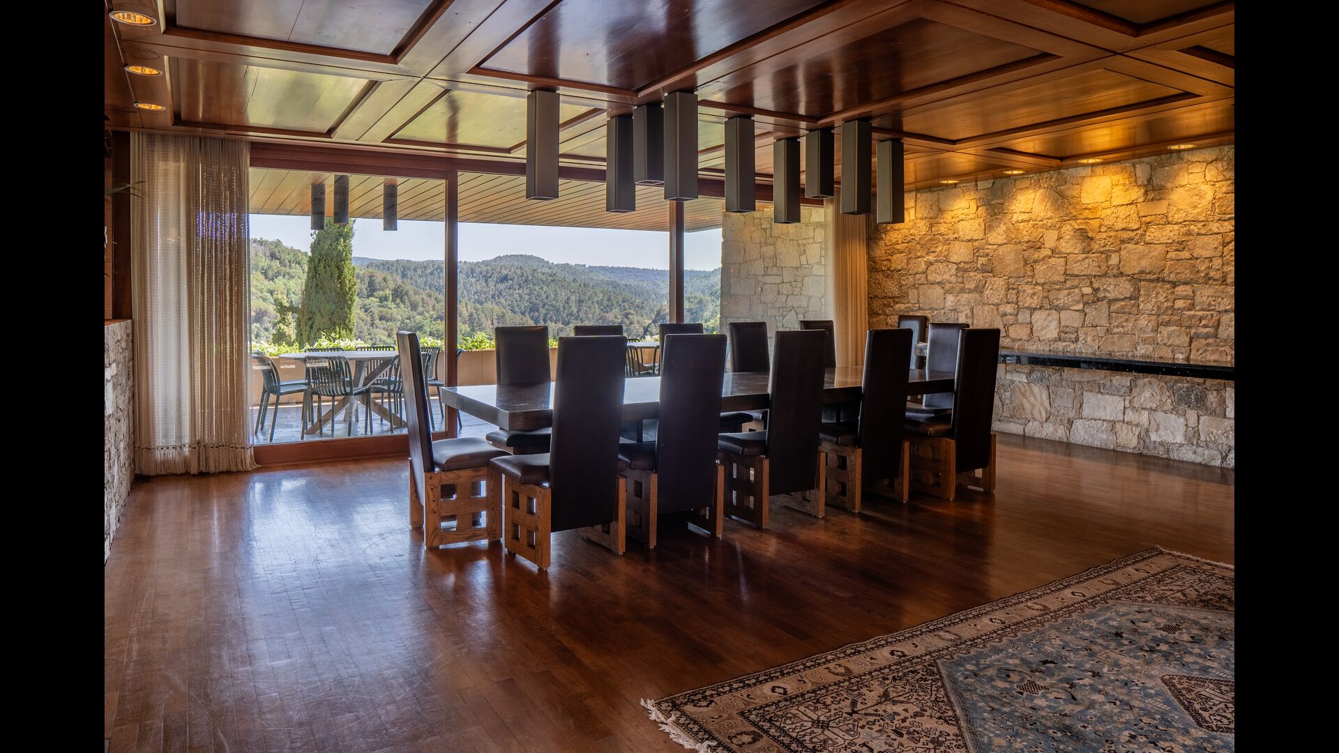 Inside, the house features inviting common areas, including a cozy lounge with a large fireplace, a private office space, and various terraces to take in the tranquil views. The combination of art, architecture, and nature makes this estate a perfect place to relax, work, or celebrate a special gathering.