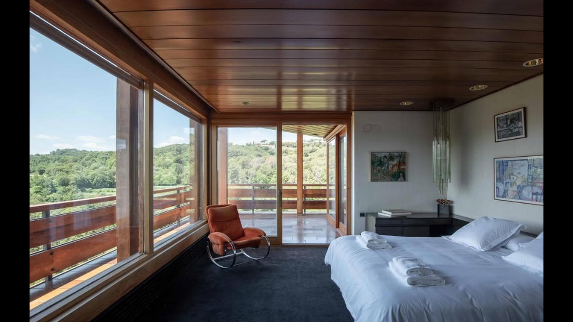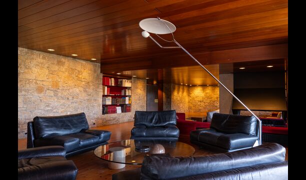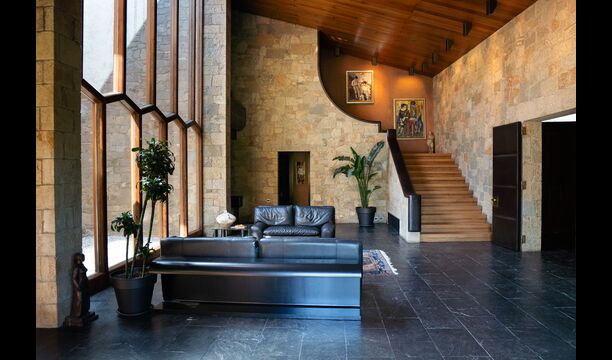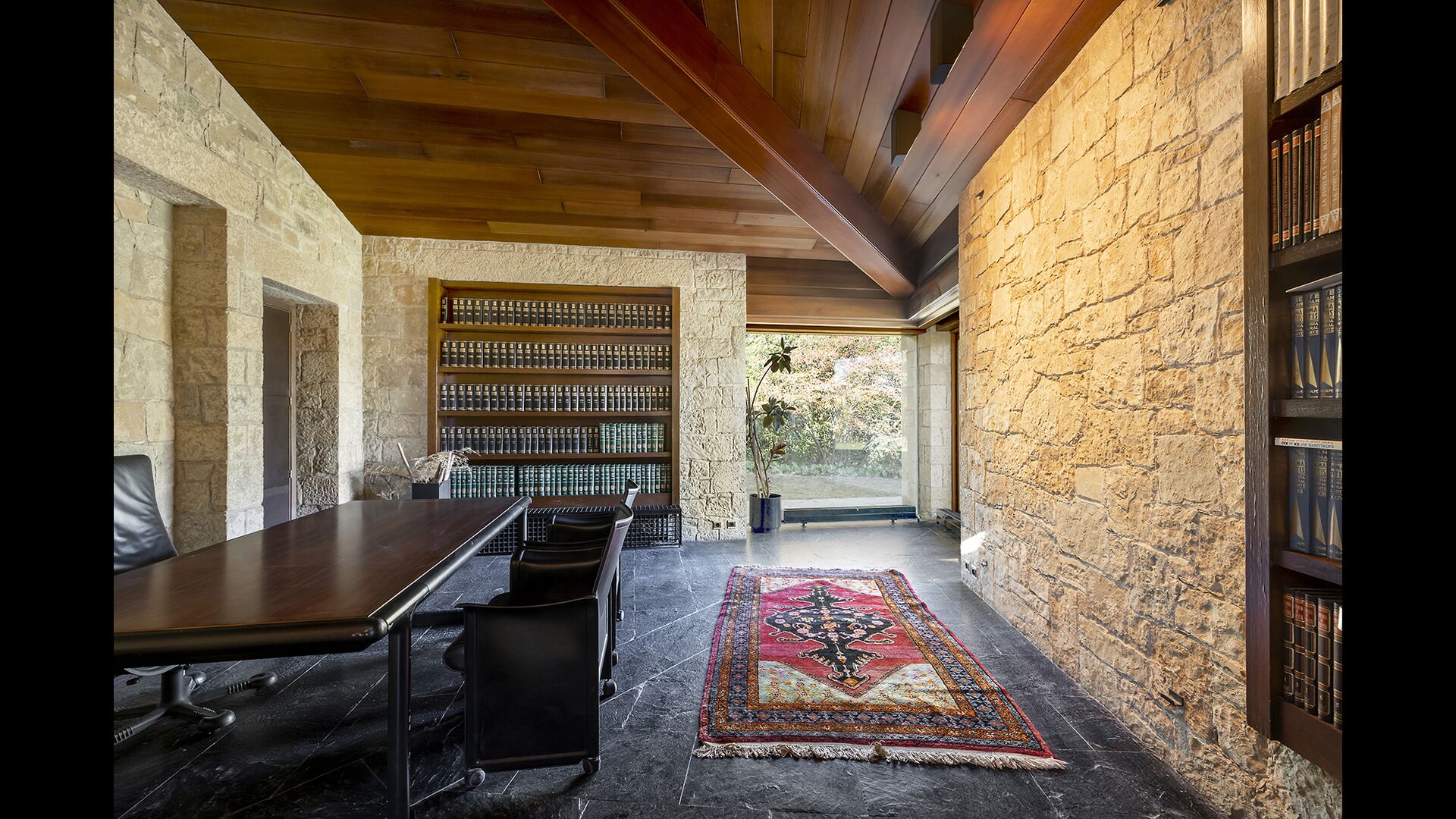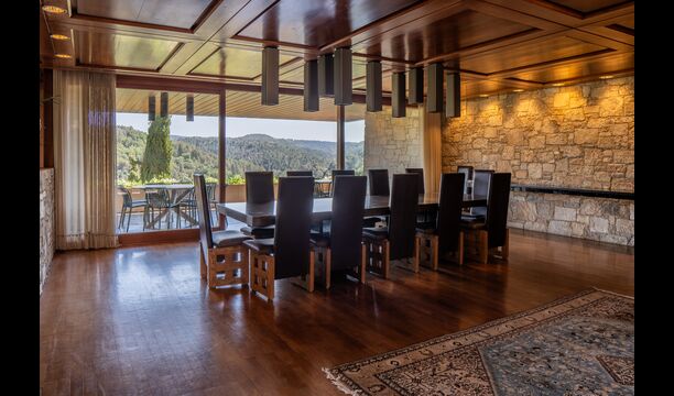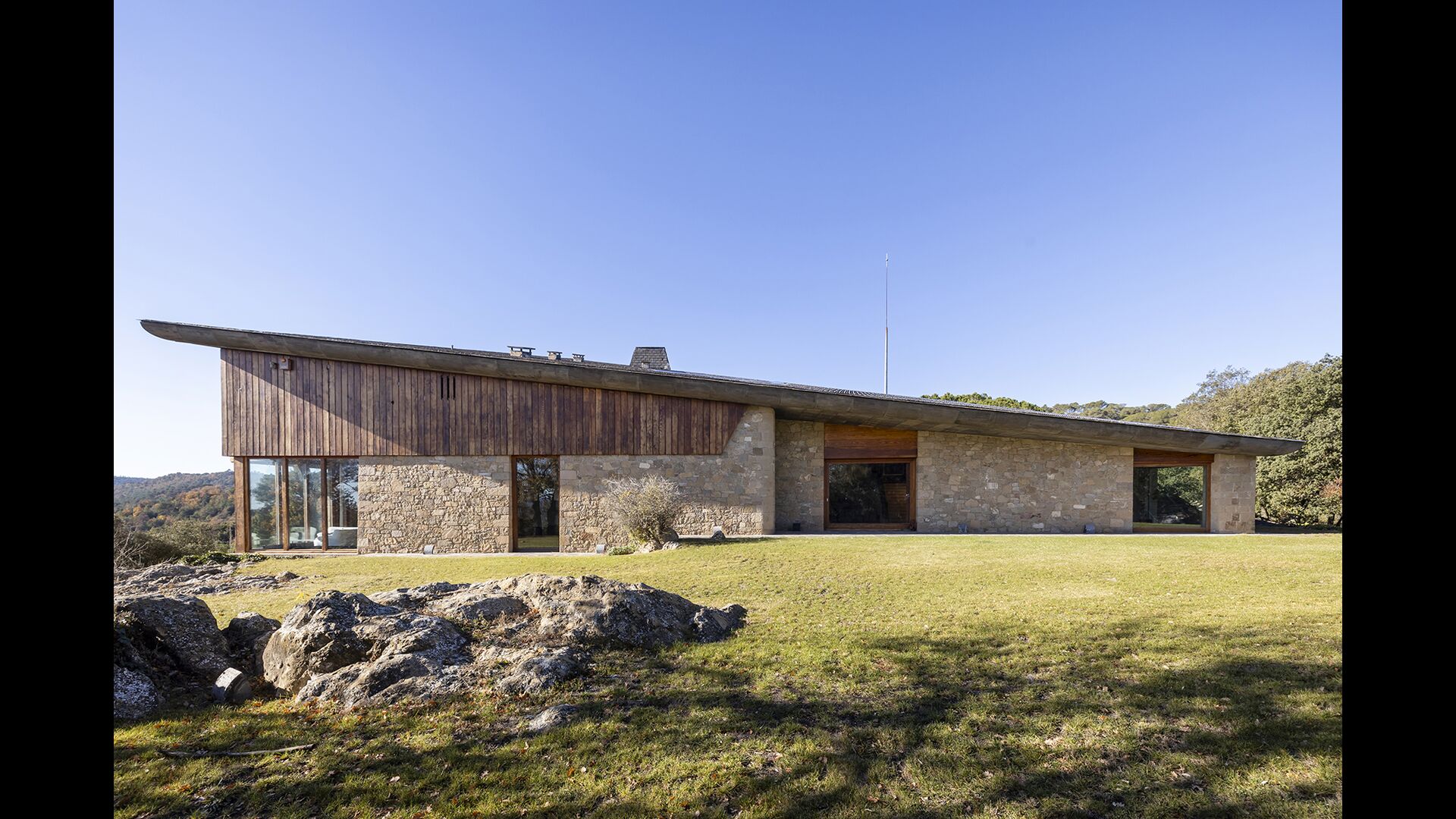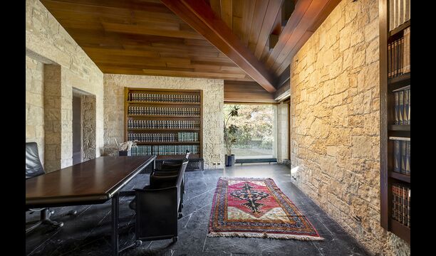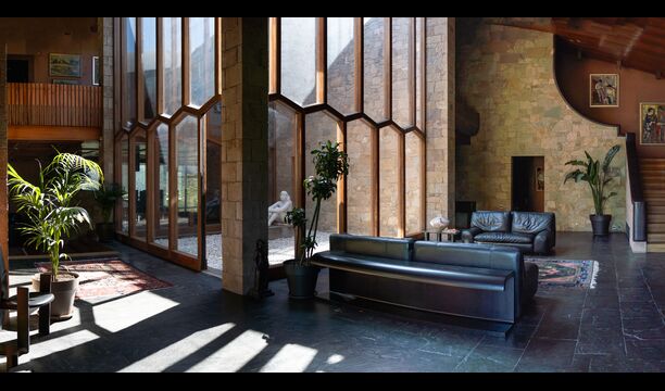 Inside, the house features inviting common areas, including a cozy lounge with a large fireplace, a private office space, and various terraces to take in the tranquil views. The combination of art, architecture, and nature makes this estate a perfect place to relax, work, or celebrate a special gathering.
