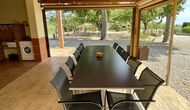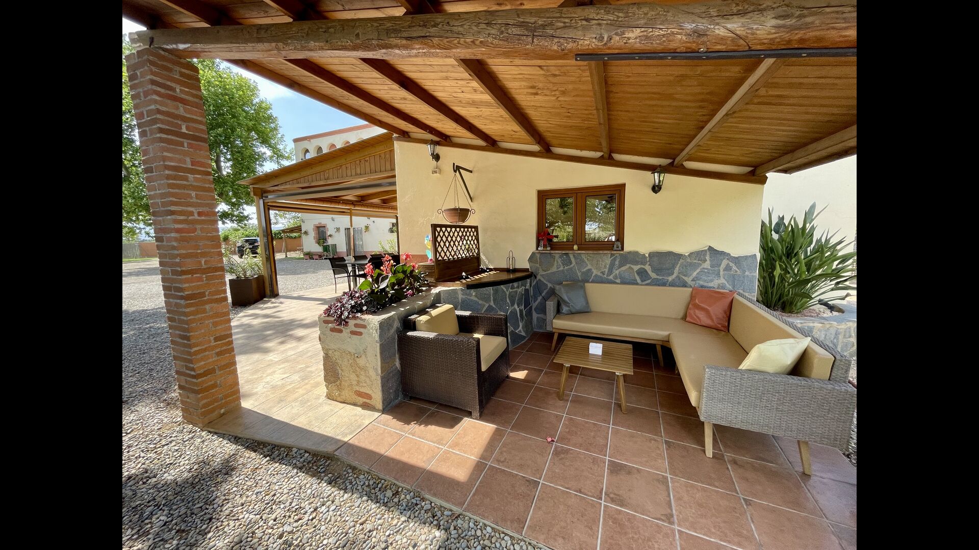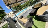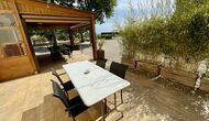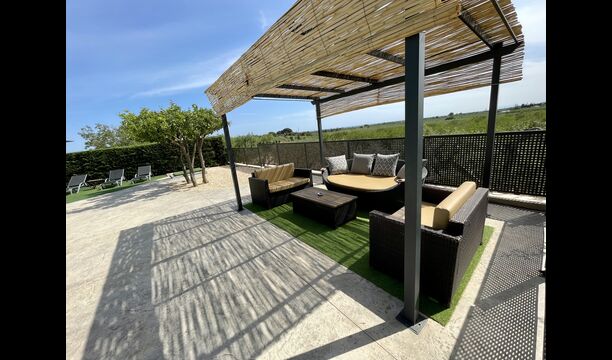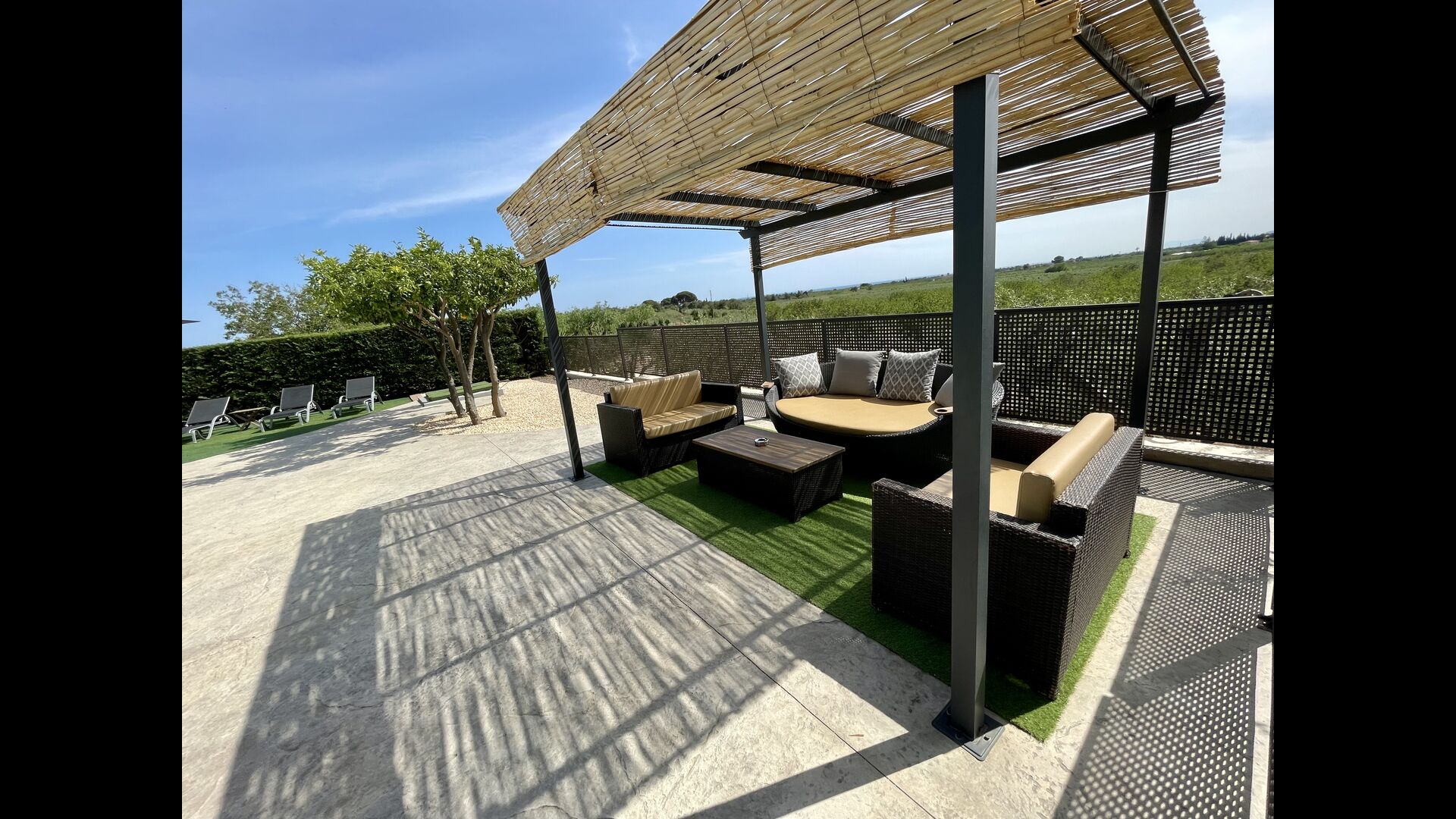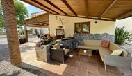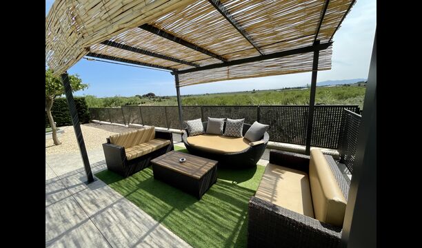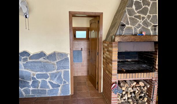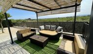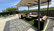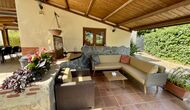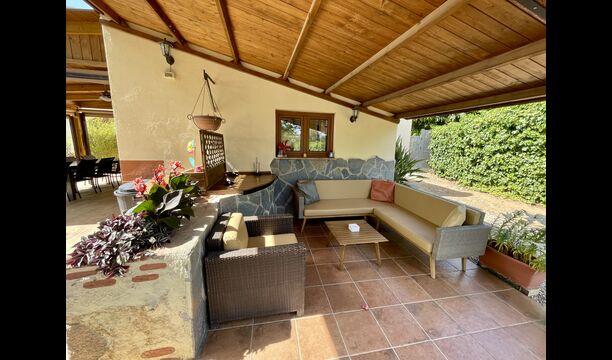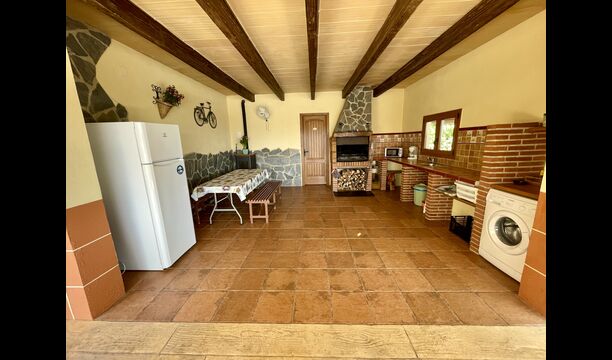 On the other side, there are two different terraces; one of them connected with the brilliant outdoor kitchen, coming with an enclosed barbecue BBQ, fridge, microwave, a sink, and the washing machine is also installed here. There is also a toilet, convenient when you are in the garden. Also in connection, there is a second outdoor sofa area with view of the playground.