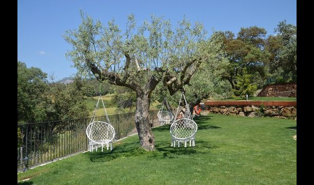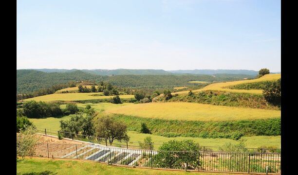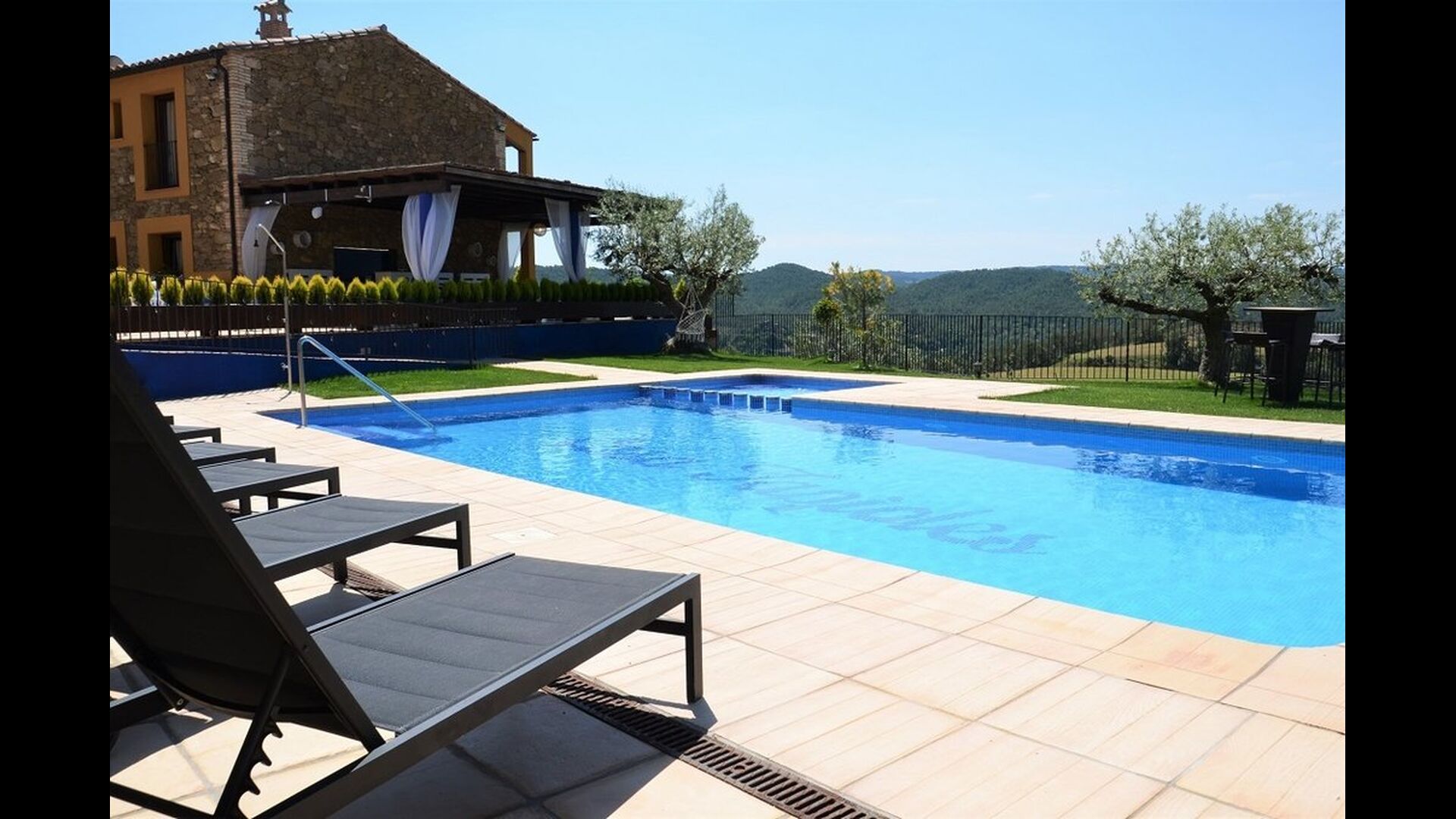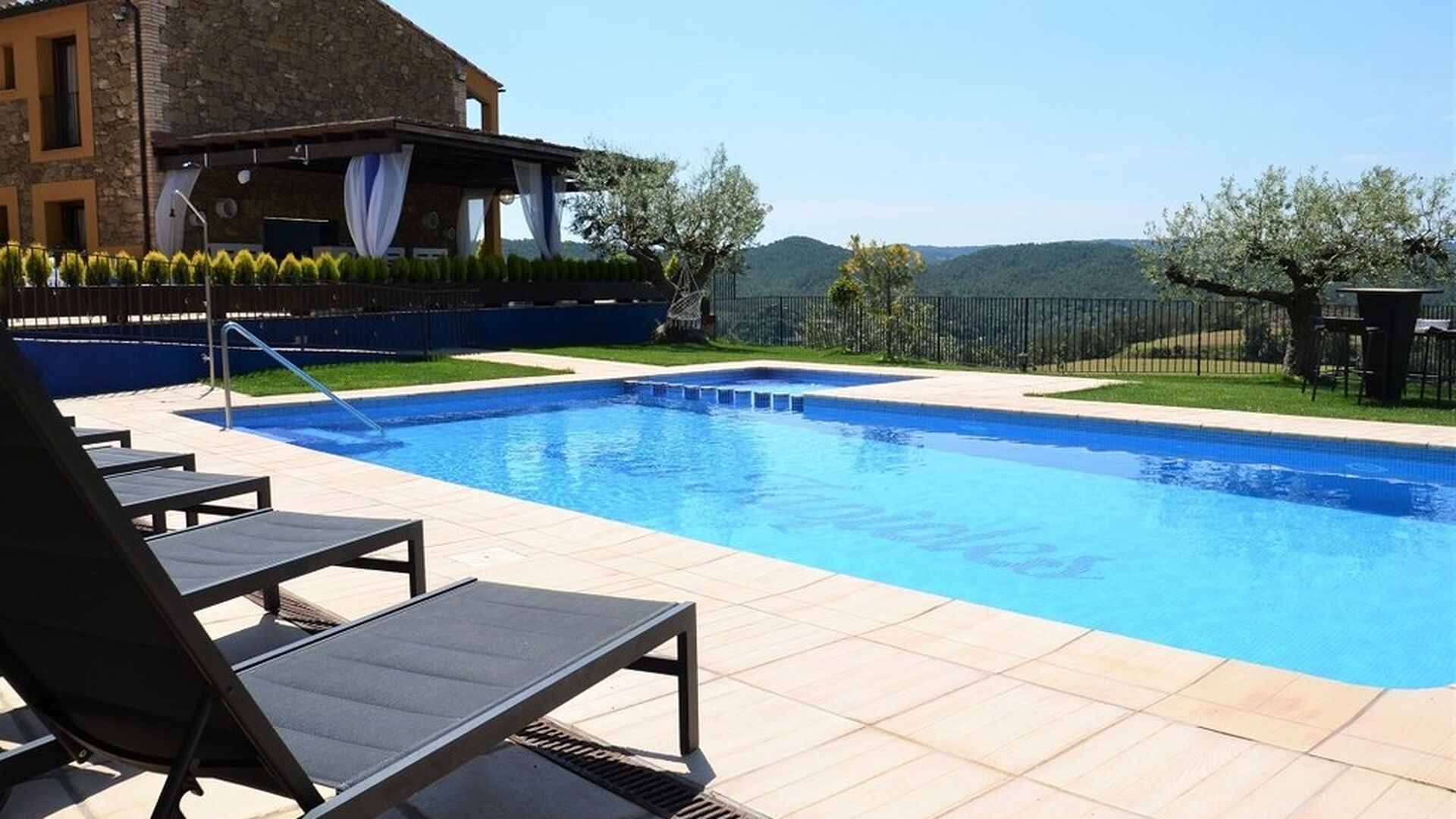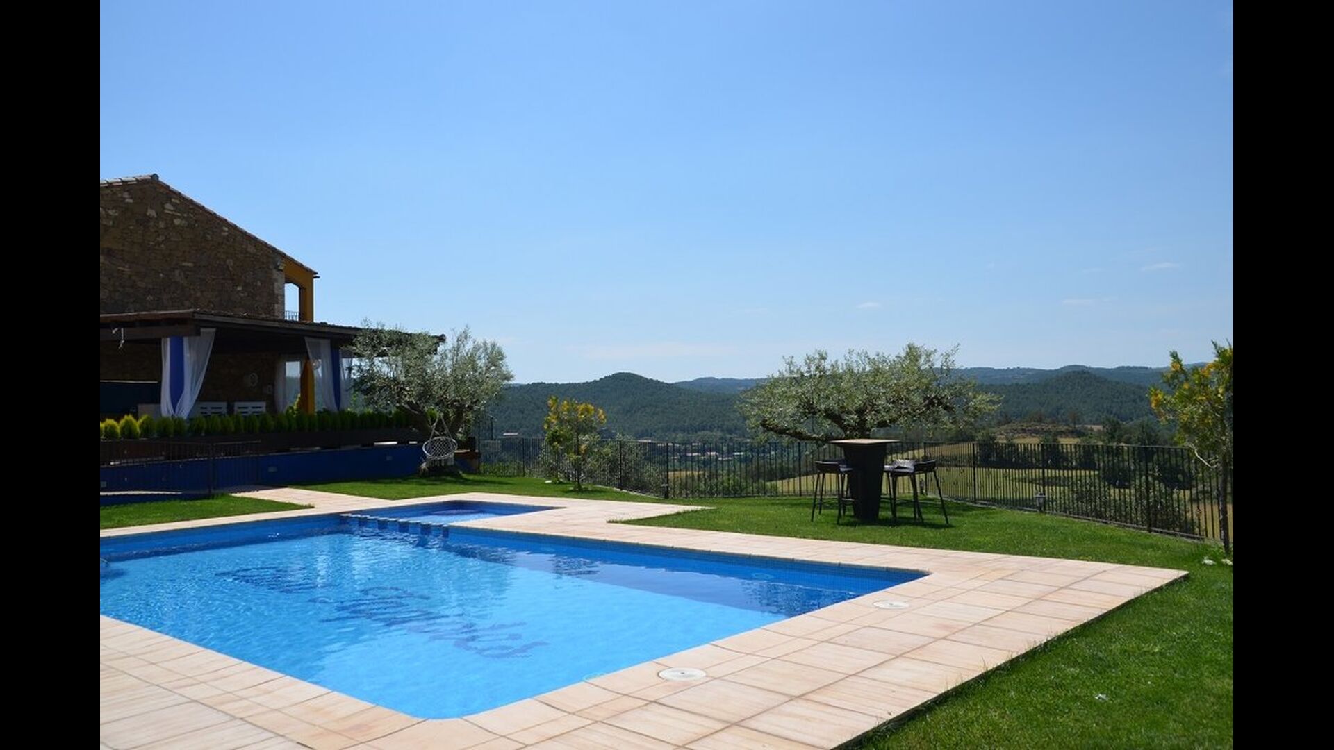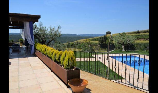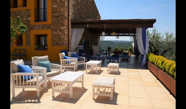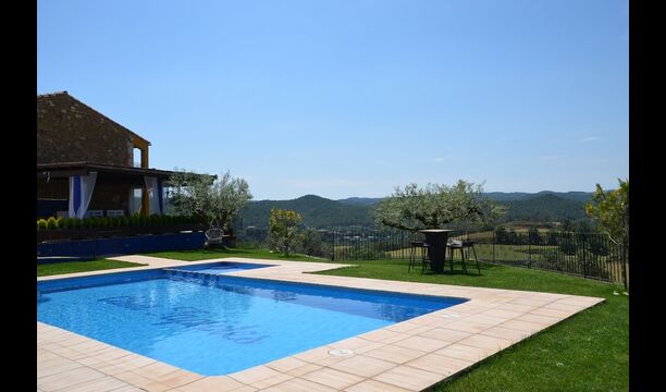 Casa Tagiales is a house with 330 m2 of space, which has been optimized to the wonderful Catalan summer through a wide range of chill-out zones and several outdoor facilities spread all over the large ground. Read a book in one of the smart hammock-chairs hanging from the trees, lay on one of mattresses on the terrace with music and bar within short range or make use of the Catalan sun from the deck chairs, etc. – the possibilities are endless. If the heat gets to you, keep in mind that there’s a large 10x5 meter pool right in front of you; of course fenced off and with an extra, shallower part for the younger ones in the group, so everyone can utilize the refreshing water. Talking of the smaller ones, there’s also a playing area with a trampoline, a sandbox, a slide and swings. Around and about the ground you’ll find multiple terraces, from where you’ll be able to enjoy the exceptional view of the surrounding Catalan countryside, where farmers farm and cows graze. A quite big part of the view actually belongs to the house – the ground stretches over an incredible 100 hectares.
