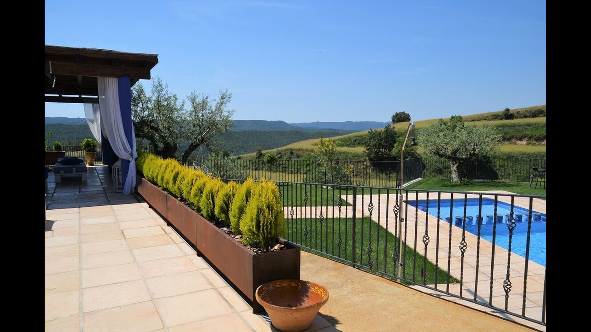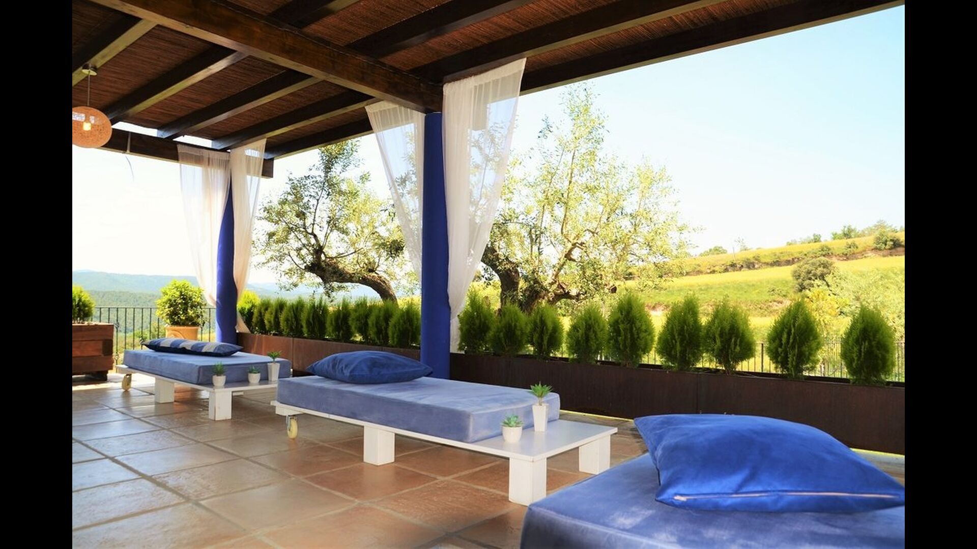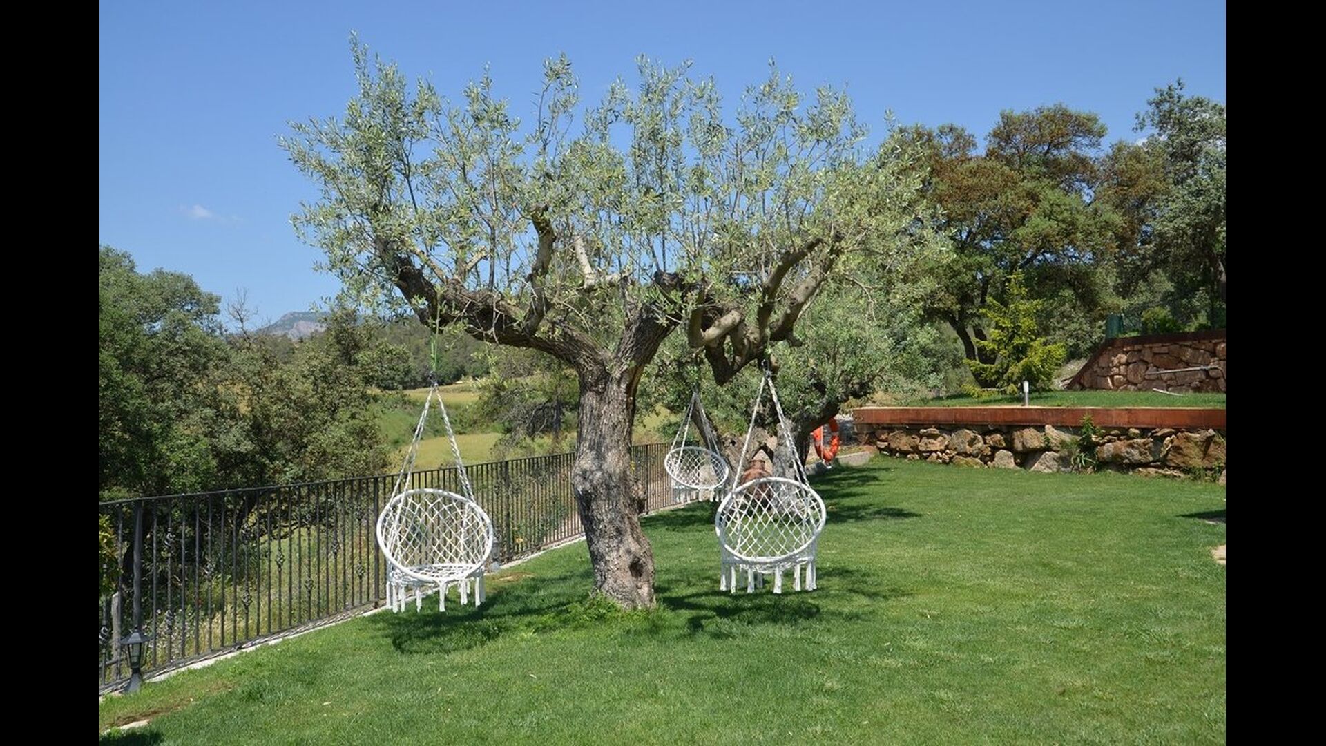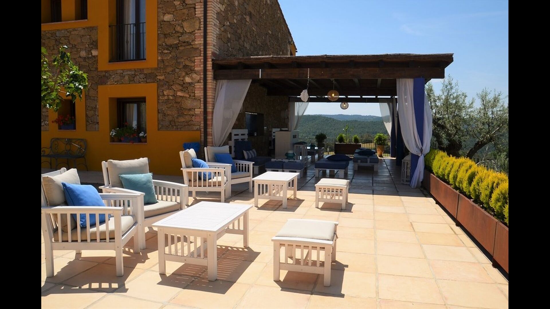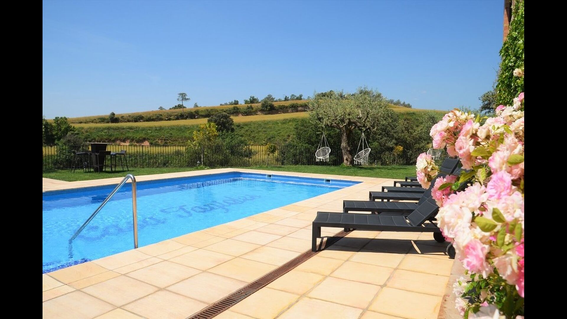 Casa Tagiales is a house with 330 m2 of space, which has been optimized to the wonderful Catalan summer through a wide range of chill-out zones and several outdoor facilities spread all over the large ground. Read a book in one of the smart hammock-chairs hanging from the trees, lay on one of mattresses on the terrace with music and bar within short range or make use of the Catalan sun from the deck chairs, etc. – the possibilities are endless. If the heat gets to you, keep in mind that there’s a large 10x5 meter pool right in front of you; of course fenced off and with an extra, shallower part for the younger ones in the group, so everyone can utilize the refreshing water. Talking of the smaller ones, there’s also a playing area with a trampoline, a sandbox, a slide and swings. Around and about the ground you’ll find multiple terraces, from where you’ll be able to enjoy the exceptional view of the surrounding Catalan countryside, where farmers farm and cows graze. A quite big part of the view actually belongs to the house – the ground stretches over an incredible 100 hectares.