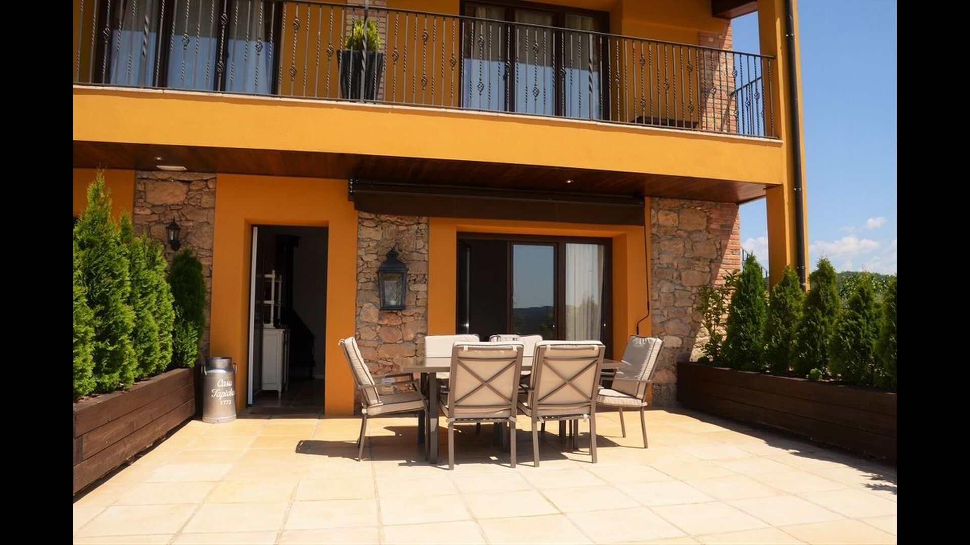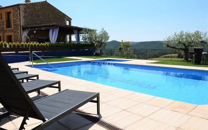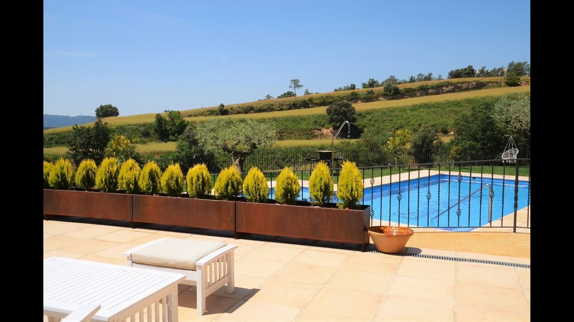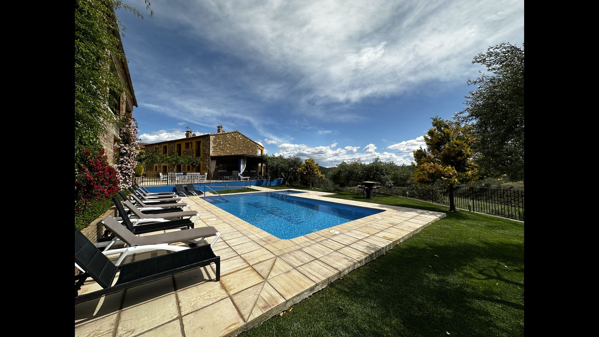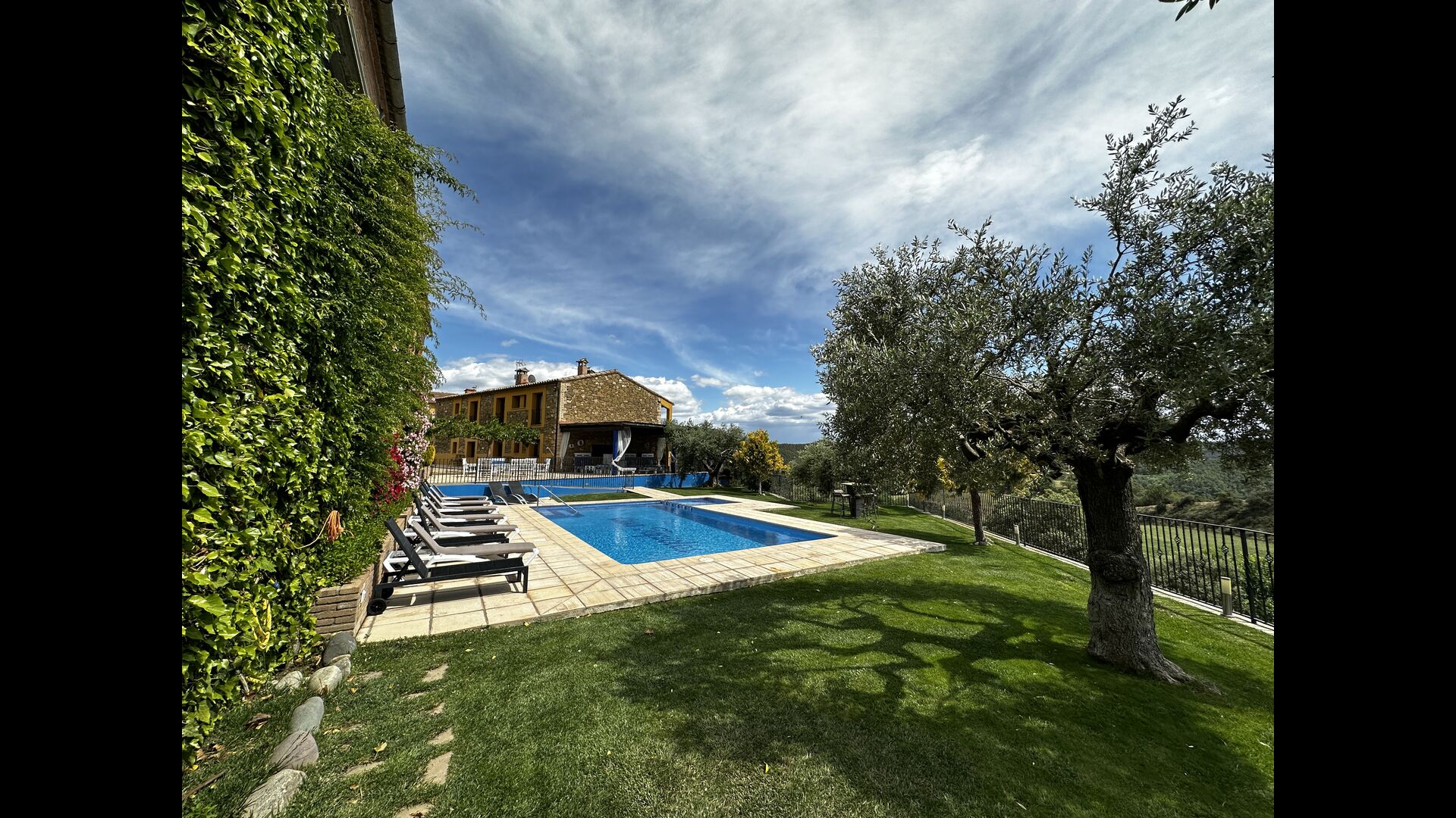 Casa Tagiales is a house with 330 m2 of space, which has been optimized to the wonderful Catalan summer through a wide range of chill-out zones and several outdoor facilities spread all over the large ground. Read a book in one of the smart hammock-chairs hanging from the trees, lay on one of mattresses on the terrace with music and bar within short range or make use of the Catalan sun from the deck chairs, etc. – the possibilities are endless. If the heat gets to you, keep in mind that there’s a large 10x5 meter pool right in front of you; of course fenced off and with an extra, shallower part for the younger ones in the group, so everyone can utilize the refreshing water. Talking of the smaller ones, there’s also a playing area with a trampoline, a sandbox, a slide and swings. Around and about the ground you’ll find multiple terraces, from where you’ll be able to enjoy the exceptional view of the surrounding Catalan countryside, where farmers farm and cows graze. A quite big part of the view actually belongs to the house – the ground stretches over an incredible 100 hectares.