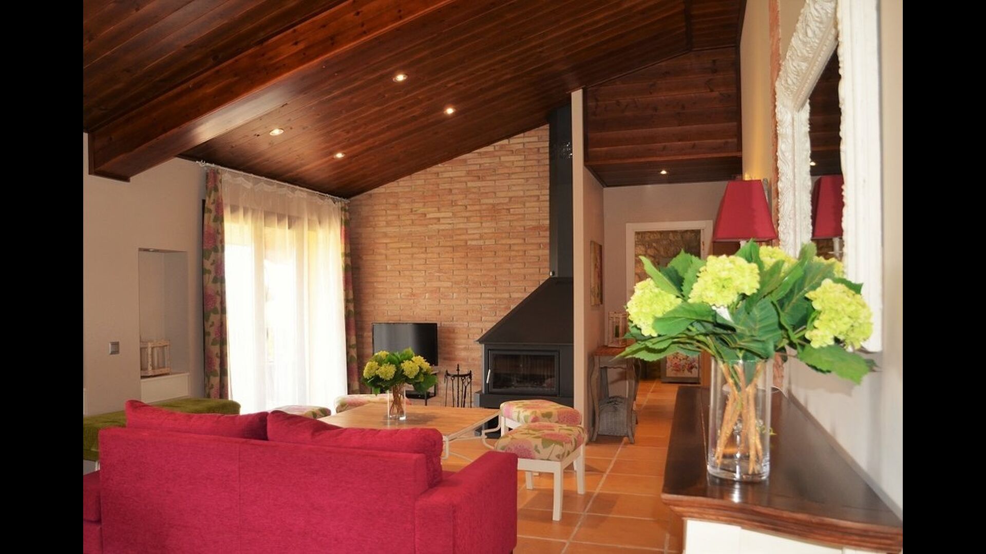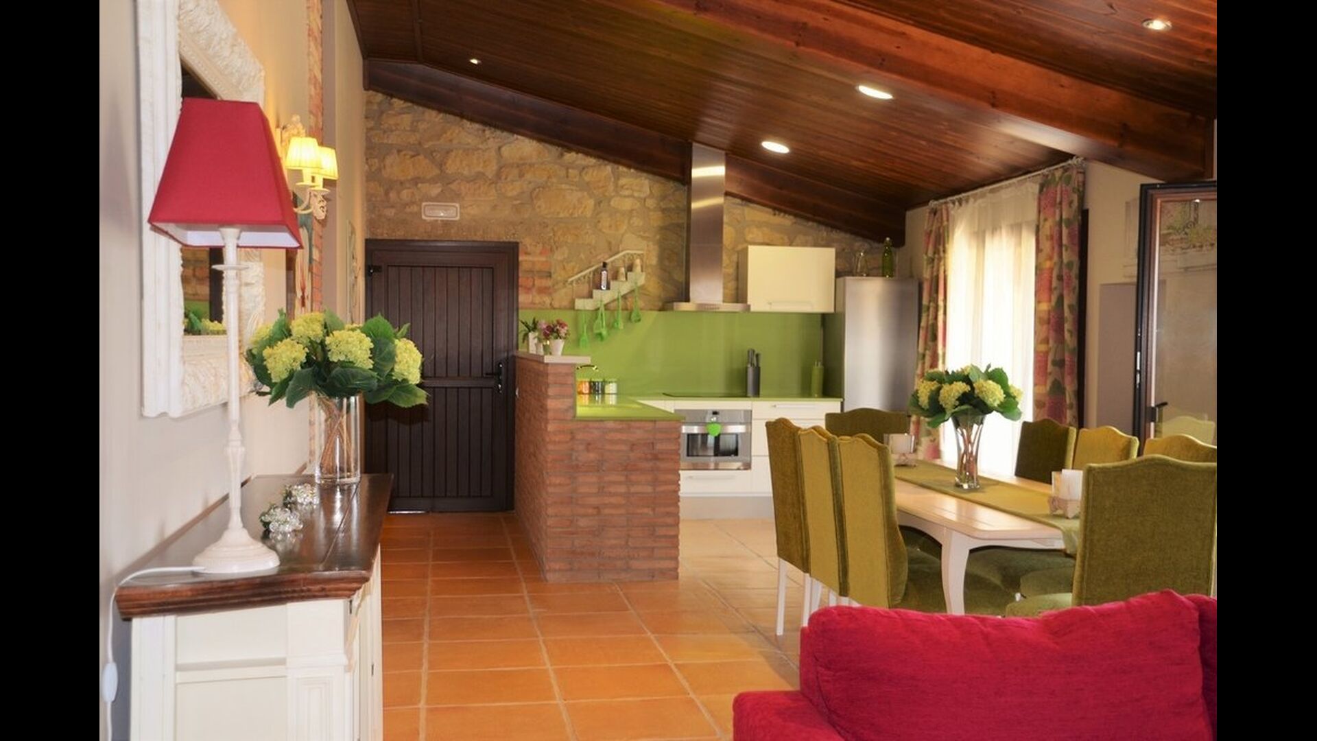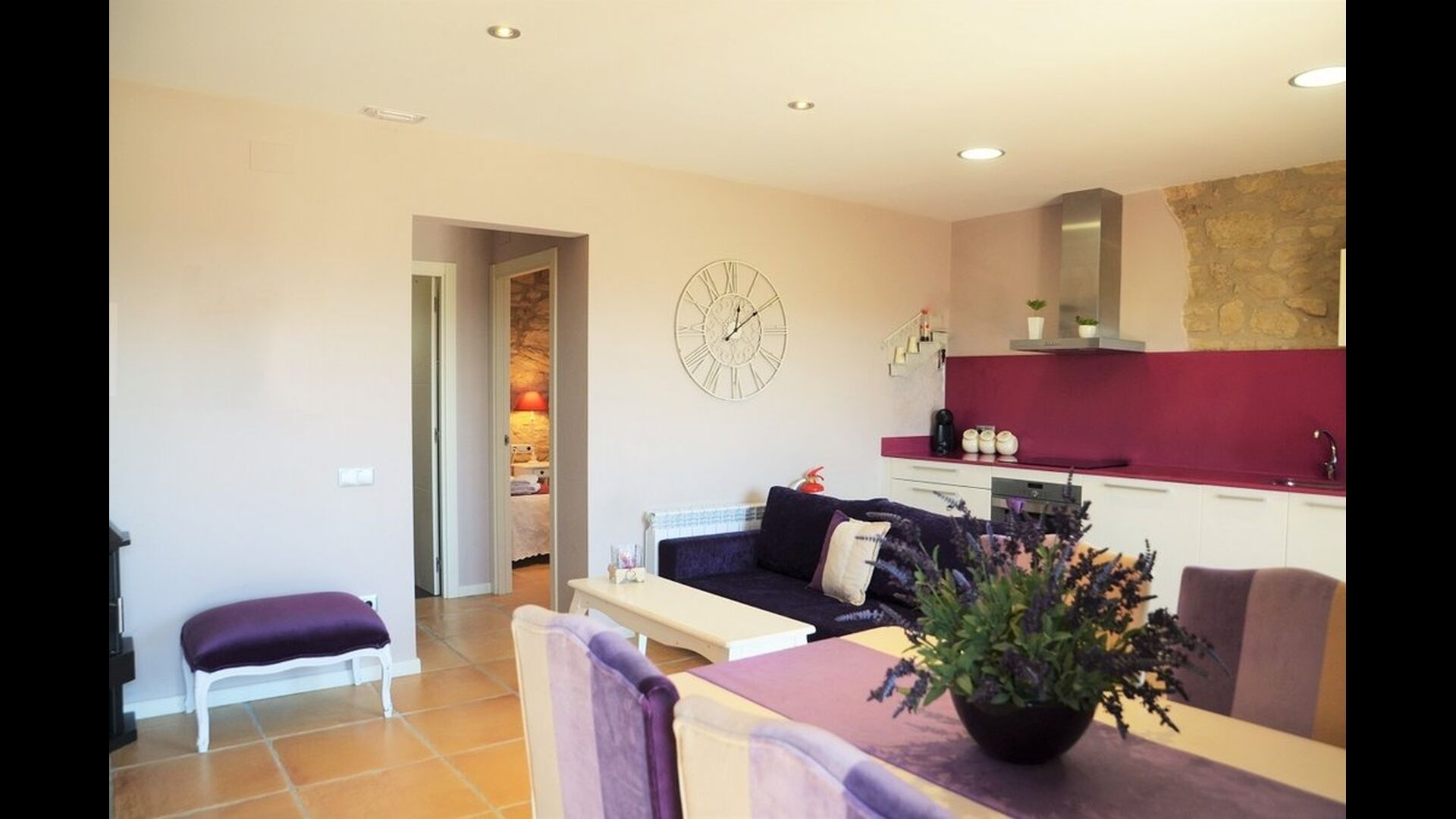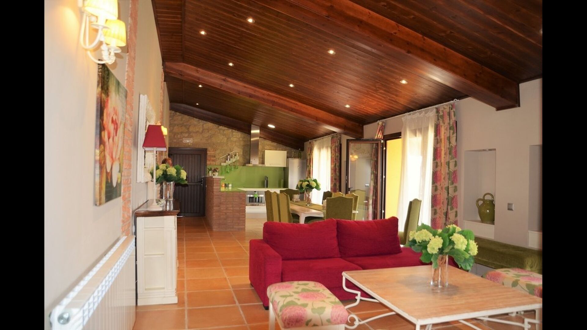 If you continue into the colorful house through one of the 3 entrances to each of the 3 parts of the house, you’ll quickly notice the untraditional style, in which the house is designed. The owners of the house have put a lot of effort in to the fascinating, richly colored arrangement that combines the colorful Spanish modernism with the modern. The house consists, as mentioned, of 3 parts, whereas the smallest one can fit 4 persons distributed onto 2 double rooms with respectively 2 single beds and 1 doublebed, the midmost one can accommodate 6 persons in 3 double rooms with 4 single beds and 2 double beds in total, and the largest one has room for 10 persons in 5 double rooms with 3 double beds and 4 single beds in total (not including the extra beds).
