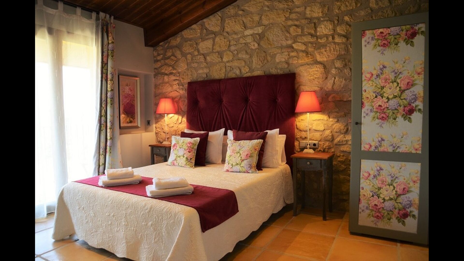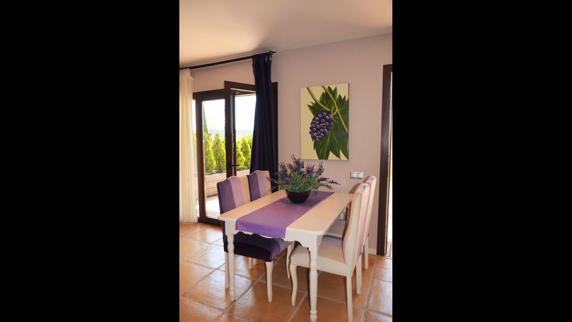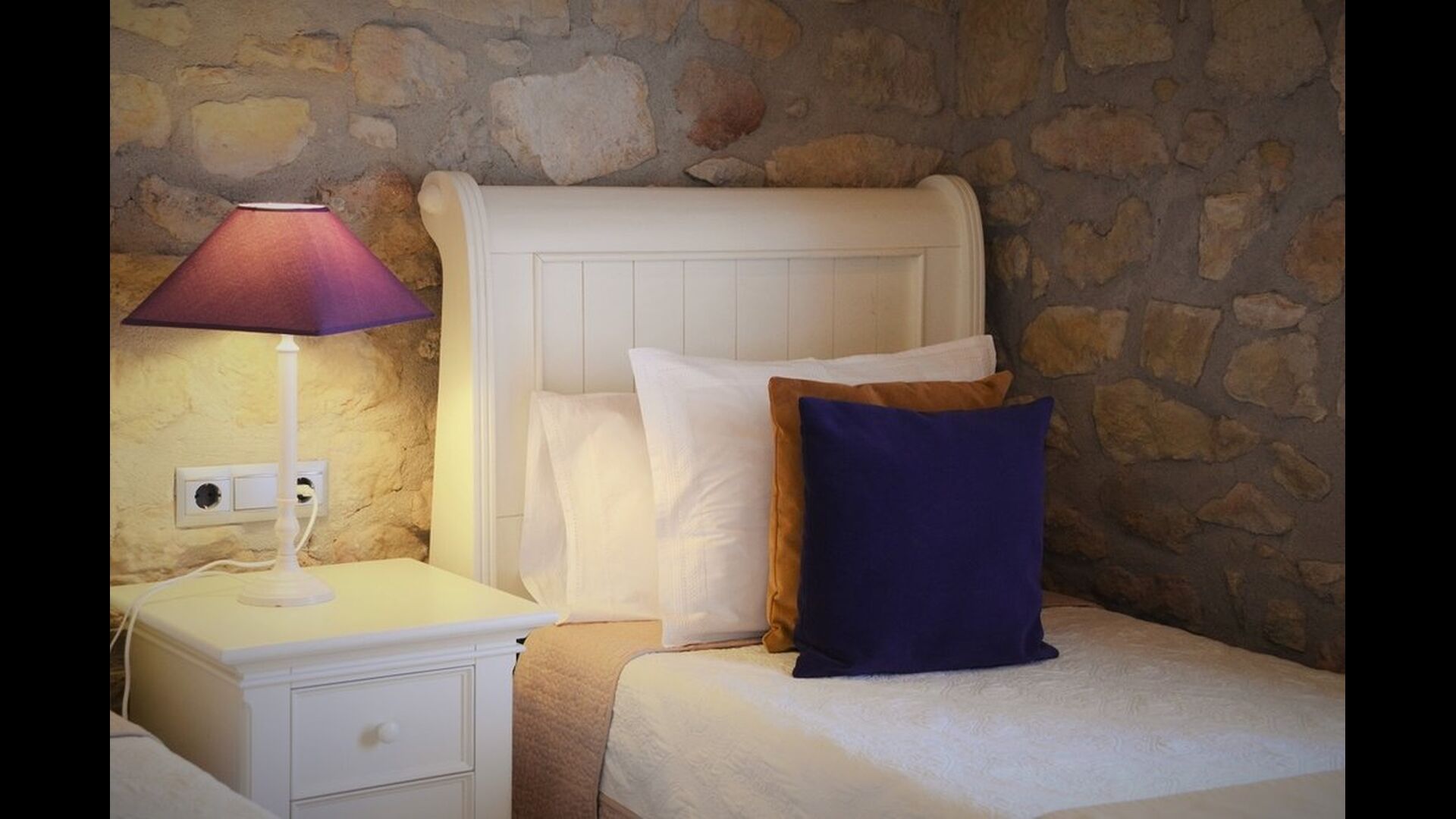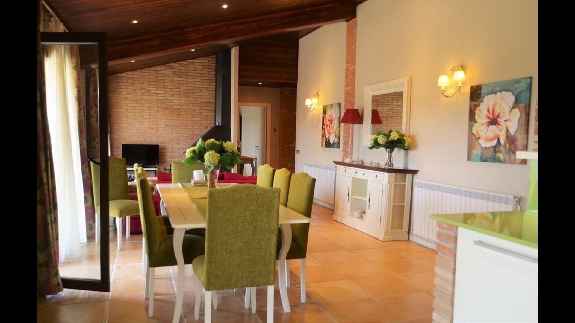 If you continue into the colorful house through one of the 3 entrances to each of the 3 parts of the house, you’ll quickly notice the untraditional style, in which the house is designed. The owners of the house have put a lot of effort in to the fascinating, richly colored arrangement that combines the colorful Spanish modernism with the modern. The house consists, as mentioned, of 3 parts, whereas the smallest one can fit 4 persons distributed onto 2 double rooms with respectively 2 single beds and 1 doublebed, the midmost one can accommodate 6 persons in 3 double rooms with 4 single beds and 2 double beds in total, and the largest one has room for 10 persons in 5 double rooms with 3 double beds and 4 single beds in total (not including the extra beds).