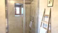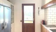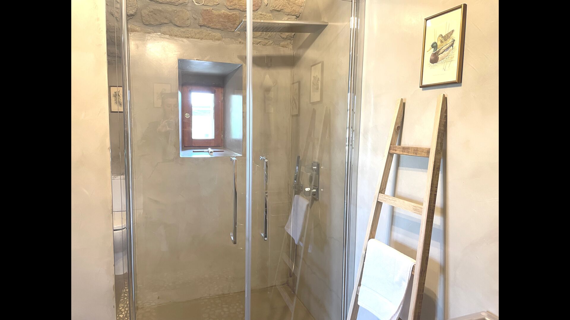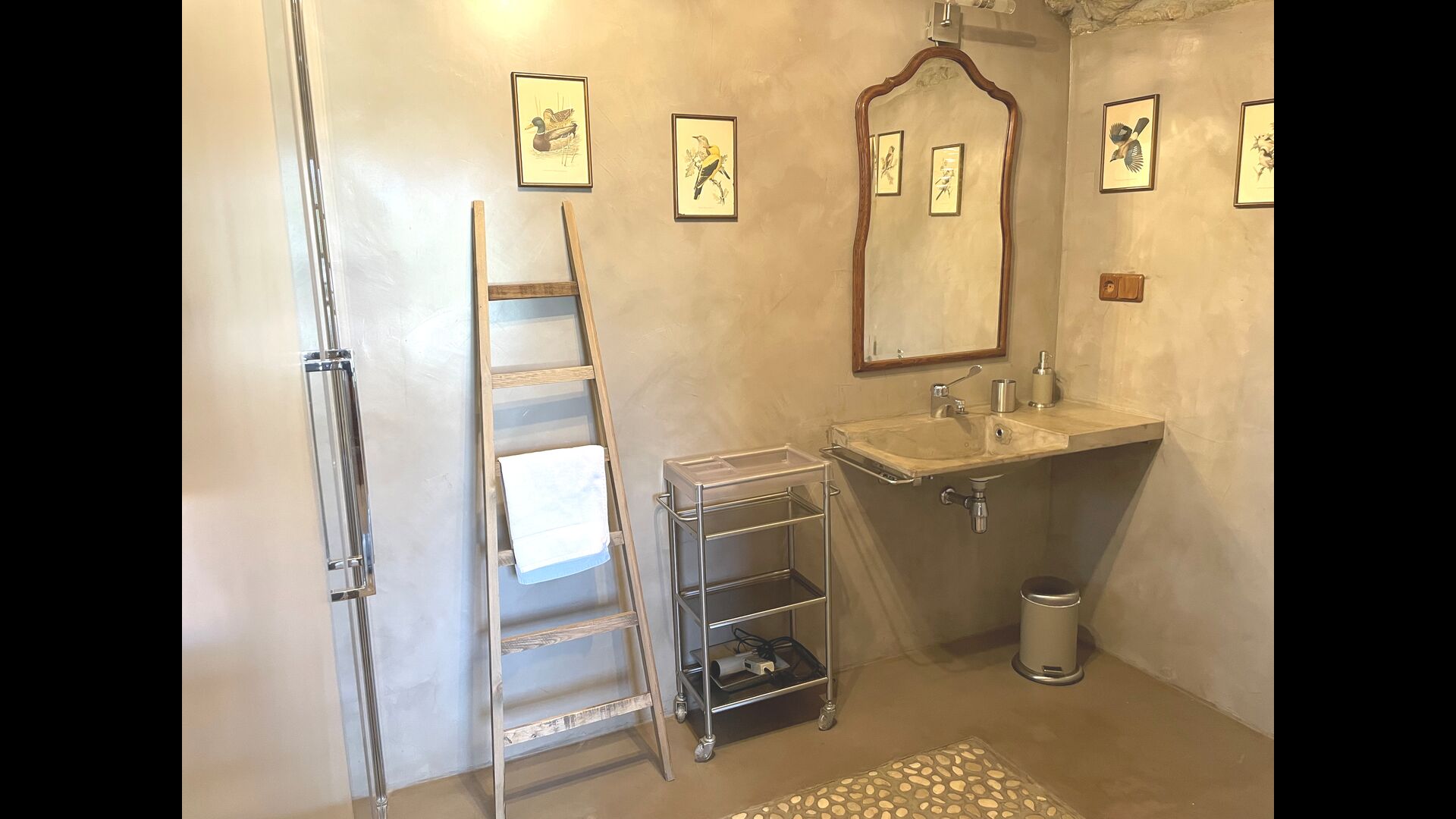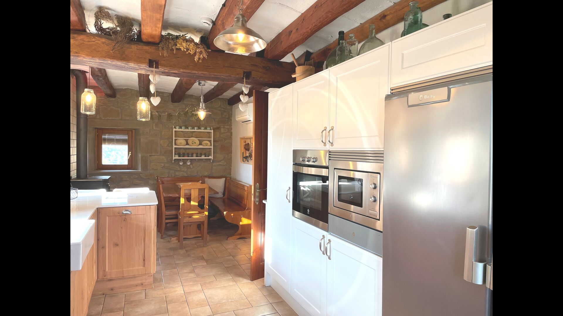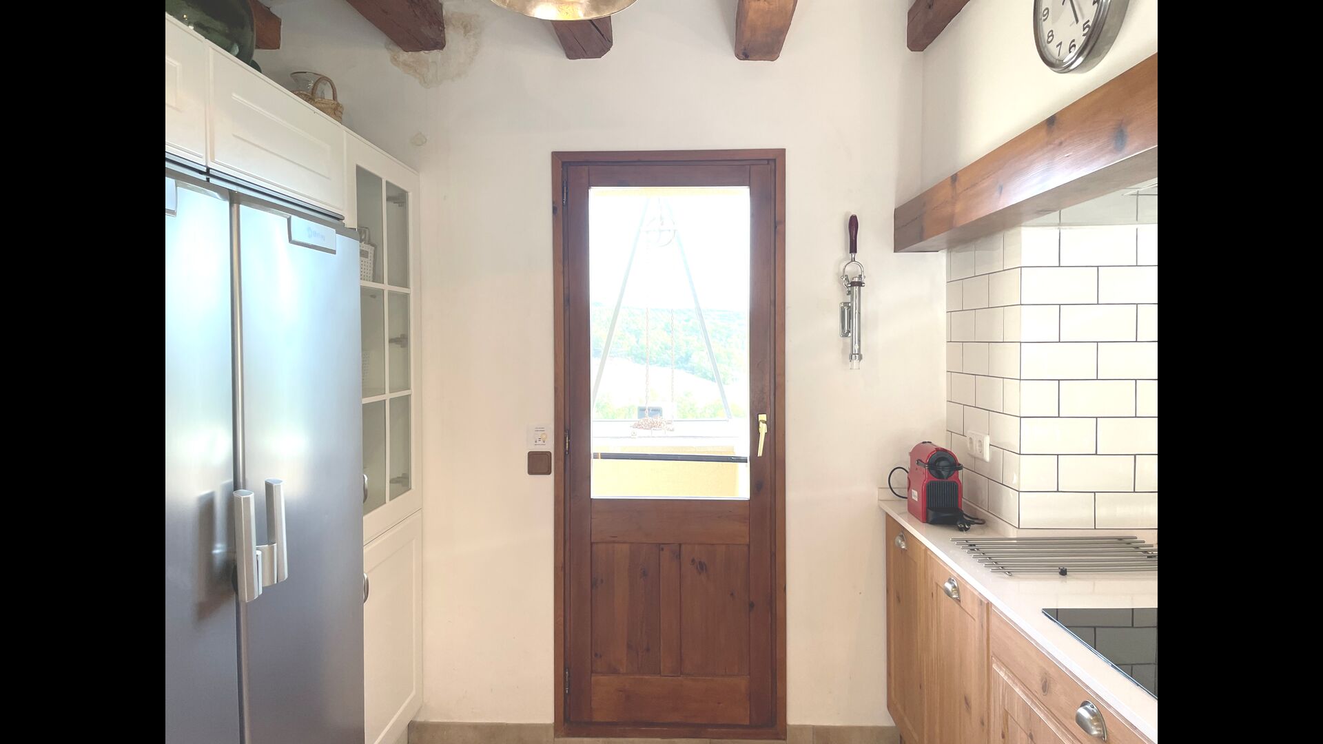On the ground plan there is a lovely double room with a double bed, which has direct access to the garden and a nice bathroom ensuite. There is also a toilet, a living room with a mini shop, where you can buy beer, coffee and delicious local products. As you walk up the stairs to the 1st floor you will walk into the very modern kitchen with white corian countertops, large fridge, freezer, oven, microwave, kettle – to say it short: everything a kitchen needs. From the kitchen there is even an exit to a small balcony where your morning coffee can be enjoyed with the stunning view of the Catalan nature.