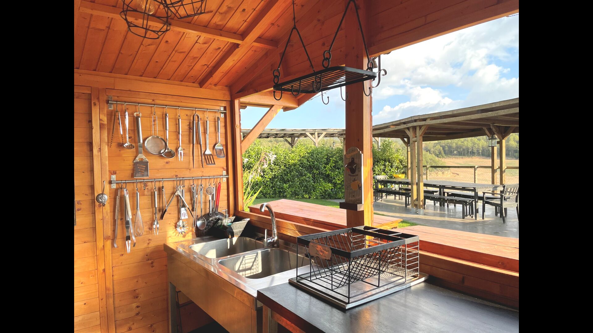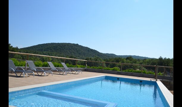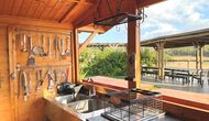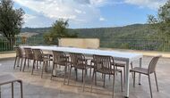 The natural center for your holiday is the combined terrace- and pool area, situated to benefit from the splendid view. Here, you will find the fenced pool with Roman stairs, low children's section and the unique, large, covered chill-out area. The covered chill-out area contains both a long dining table and a modern outdoor kitchen.