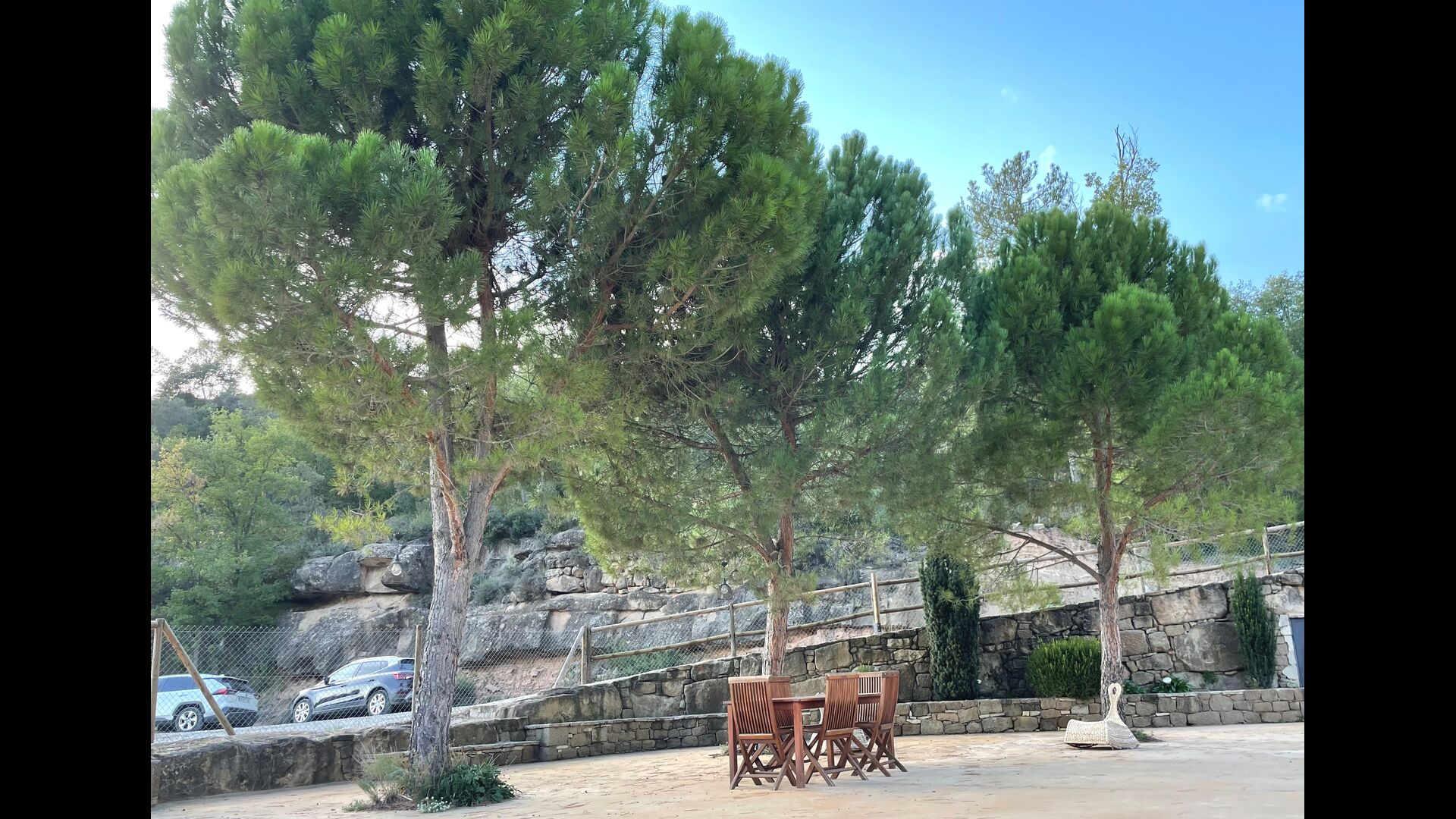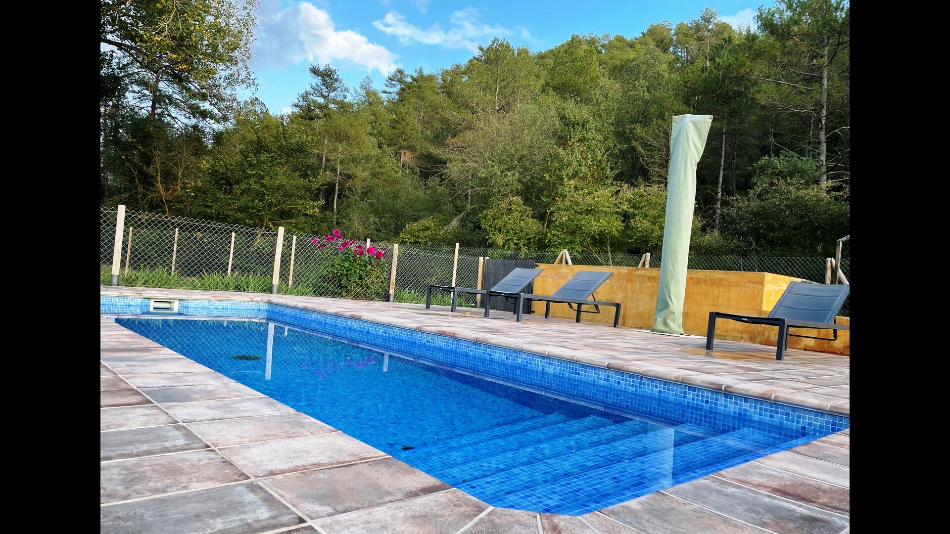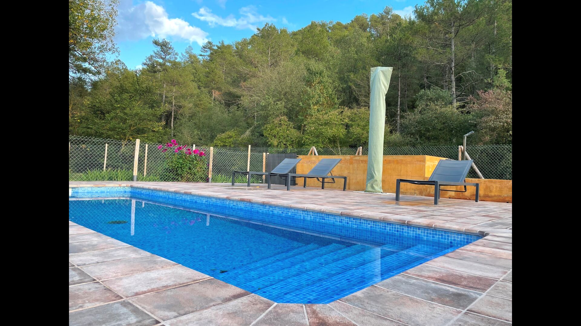 In the middle of the garden, you find the fenced pool area, where you can relax at the sun loungers or have dip to cool down in the warm Catalan summer. As the swimming pool has roman steps, it is also ideal if you have small children, so they can enter the water in their own pace and play.