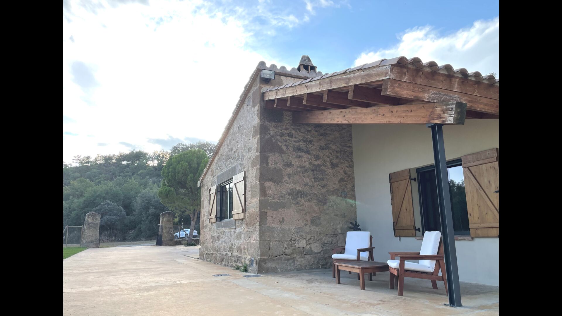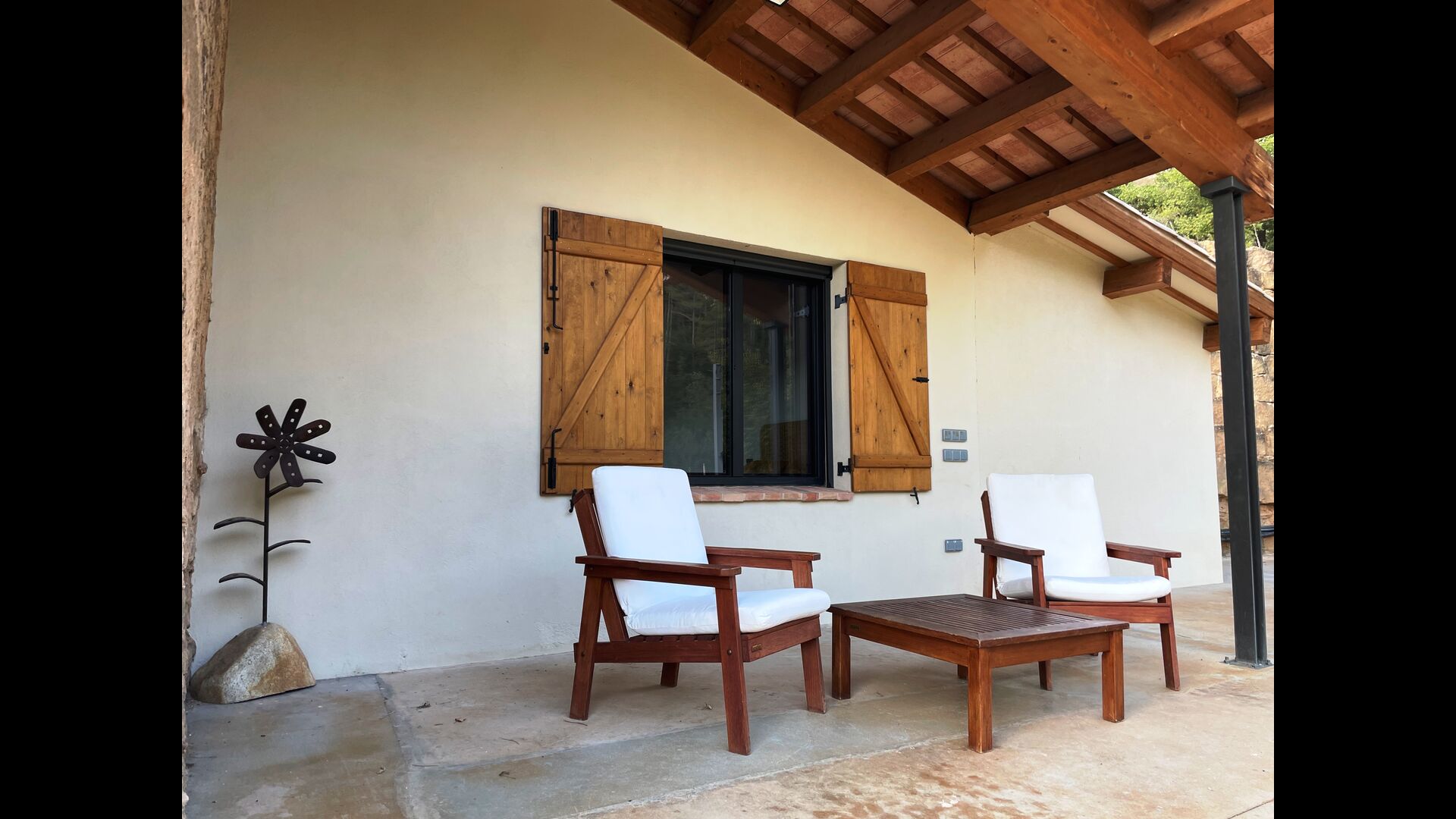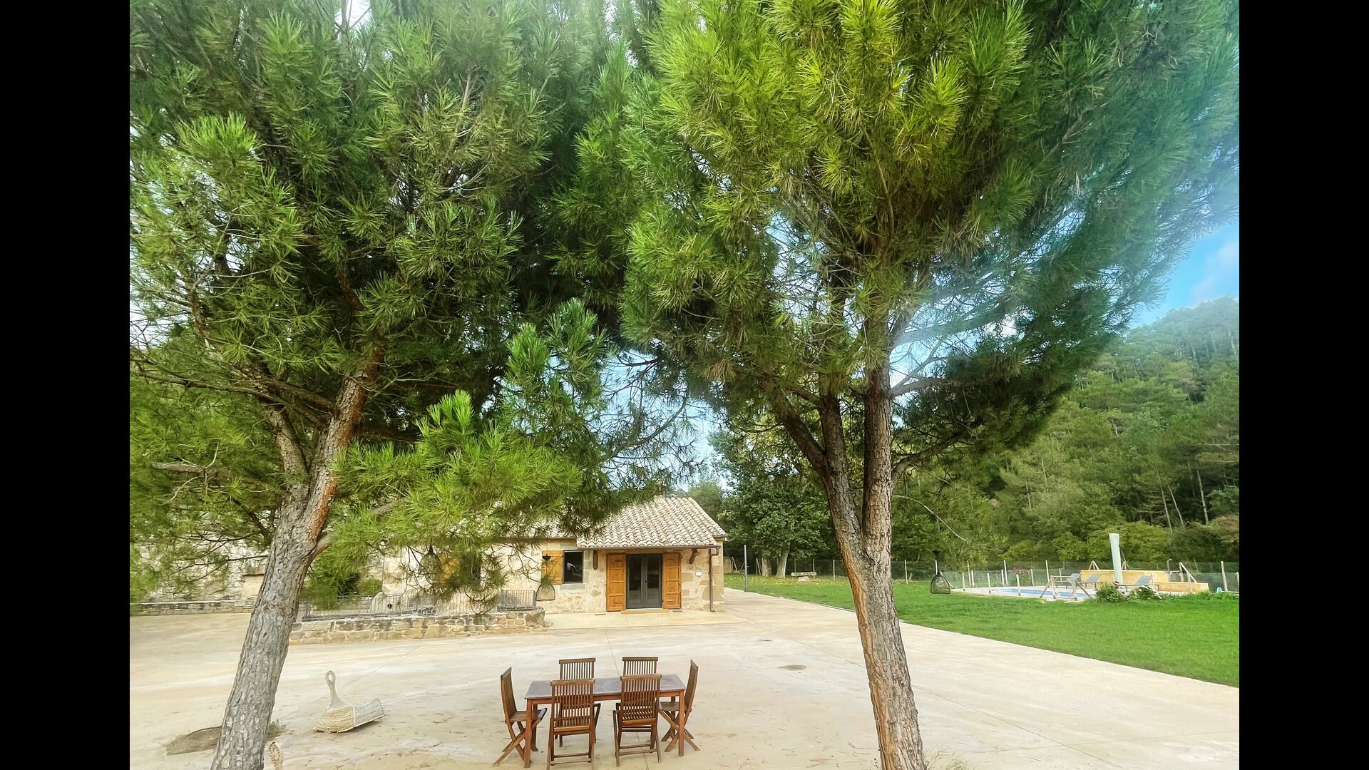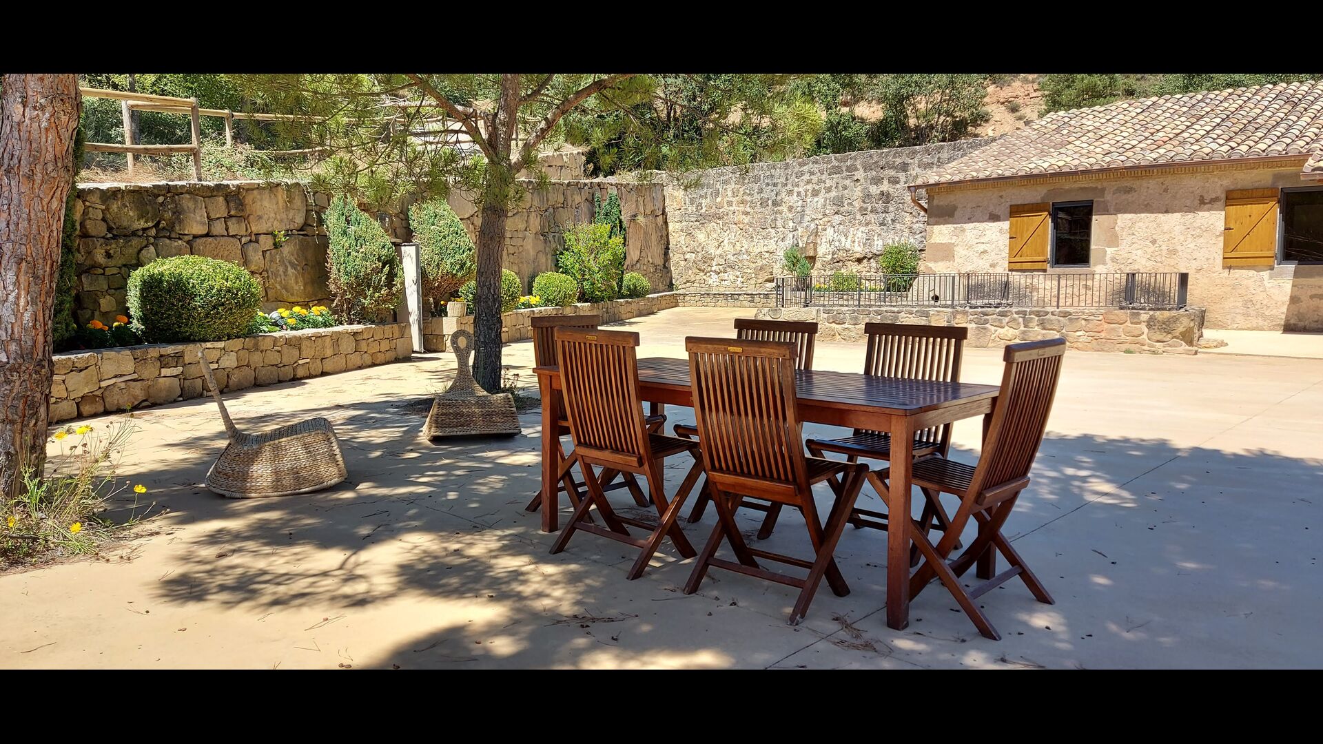 Outside the house, you will have the garden table, which you can easily move, so you can basically have your meals where you prefer. It could be in the shade under one of the trees, by the swimming pool or next to the barbecue, if you like a nice barbecue dinner. There are also some arm chairs, so you can relax with a book.