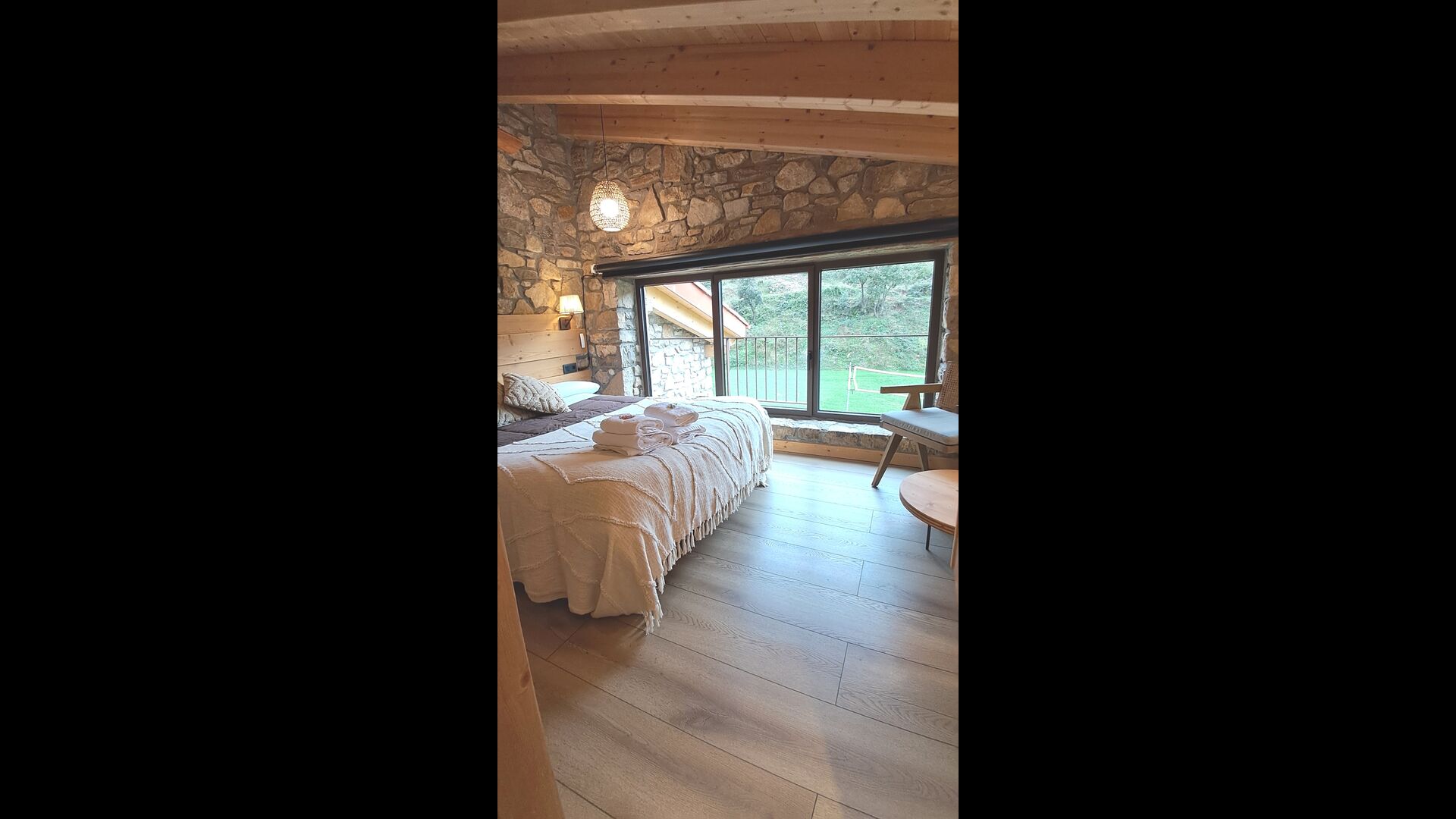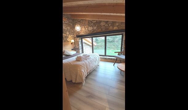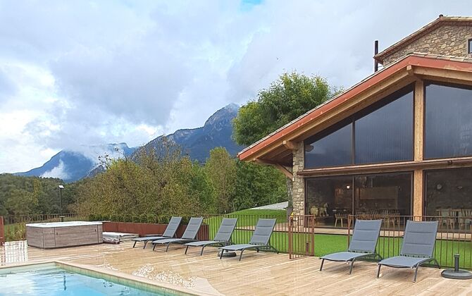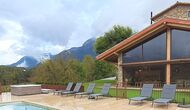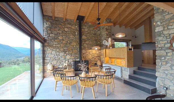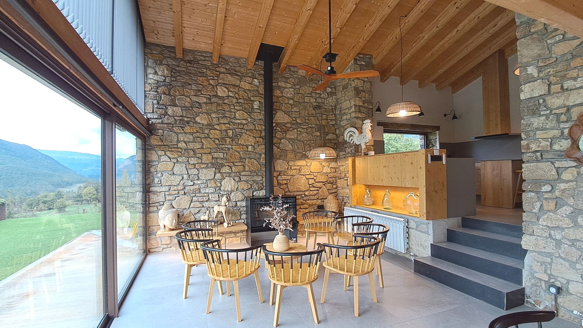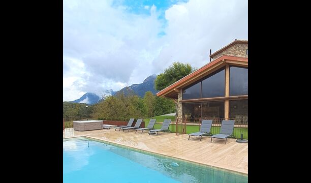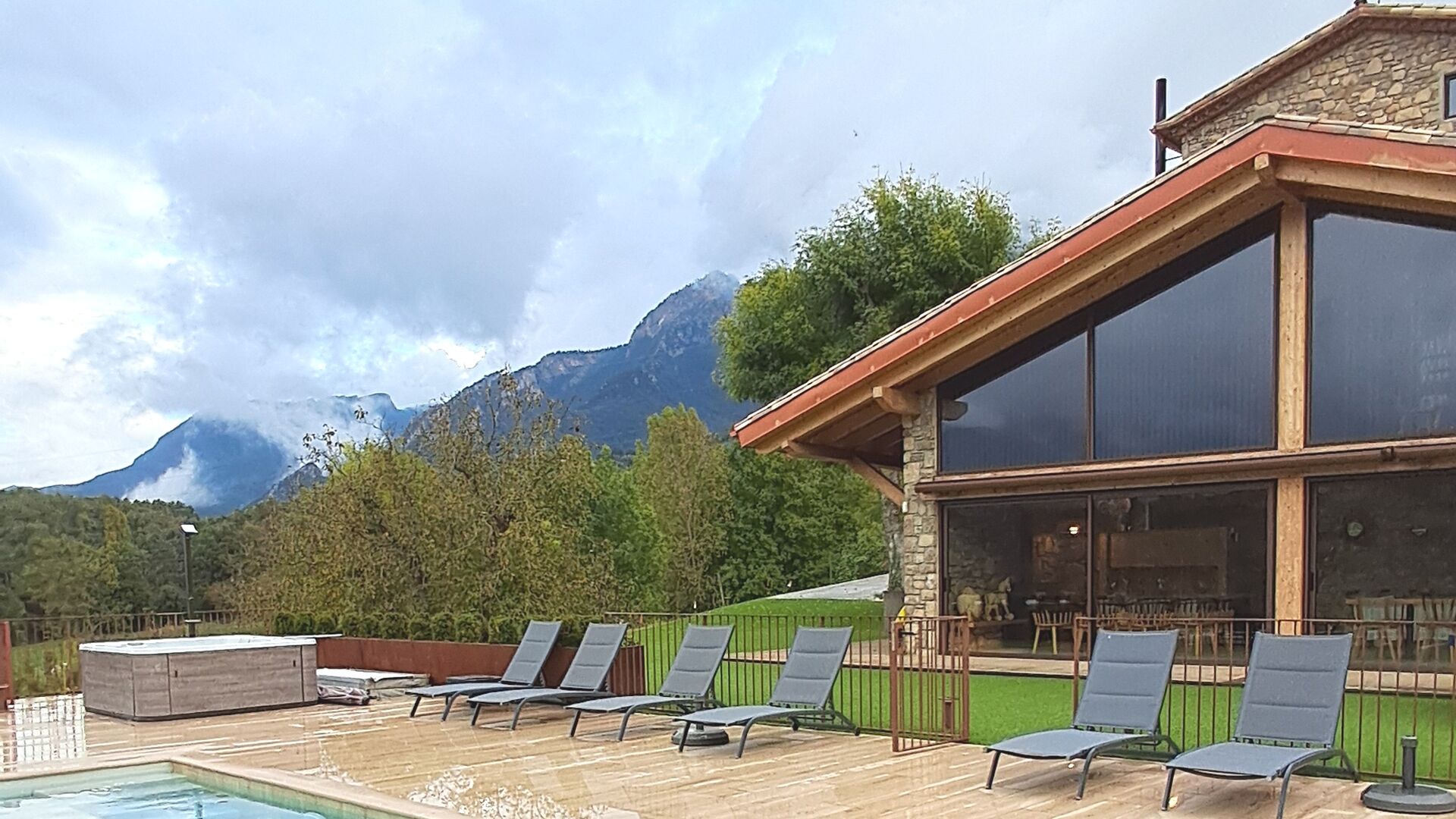 The private swimming pool and spacious garden offer unobstructed mountain views, while the barbecue area and sunlit terraces make it easy to savor every moment in the fresh mountain air. In winter, the experience becomes magical with the outdoor jacuzzi, where up to eight guests can relax while admiring the snow-covered peaks of the Pyrenees.