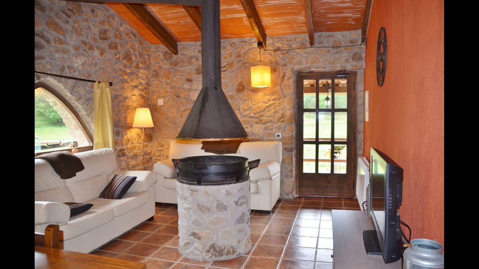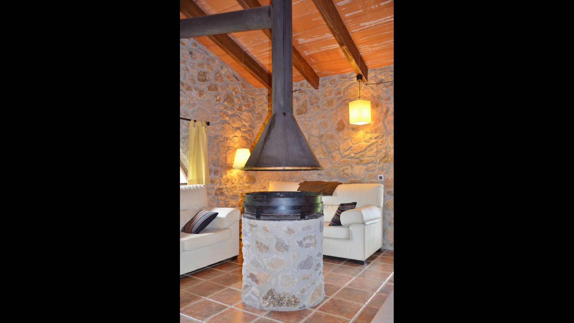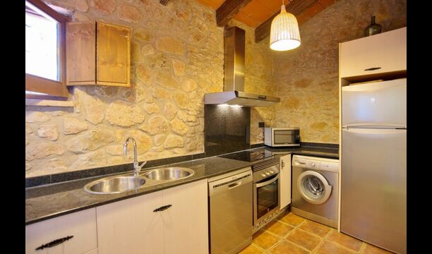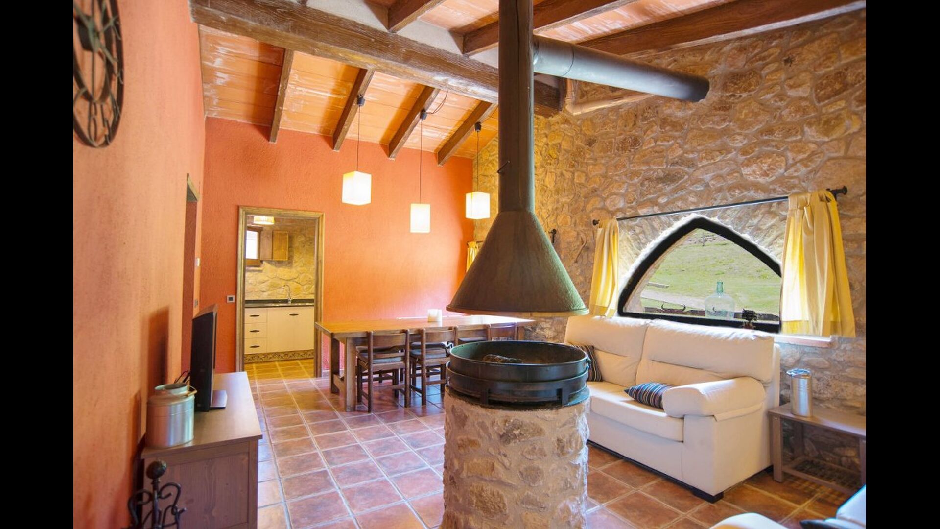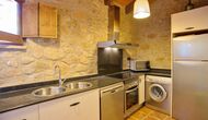 This holiday home for 6 persons, Can de Pirineus - Noguer 6 + 3P, has a size of 100 m2 and is perfect for a family. When you enter the house, you meet the common room: In one of the ends, there are two comfortable sofas and a TV with a DVD-player. In the middle of the living room, there is, very uniquely, a pretty fireplace. The dining table is connected to the sofa corner. The high and beamed ceiling and the stone walls create a cozy, rural atmosphere.