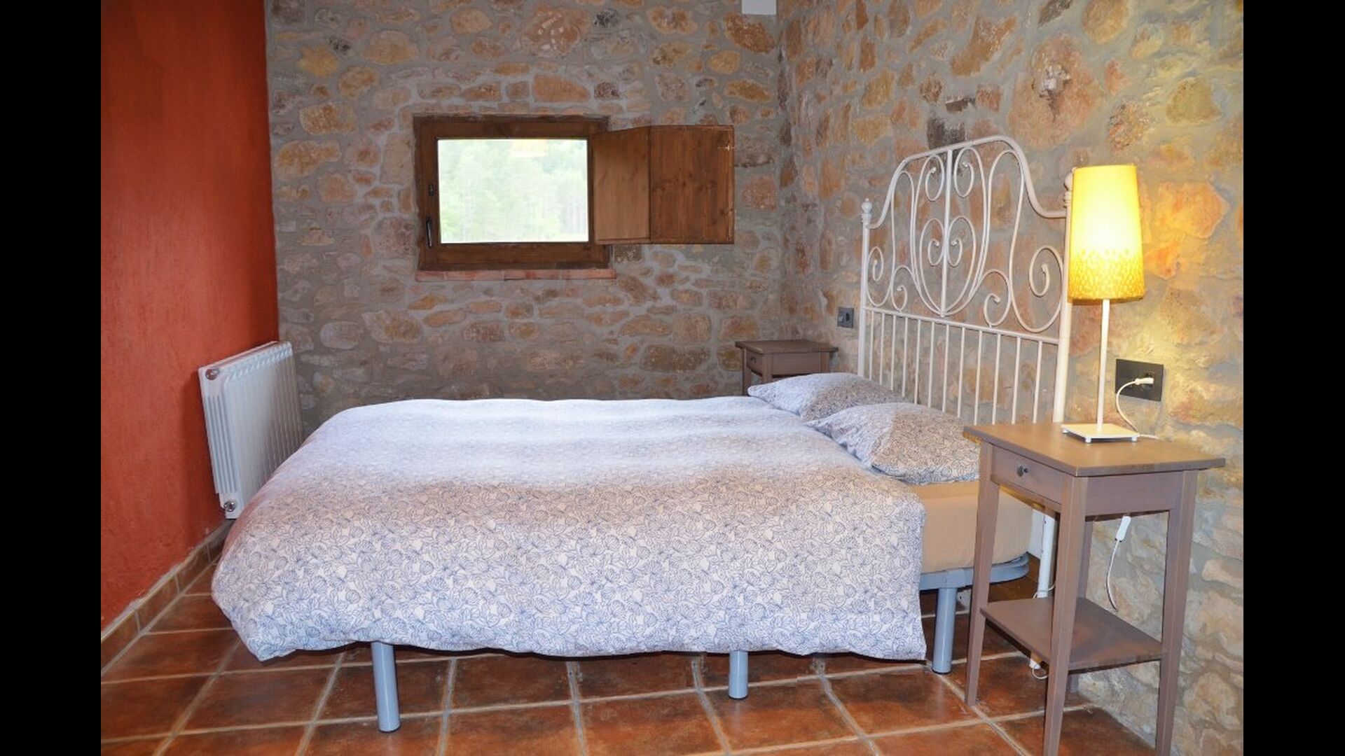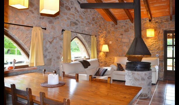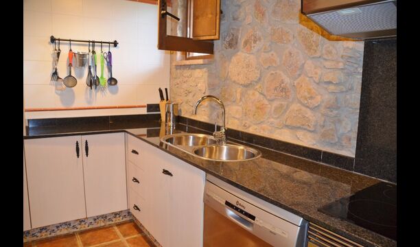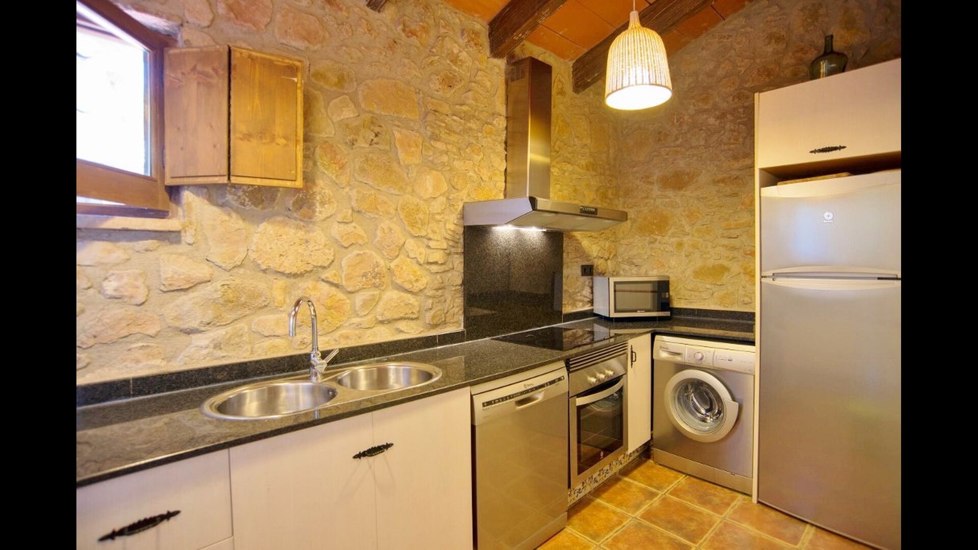 This holiday home for 6 persons, Can de Pirineus - Noguer 6 + 3P, has a size of 100 m2 and is perfect for a family. When you enter the house, you meet the common room: In one of the ends, there are two comfortable sofas and a TV with a DVD-player. In the middle of the living room, there is, very uniquely, a pretty fireplace. The dining table is connected to the sofa corner. The high and beamed ceiling and the stone walls create a cozy, rural atmosphere.