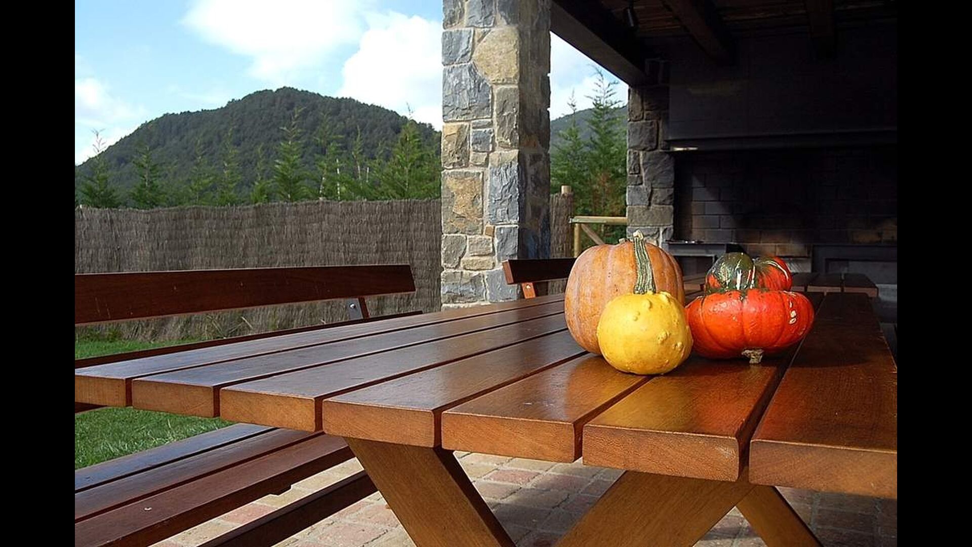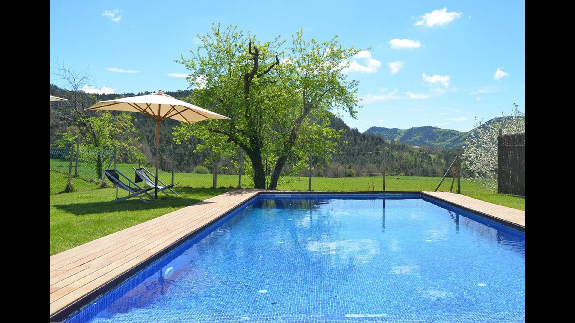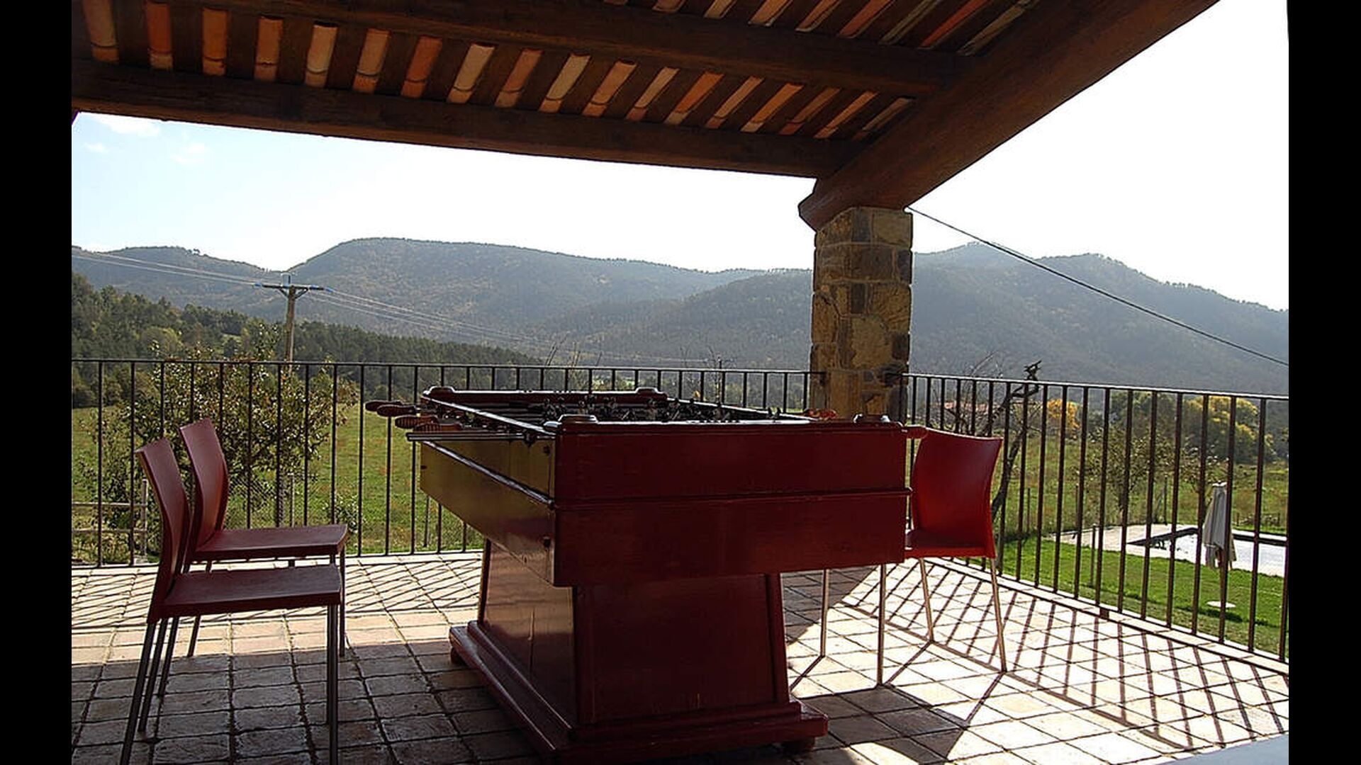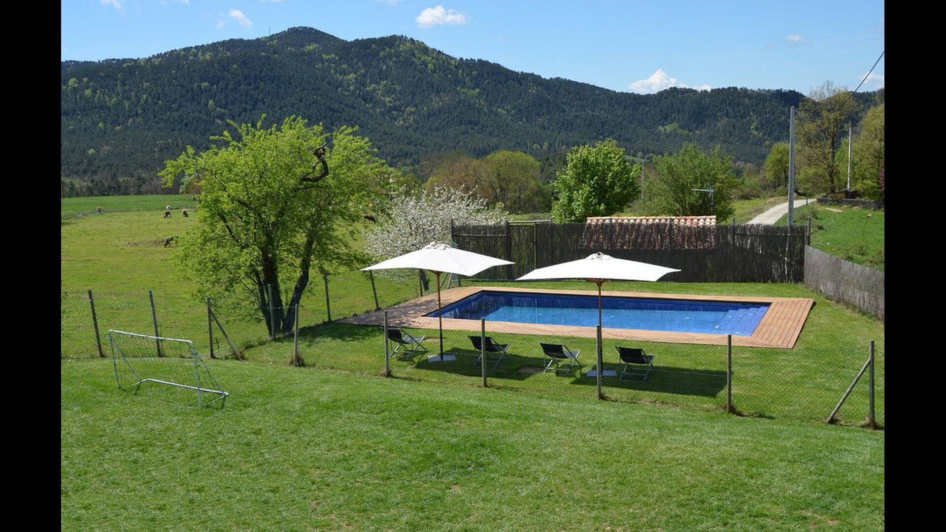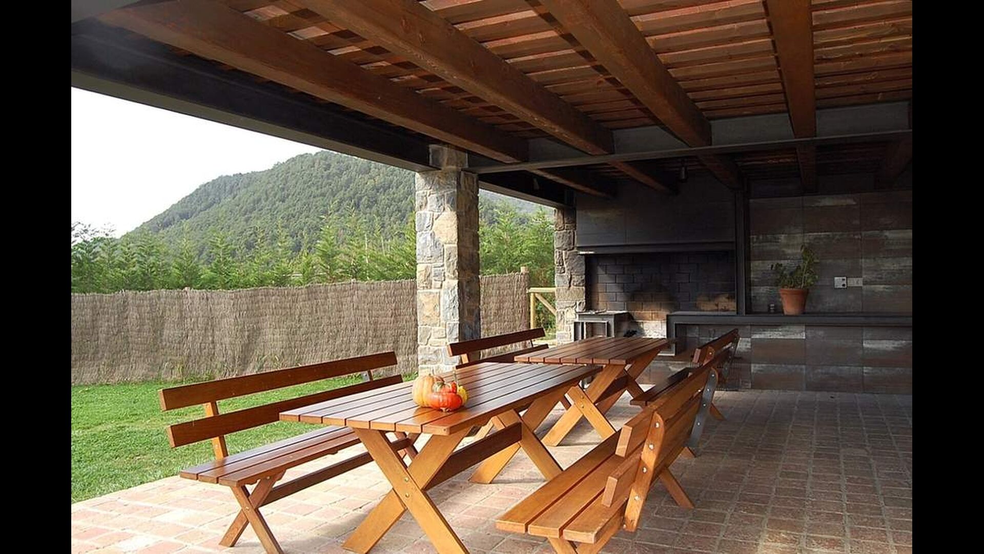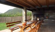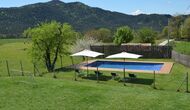 Outside, Casa Ferrera opens onto a covered terrace with outdoor dining, overlooking extensive lawns that lead to a private, fenced swimming pool. Surrounded by open countryside and mountain views, the outdoor spaces are perfect for relaxing, dining al fresco, or watching children play safely.