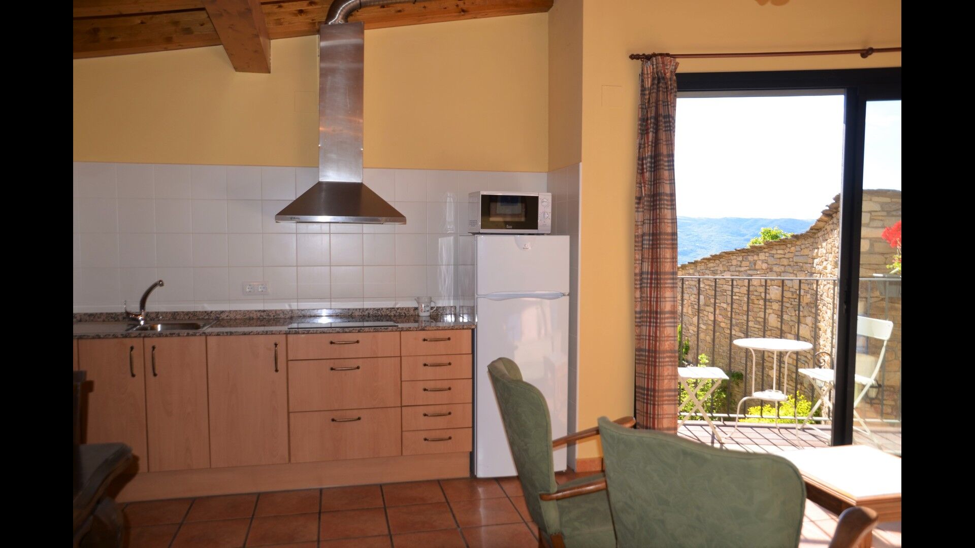 Can Soledad-Forn 4+2P is one of the three smaller apartments. The apartment has two bedrooms - one with a double bed and one with twin beds. The apartments also have a living room with French balcony from where you can enjoy the fantastic view. Furthermore, the living room is equipped with TV and DVD player. The well-equipped kitchen is connected to the cozy living room. There’s also a bathroom with shower. The Wi-Fi covers the entire property and all apartments.