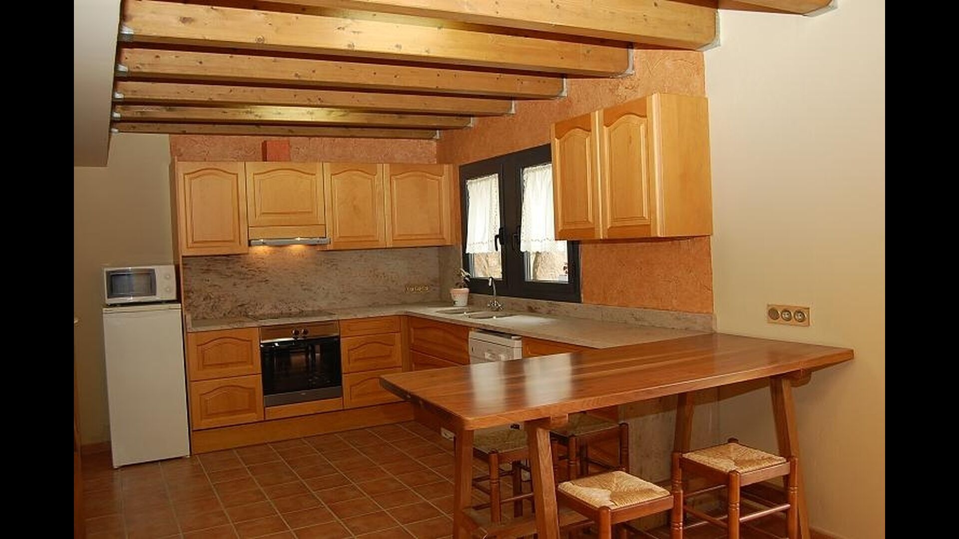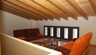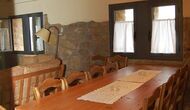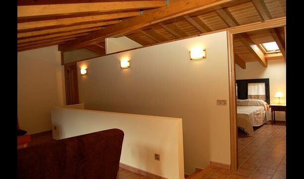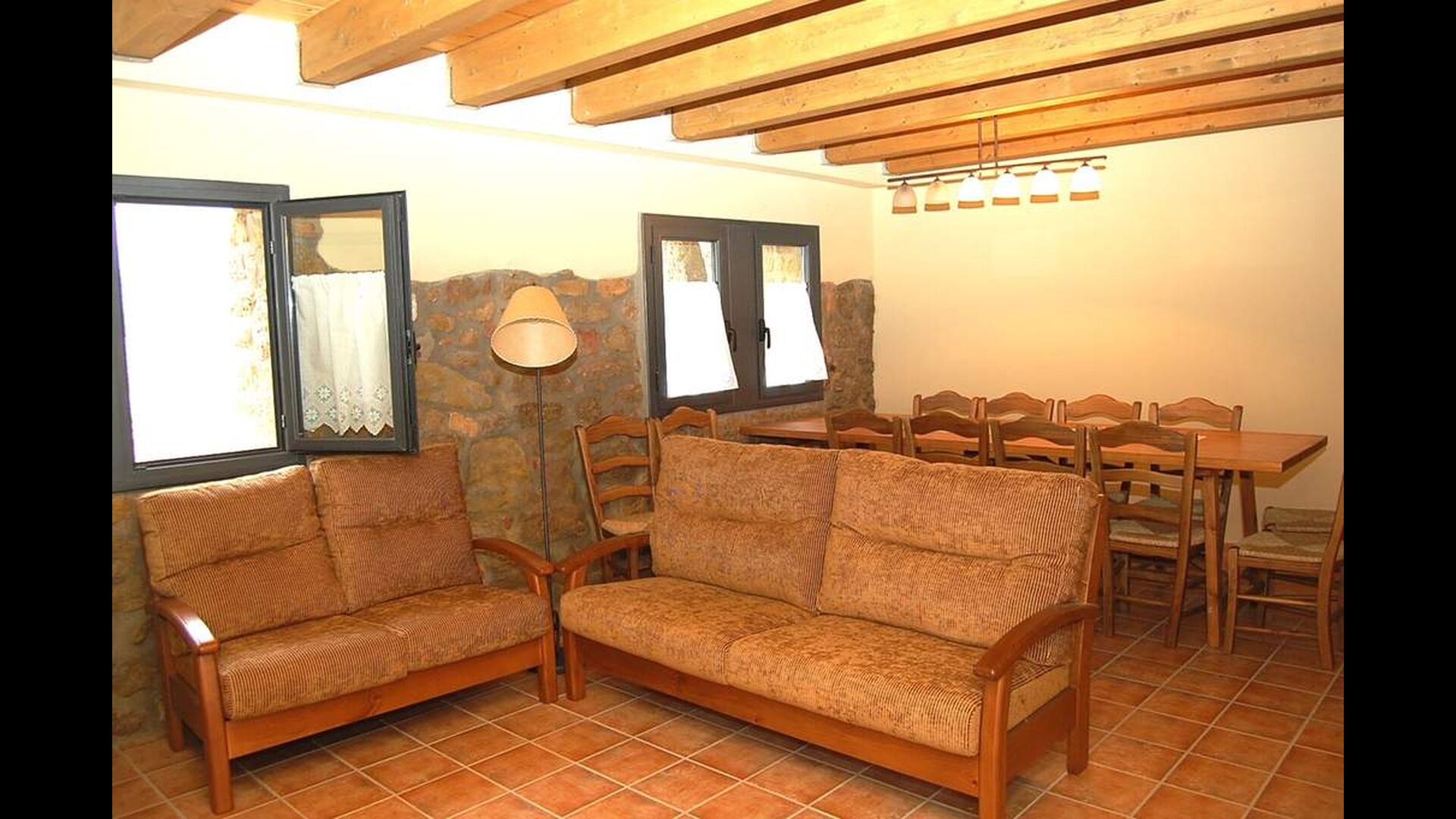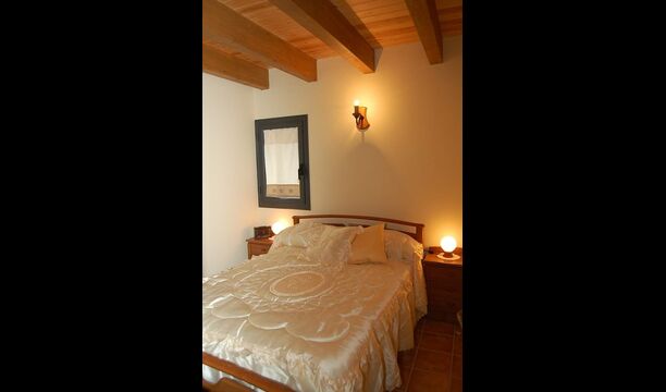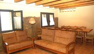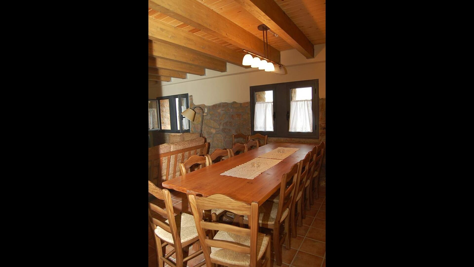 The house has three floors and the interior of the house is very cozy and has a traditional Catalan style with limestone walls and wooden beams in the ceilings. It provides a very cozy feeling and creates a relaxed atmosphere. The common rooms can be found on the lower floor of the house including a very well-equipped kitchen, dining room with a large table and a cozy sofa corner with comfortable couches and a TV.