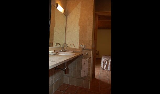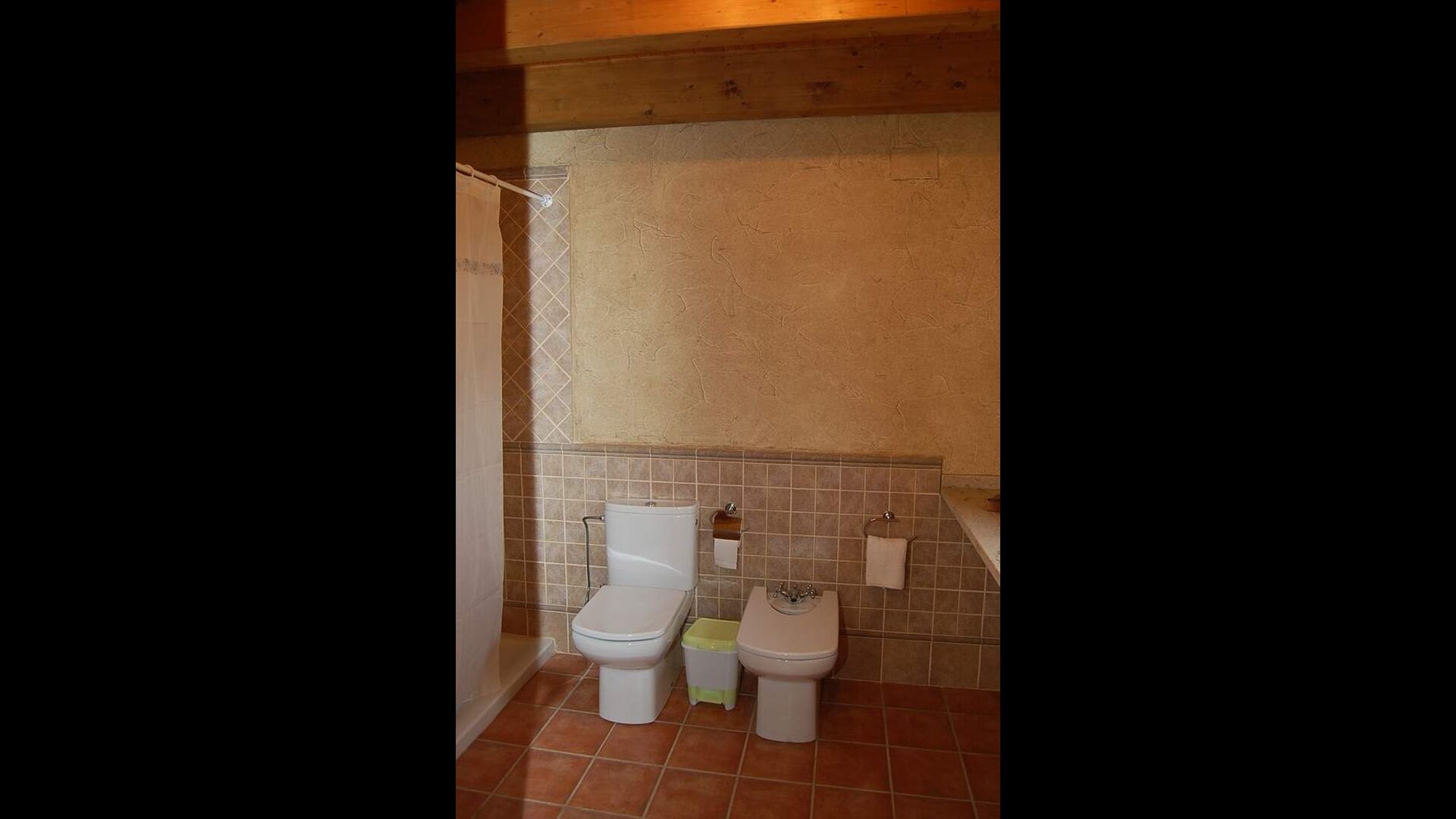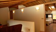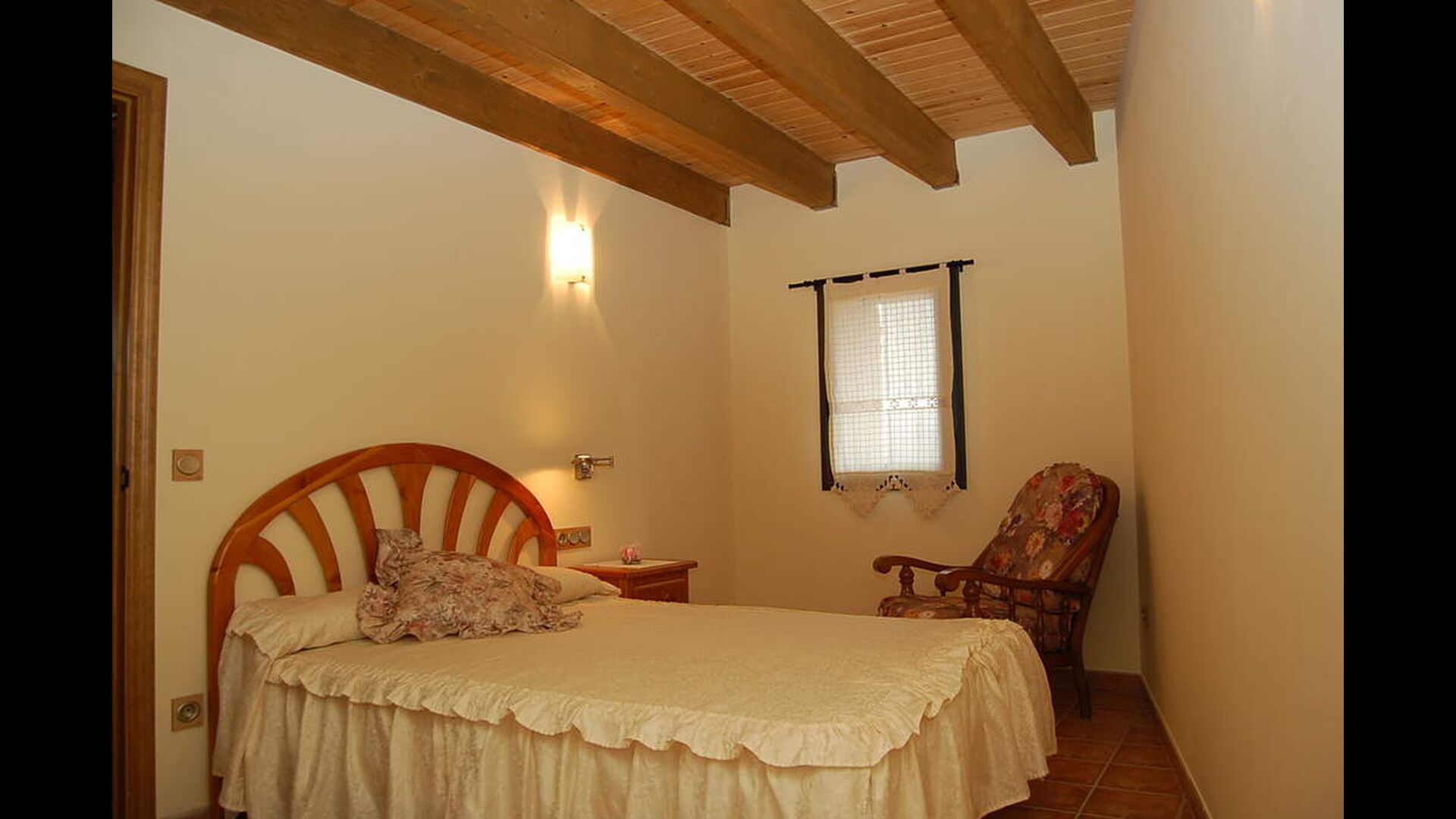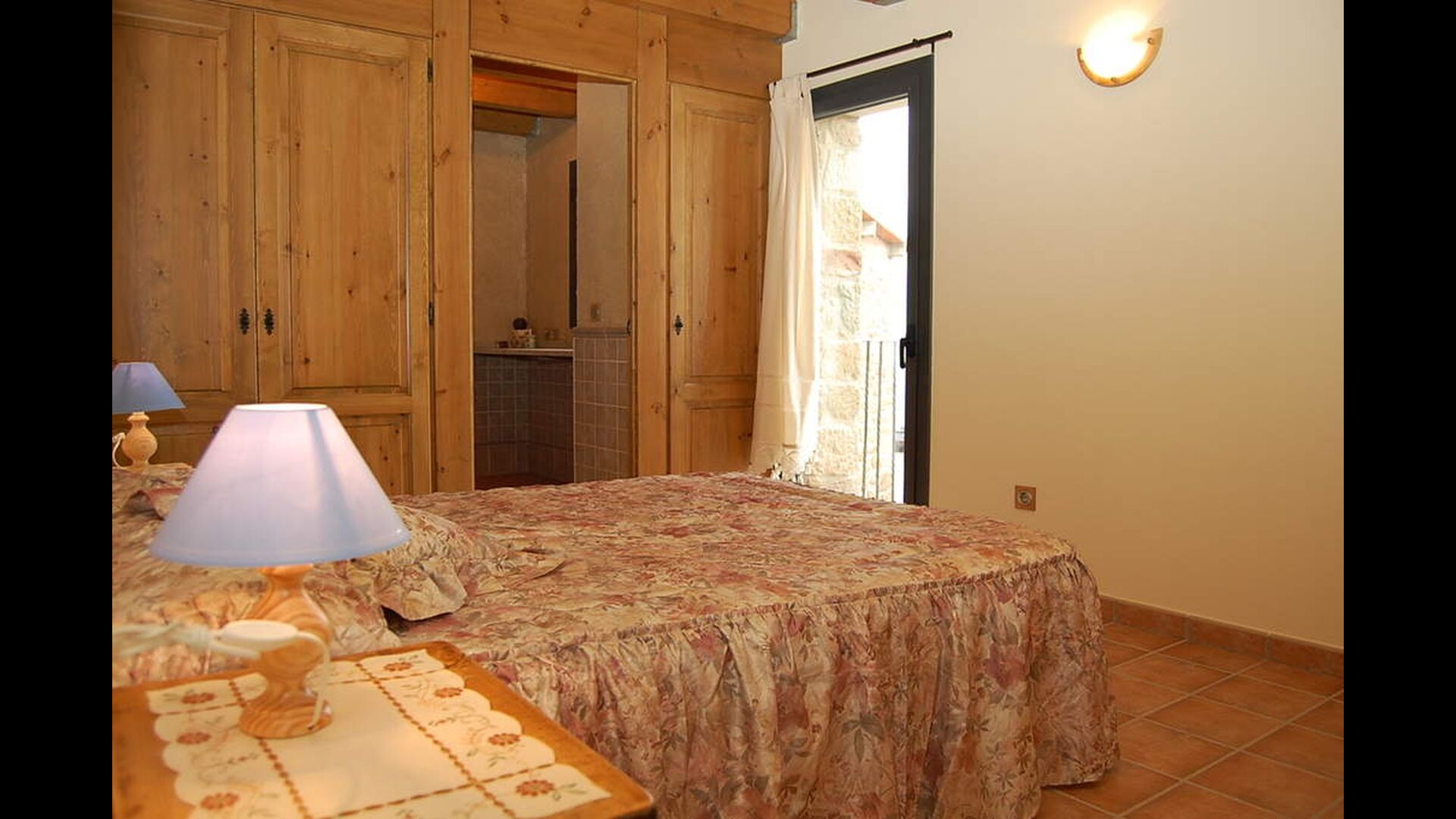 The house has three floors and the interior of the house is very cozy and has a traditional Catalan style with limestone walls and wooden beams in the ceilings. It provides a very cozy feeling and creates a relaxed atmosphere. The common rooms can be found on the lower floor of the house including a very well-equipped kitchen, dining room with a large table and a cozy sofa corner with comfortable couches and a TV.