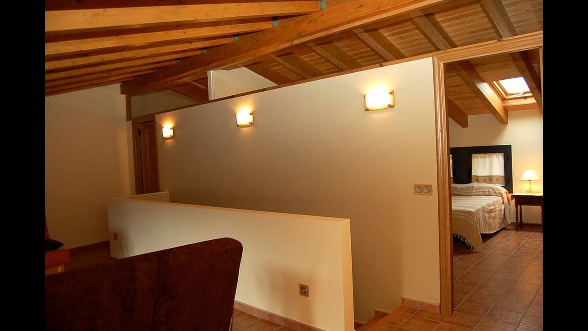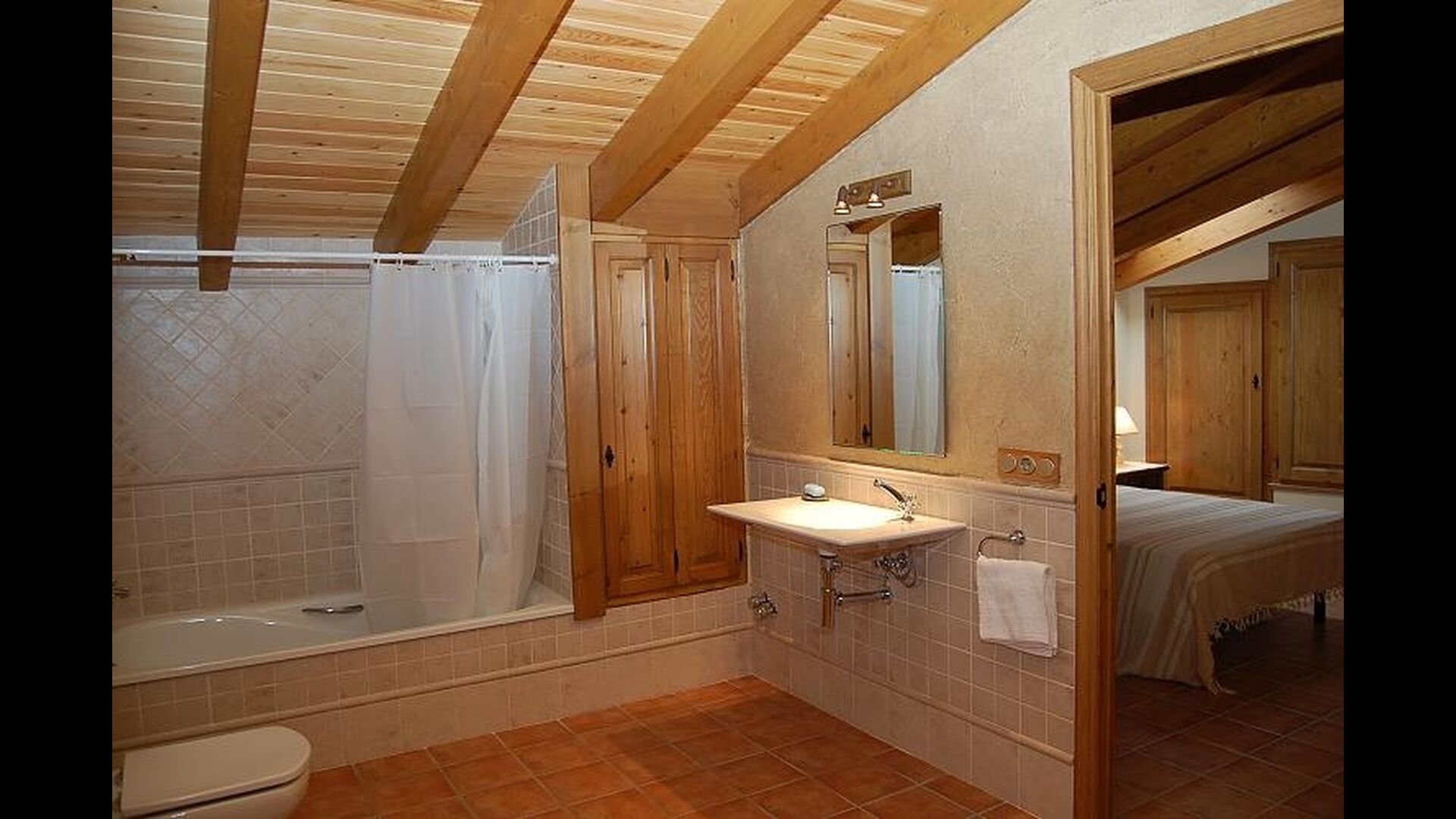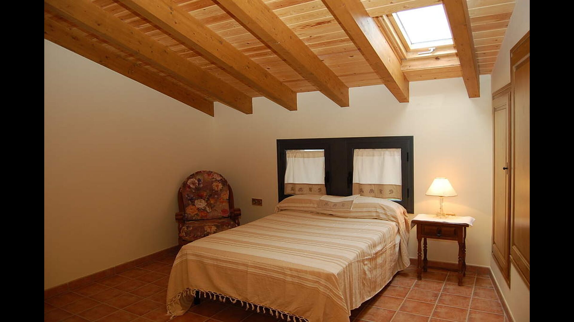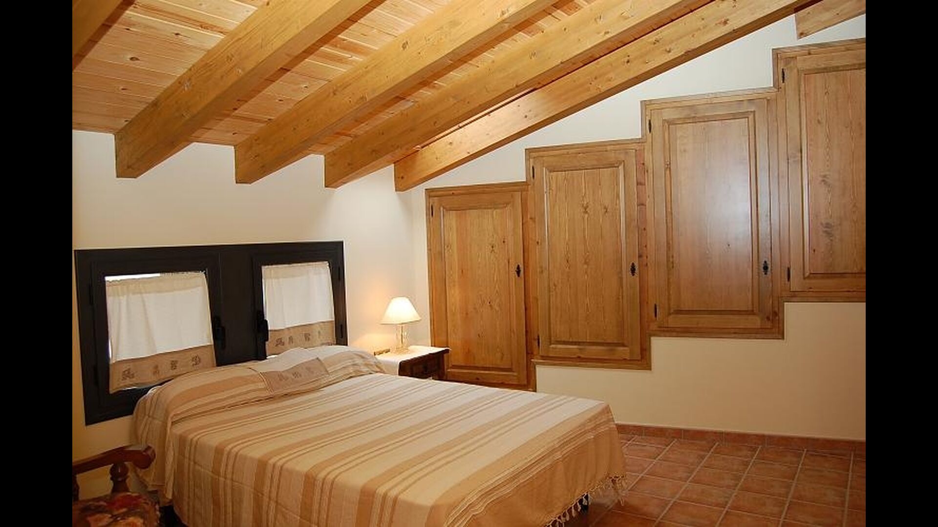 The house has three floors and the interior of the house is very cozy and has a traditional Catalan style with limestone walls and wooden beams in the ceilings. It provides a very cozy feeling and creates a relaxed atmosphere. The common rooms can be found on the lower floor of the house including a very well-equipped kitchen, dining room with a large table and a cozy sofa corner with comfortable couches and a TV.