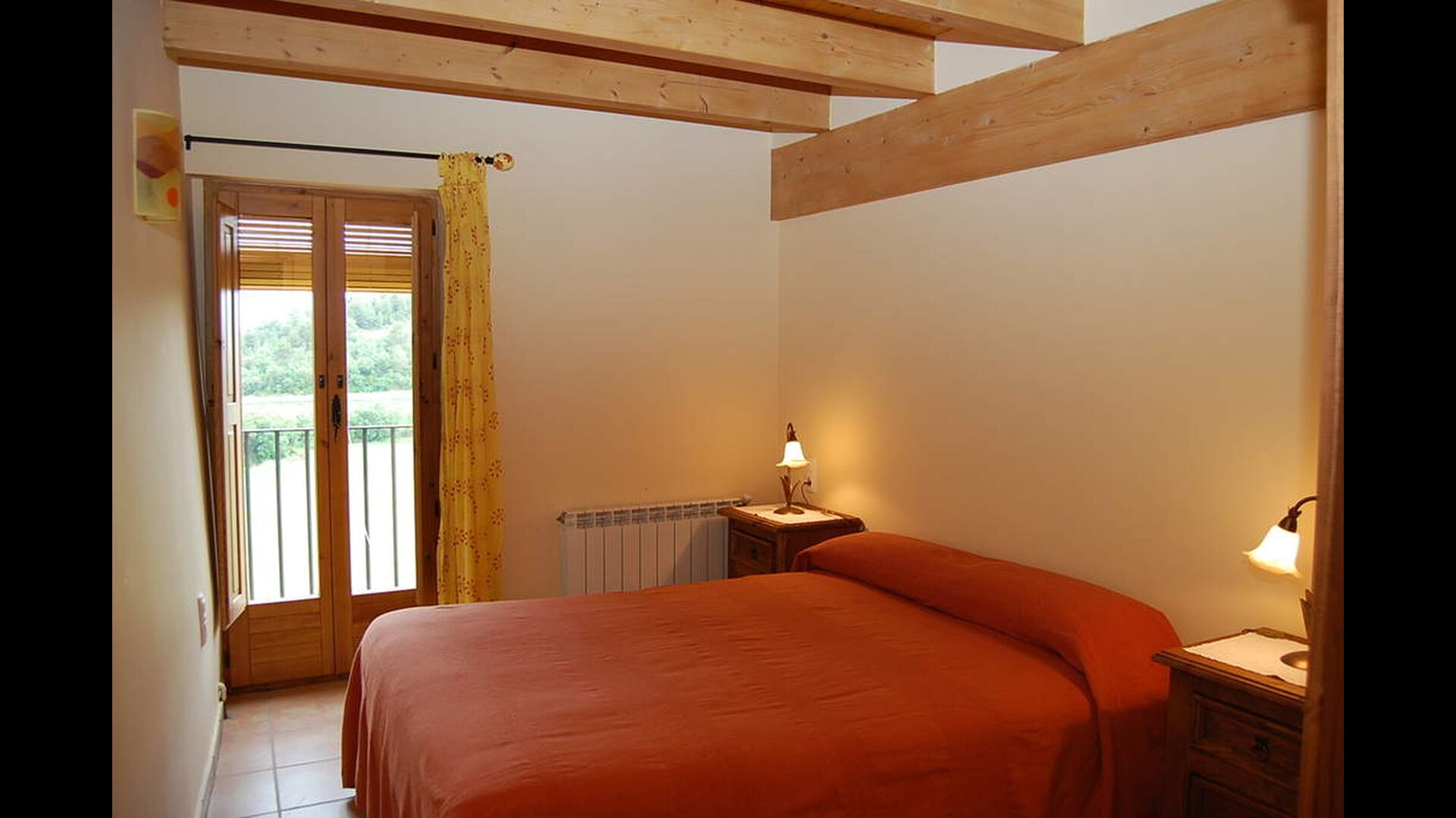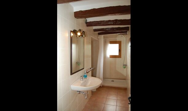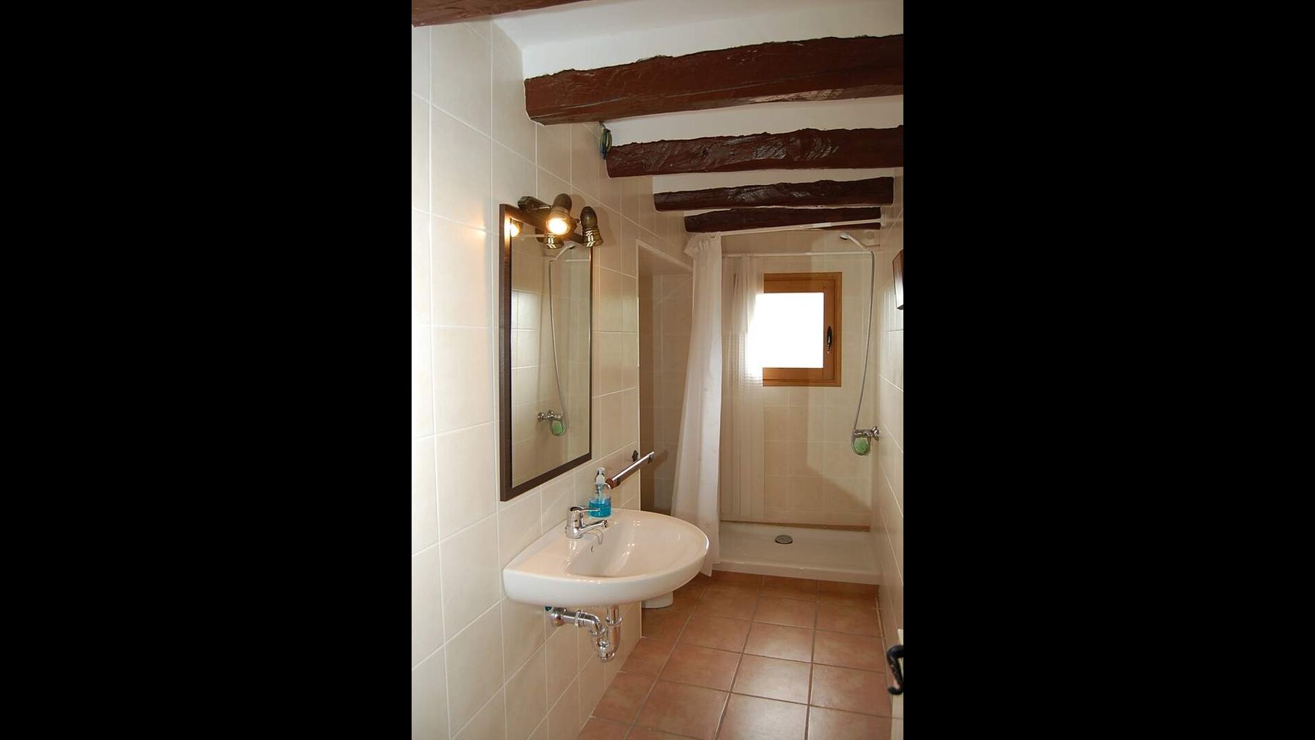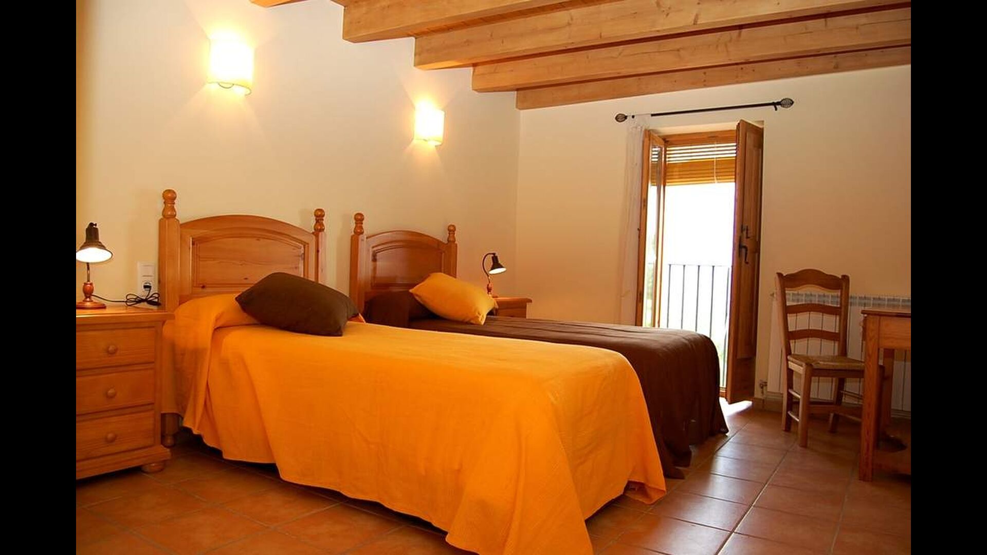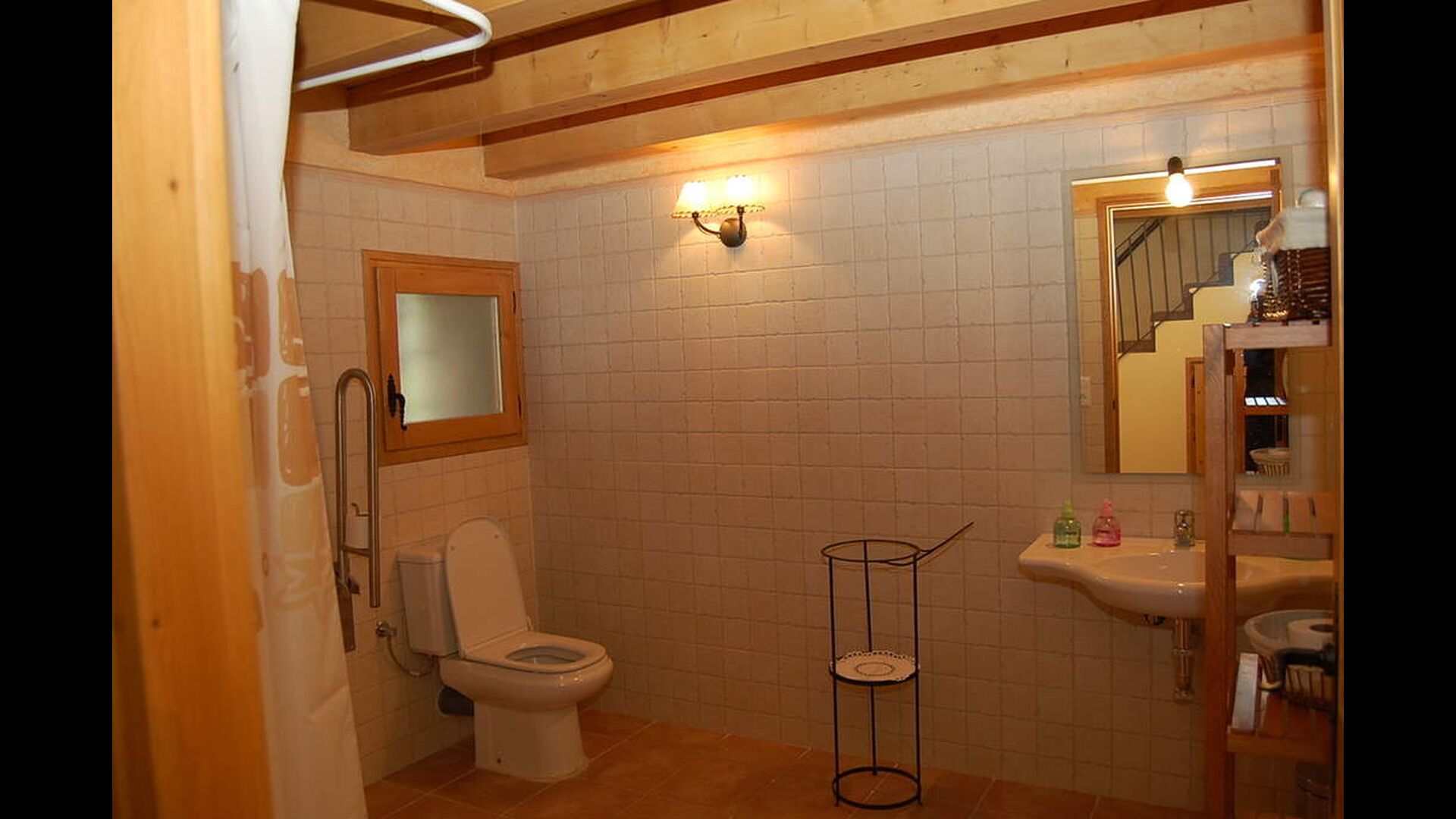 From this floor you have access to two different areas. One of these takes us to the rooms which traditionally were used to have the animals and nowadays are used for leaving our mountain bikes. From here you can go straight to the swimming pool and to the outside courtyard. The other takes us to the first floor where we can find five big, comfortable double bedrooms and three fully equipped toilets.
